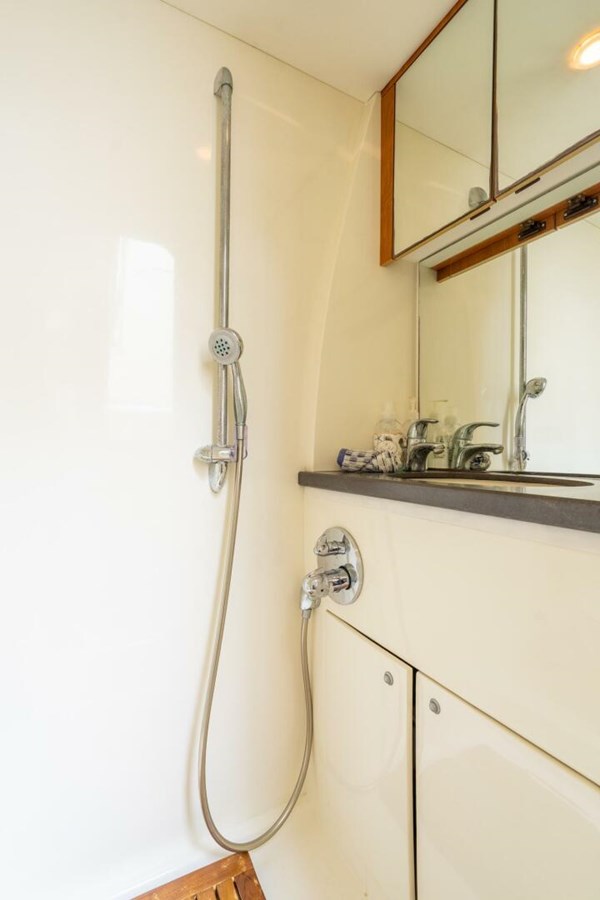 Enter the interior through full width sliding companionway doors to the full panoramic view salon. Forward is the dinette to port and fully equipped galley to starboard. Forward is the helm station to starboard with full arrays of engine monitoring gauges and electronic navigation equipment. Forward and down are the guest staterooms with ensuite head/showers. Master stateroom and ensuite head/shower is aft. Indirect and courtesy lighting throughout the interior and exterior. Vessel is air conditioned throughout. She also has DirecTV satellite in all staterooms, DVR in the salon & master with KVH at Sea dish antenna system.