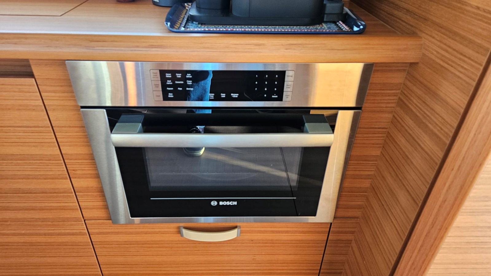 Induction stove with two burners 110V (boils water faster than gas) Electric oven/microwave 110V in the galley Full size upright refrigerator with separate freezer unit Kerrock counters Stainless steel under-mounted sink Fold up rear window with leaf counter extension to cockpit for serving bar. Tempered mirror glass sliding rear salon door. Hot and cold pressure water