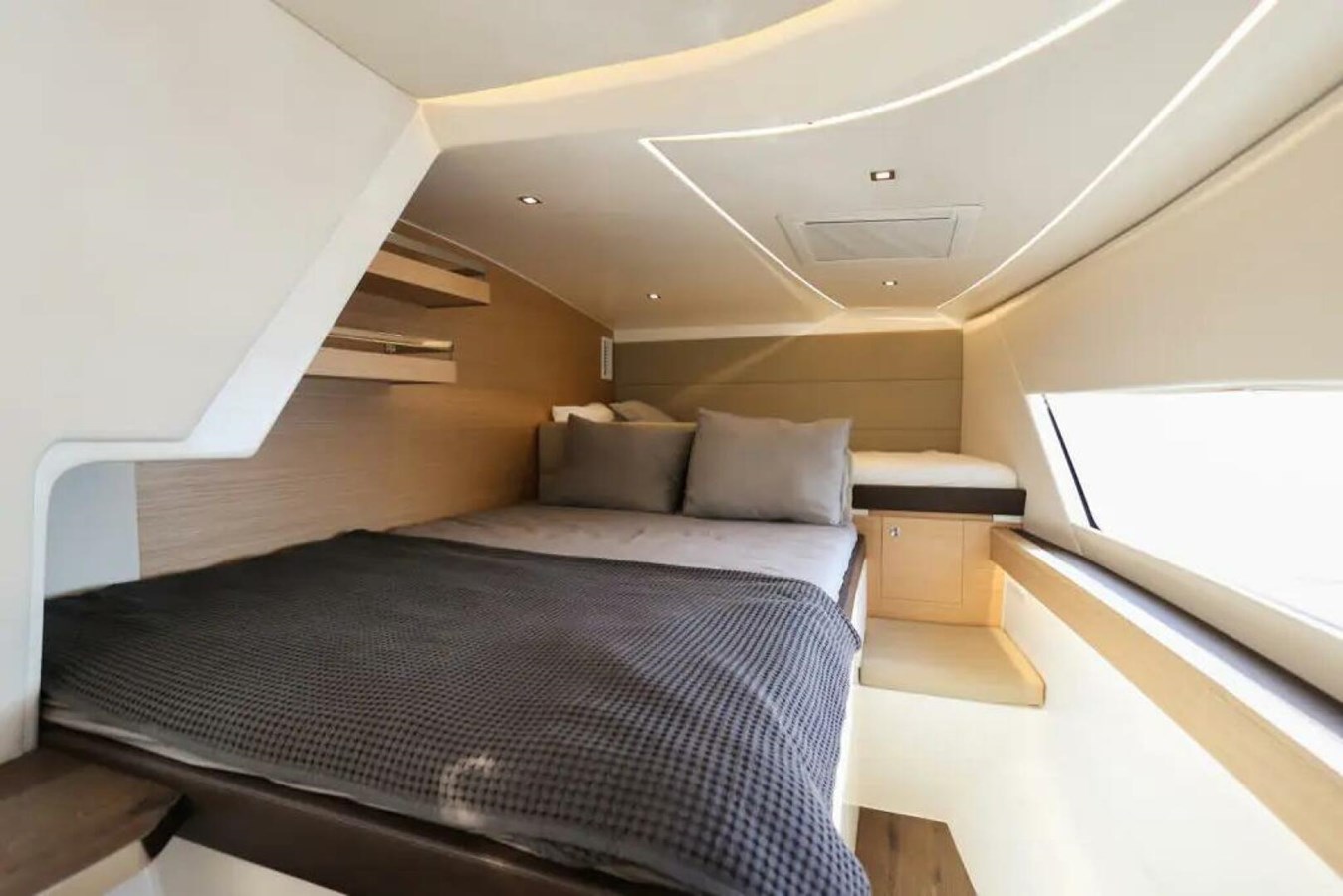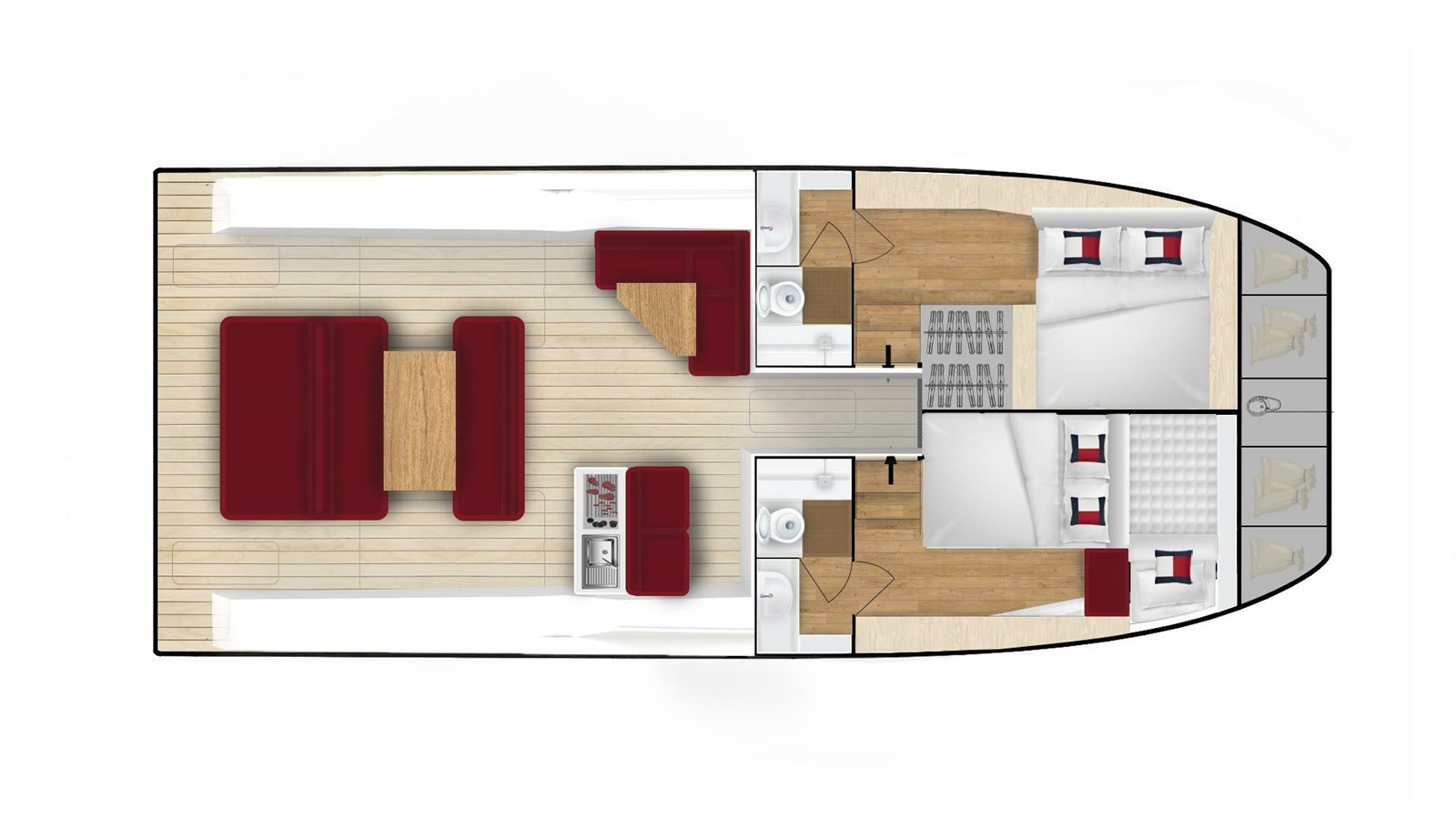 MAKAI redefines the modern power catamaran! Spacious & stable like a much larger yacht yet with the maneuverability and versatility of a smaller boat. Core efficiency is provided by the asymmetric hull design, which enhances existing multihull benefits of unrivalled form stability, beam space and excellent seakeeping. Cruise at 24 knots with a max speed of 35. Foils can be added to further increase performance and fuel efficiency. 2 spacious private cabins with en-suite heads, separate showers and standing headroom throughout. An incredibly spacious cockpit; among the largest in its class. Setting the standard for this boat model and size.