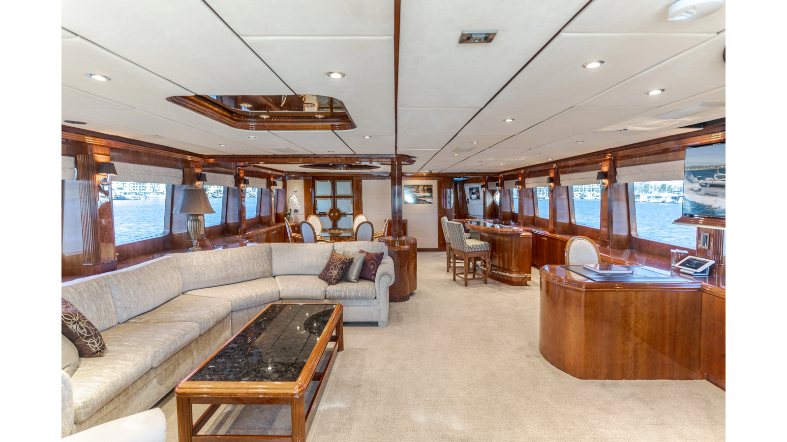 of the salon, with a bar on the starboard side.