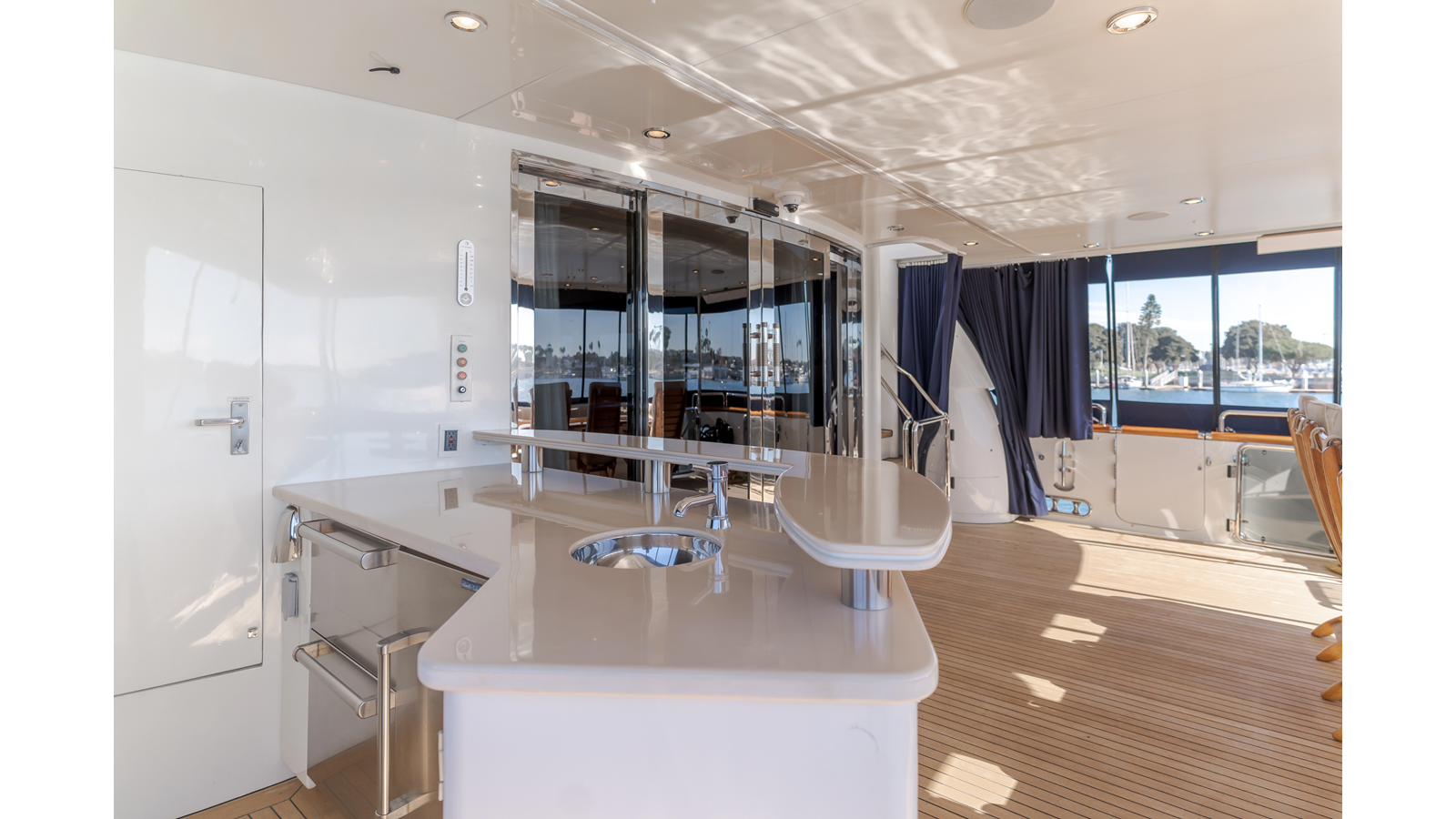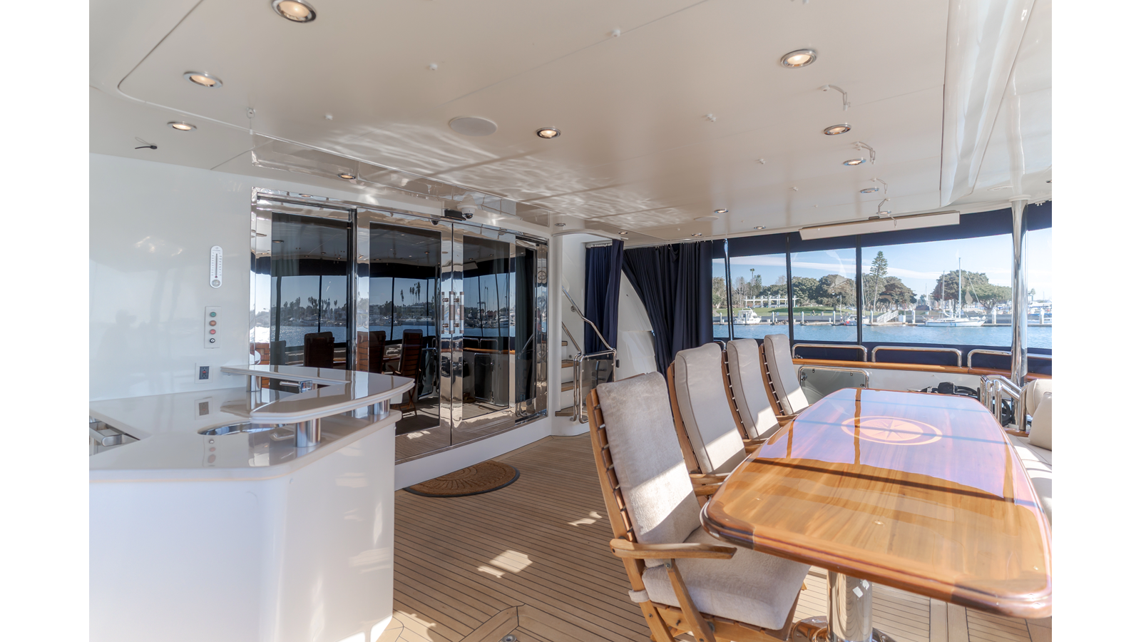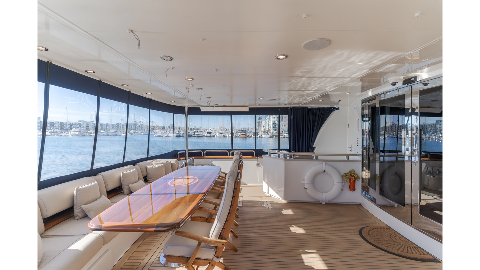 - Comfortable aft deck with alfresco dining for eight to ten