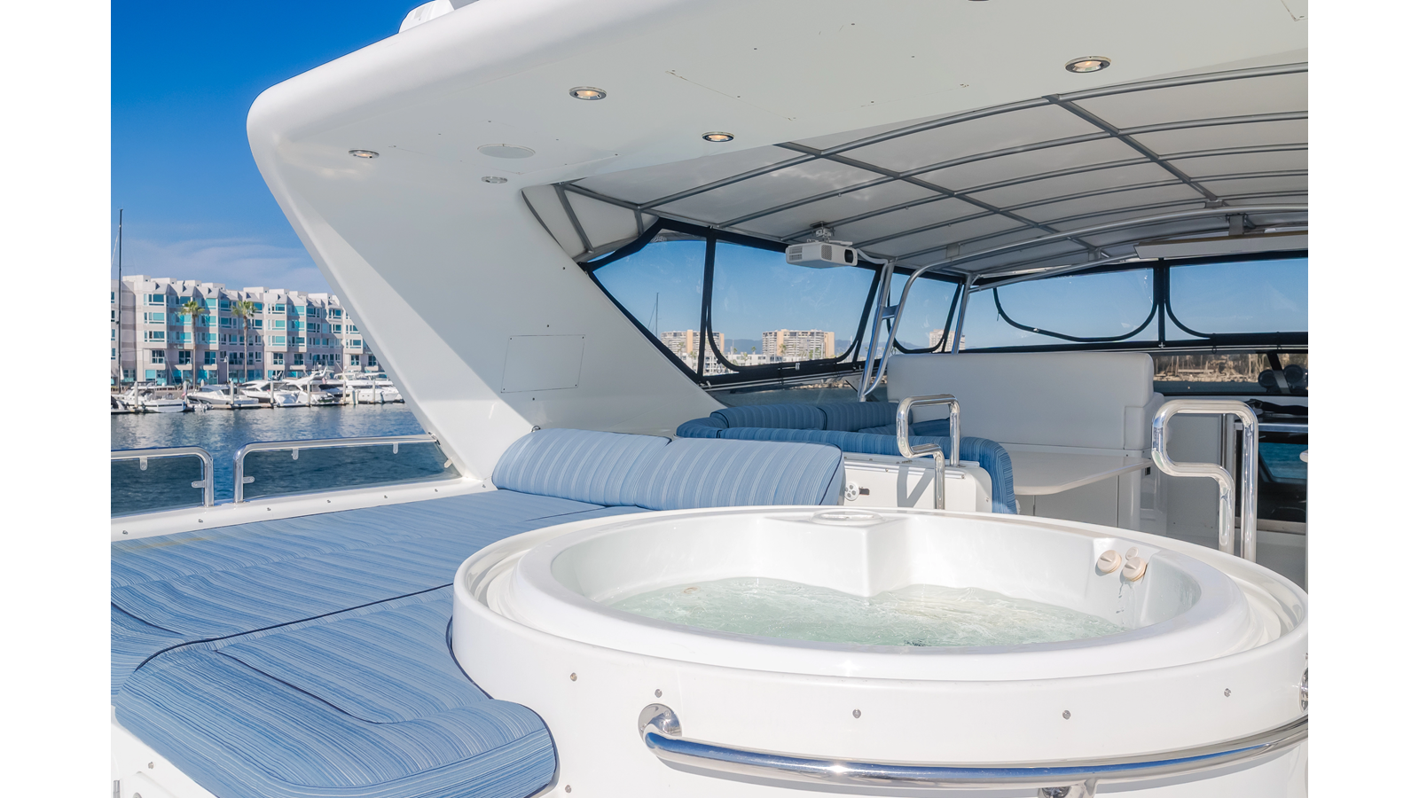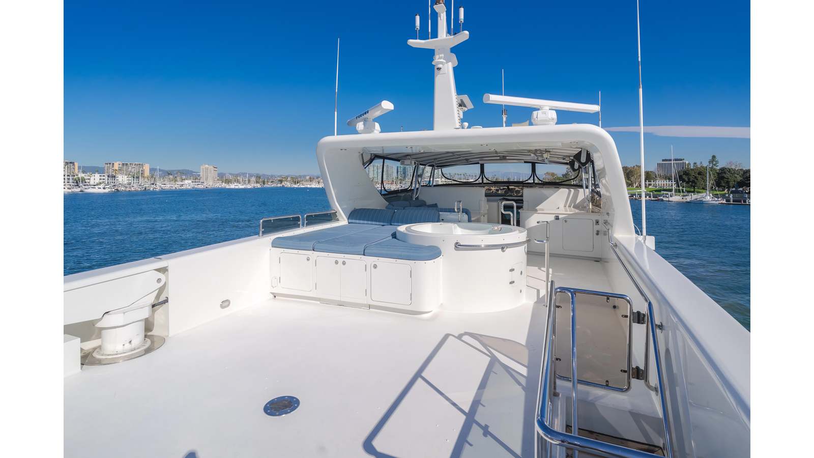 - Large flybridge with dinette, Jacuzzi and abundant deck space