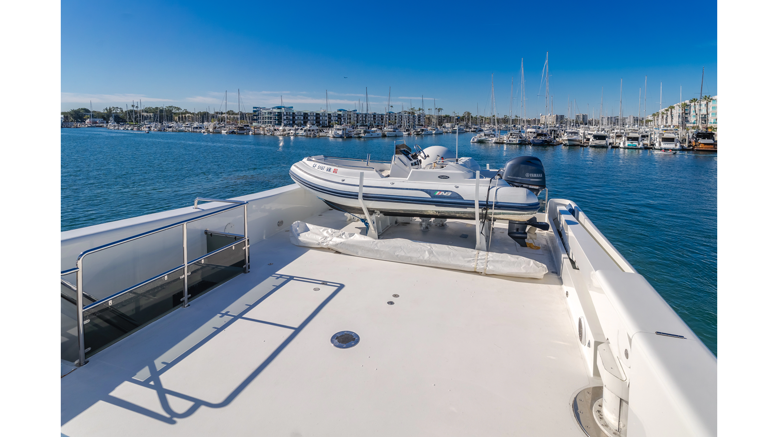 The flybridge, accessed both from the aft deck and the pilothouse, is a large volume space featuring a helm station, L-shaped settee with table and Jacuzzi. Also included is a AV entertainment system built The boat deck is aft of the flybridge and has the space to the 14’ tender and other toys. included is a deck Umbrella.
