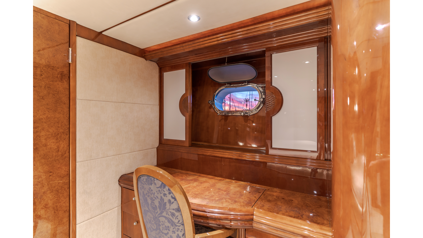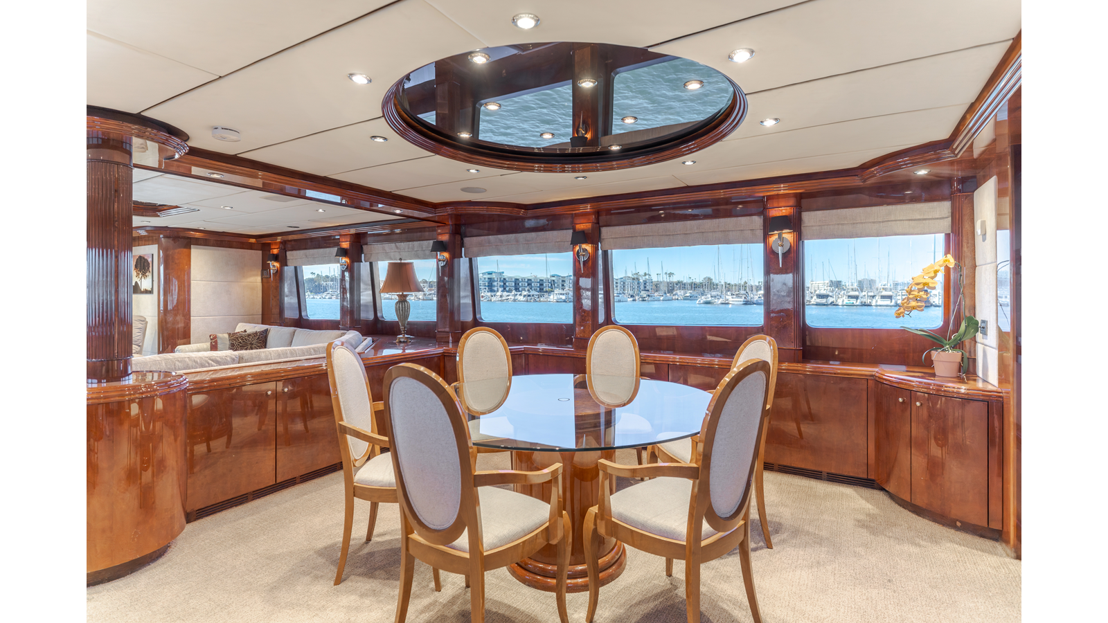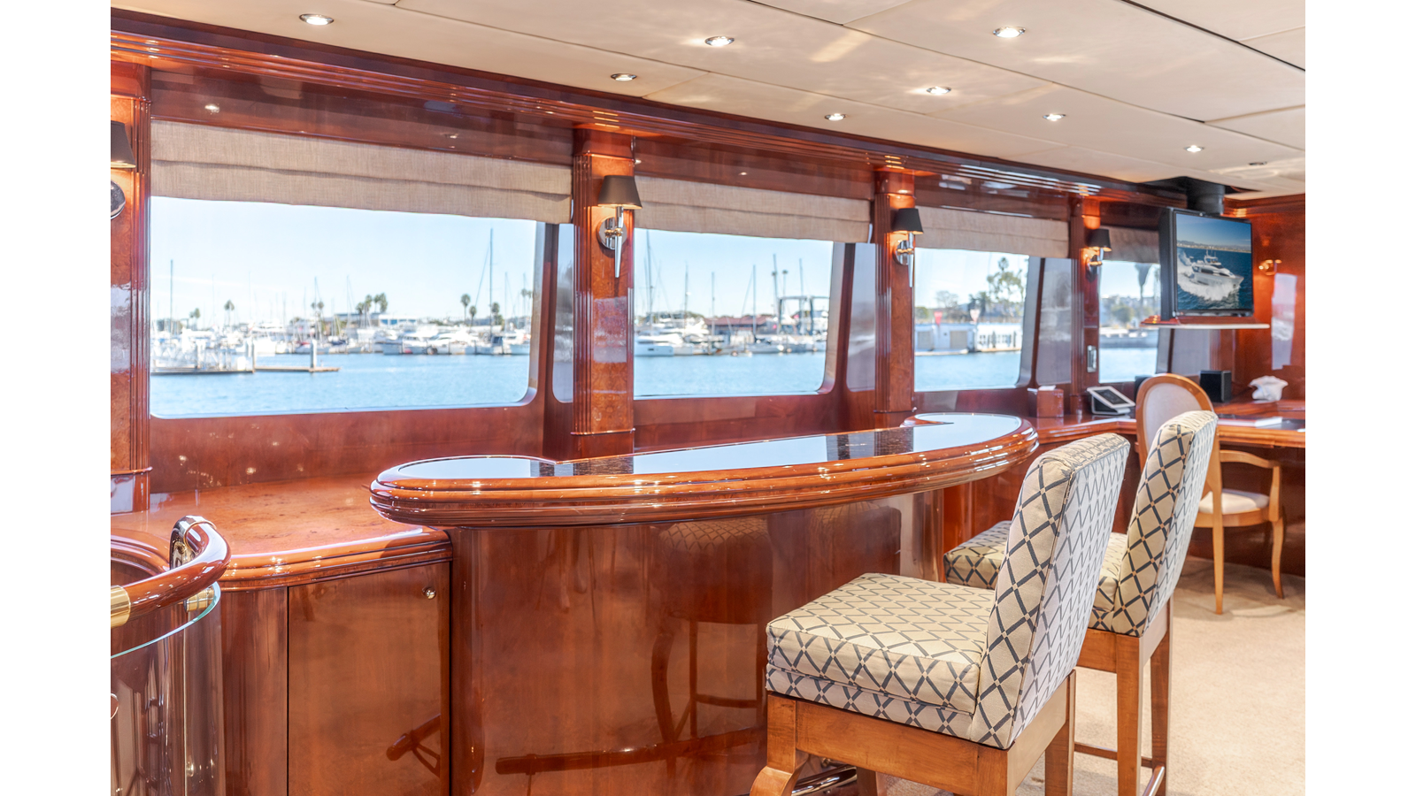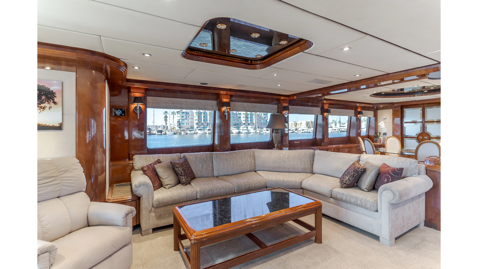 The full beam main salon is very spacious for a yacht of this length and is a perfect platform for entertaining guests or just lounging with family. Entering from the aft deck there is an aft-facing desk and chair on the starboard side, with a large L-shaped sofa chair and coffee table adjacent to port. A formal dining area occupies the port forward area of the salon, with a bar on the starboard side.