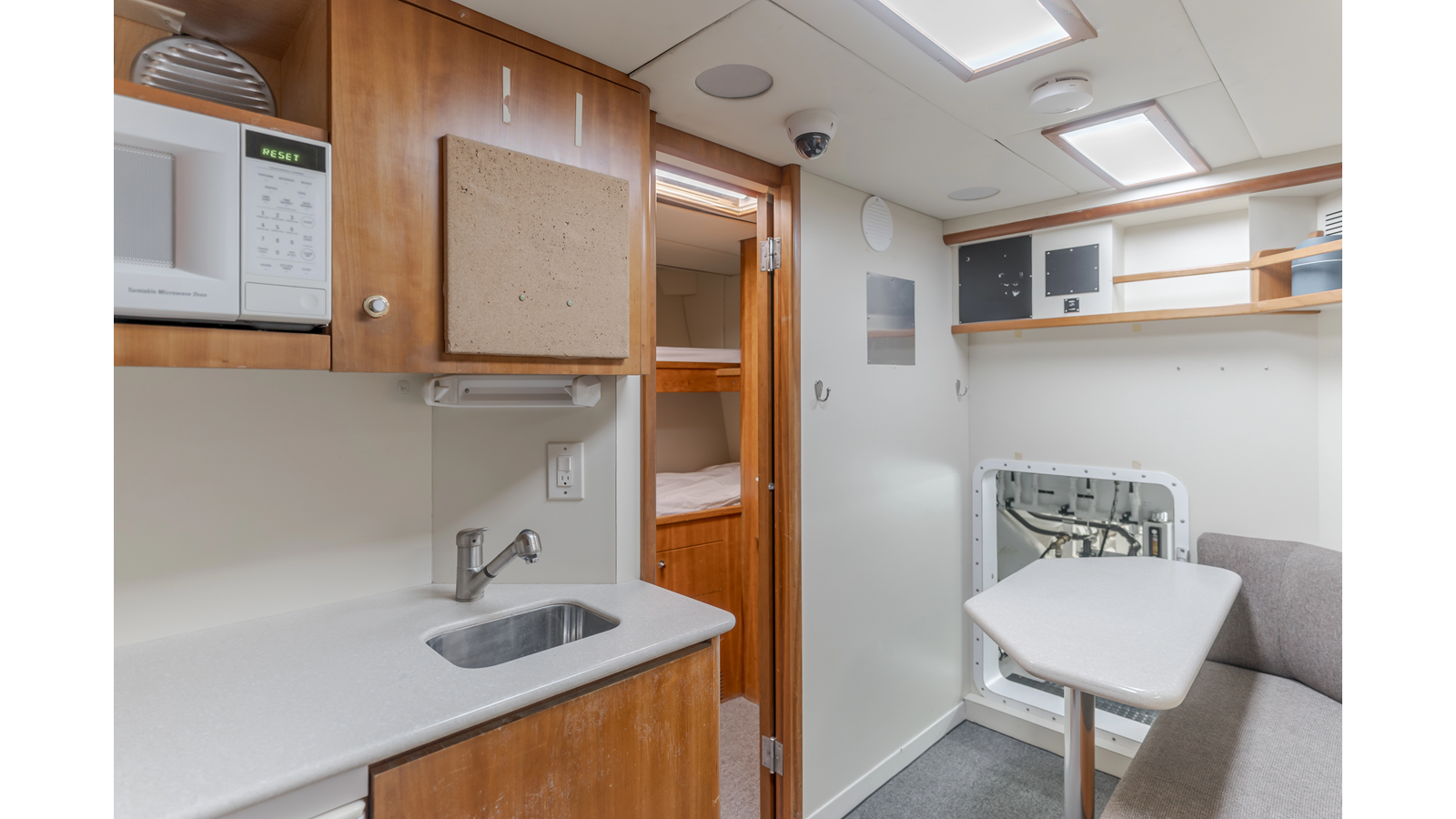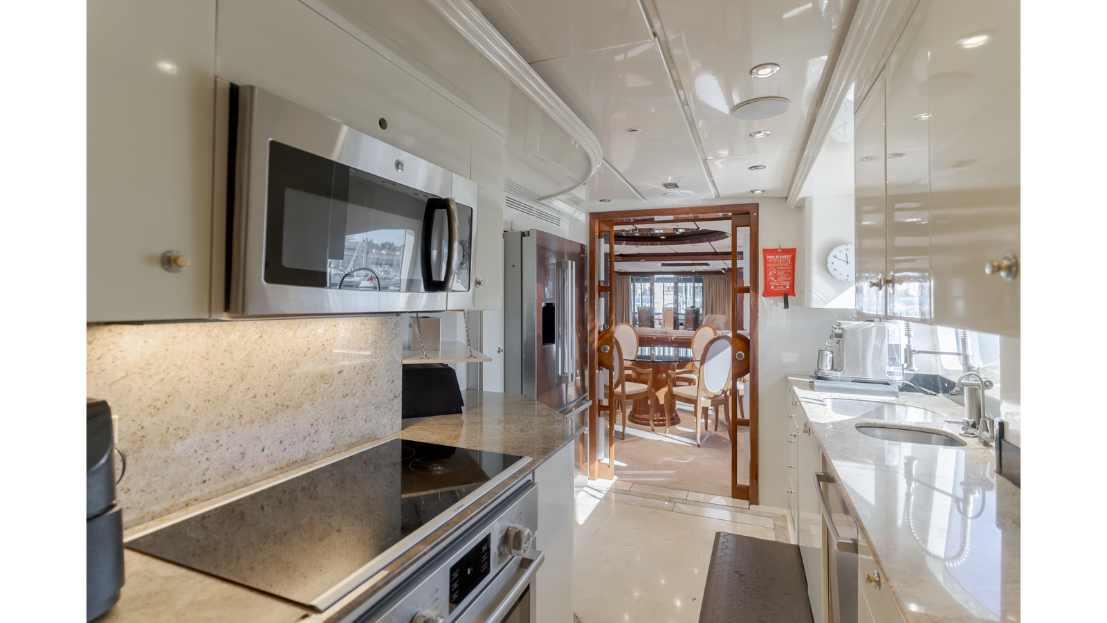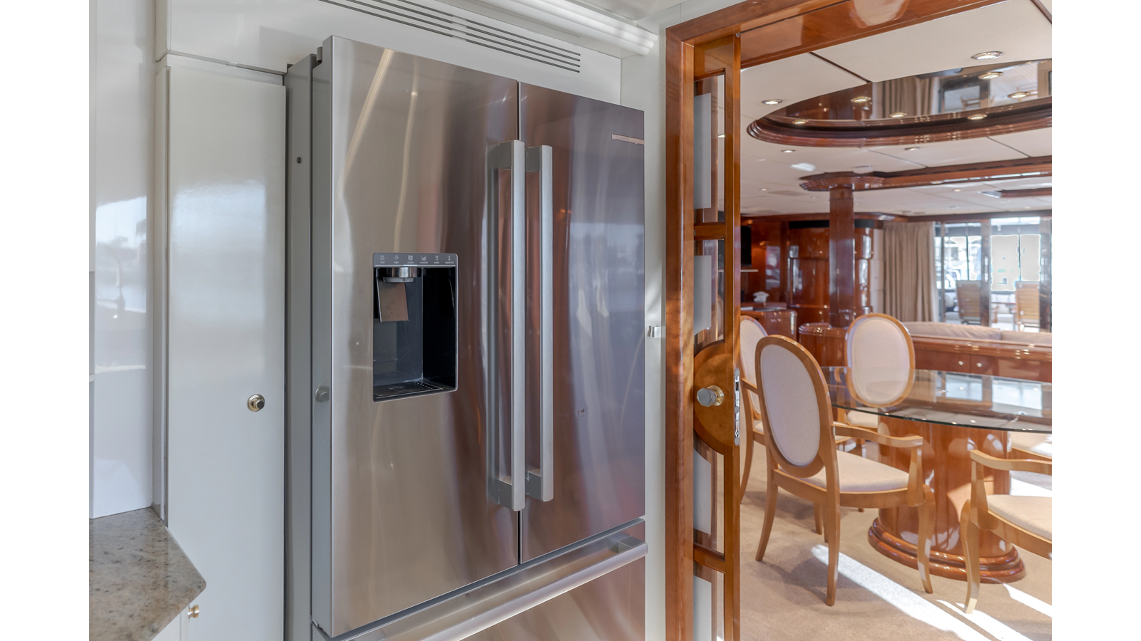 - French doors and etched glass with wood frames lead into the galley, which is located on the port side, forward of the salon. The galley features updated Bosch appliances and is complimented by generous countertop spaces.