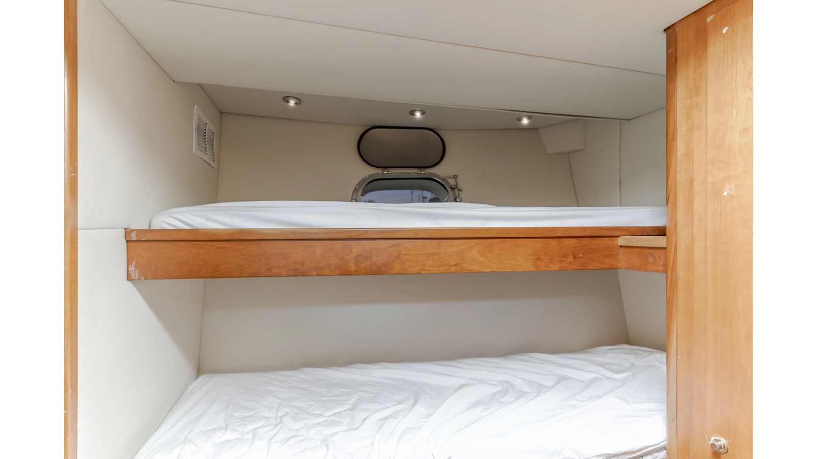 The accommodations deck is accessed via a stairwell from the main foyer and features three guest staterooms. The full beam VIP cabin can serve as a second master stateroom. The two guest staterooms are forward of the VIP. The port guest stateroom features a queen-sized bed and the starboard guest stateroom has two twins.