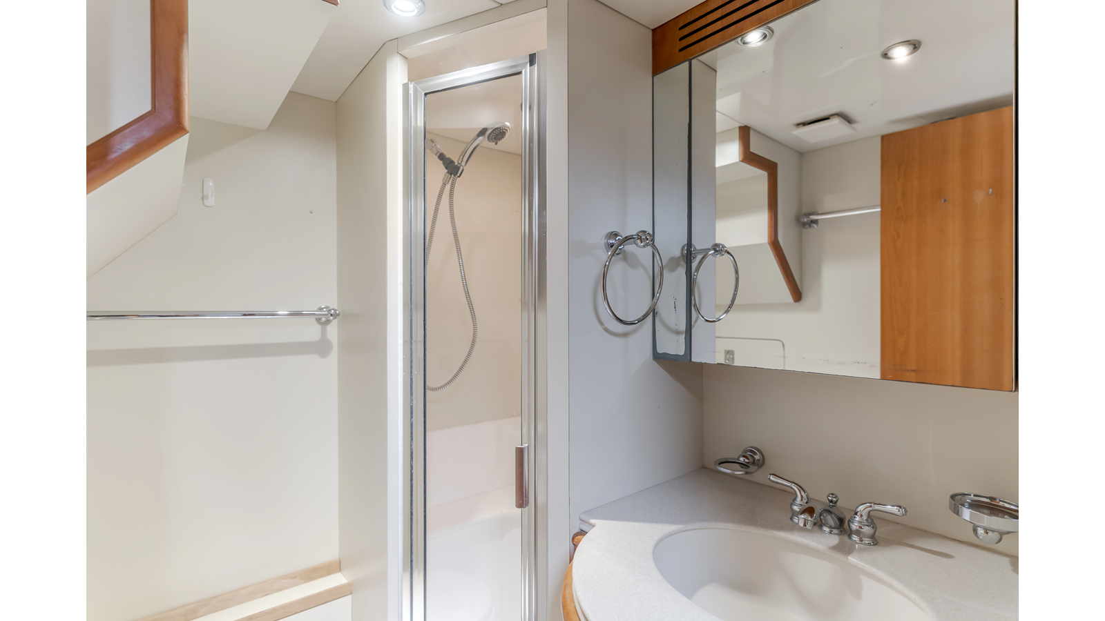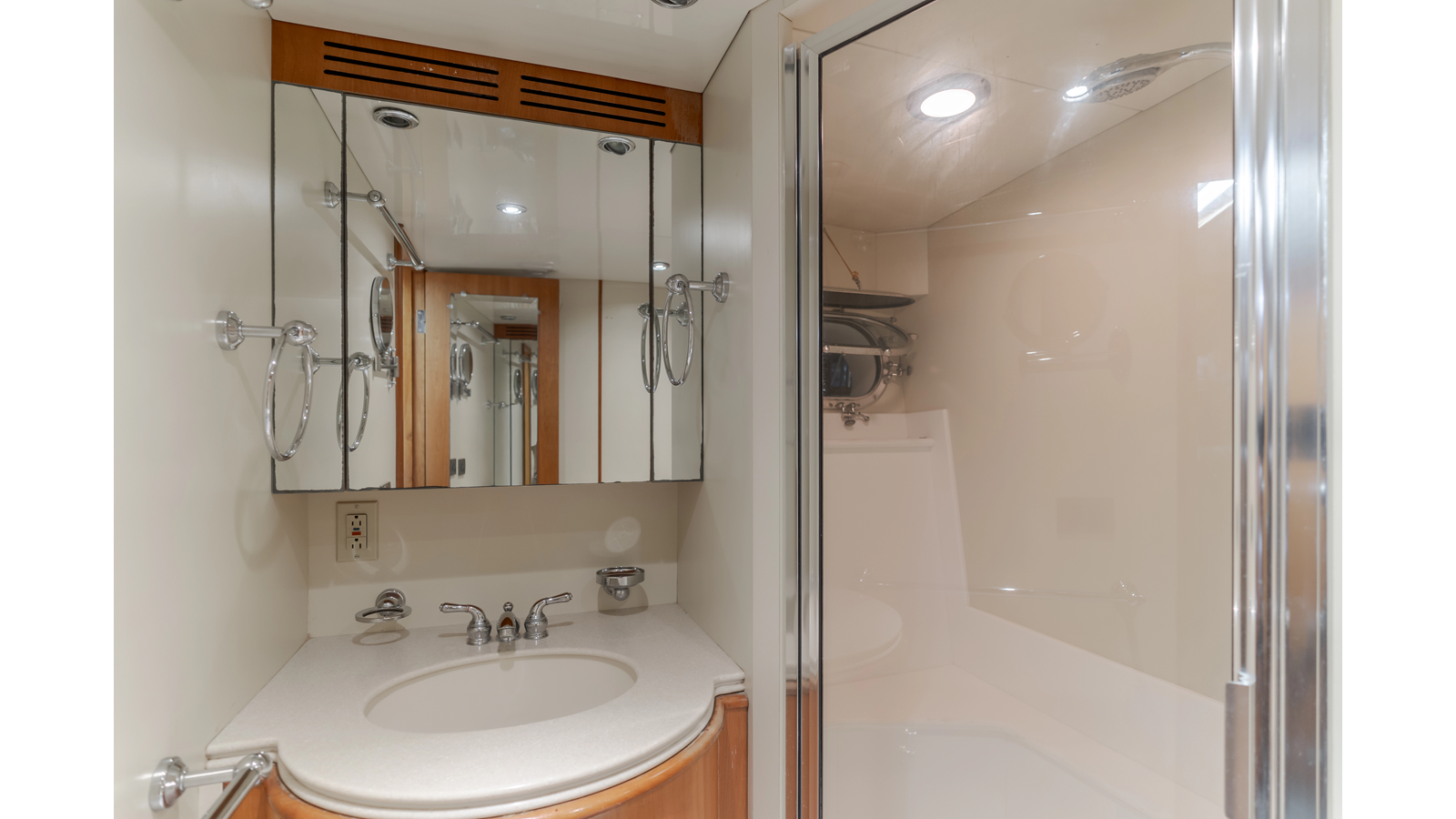 The bi-level master stateroom in located on the main forward, an attractive feature that is usually found in much larger yachts. Windows on the port and starboard side provide excellent ocean views. Other features include a pop-up entertainment center. Forward and down three steps is a massive wardrobe, with a double door leading in to the head with his-and-her sinks and large shower.