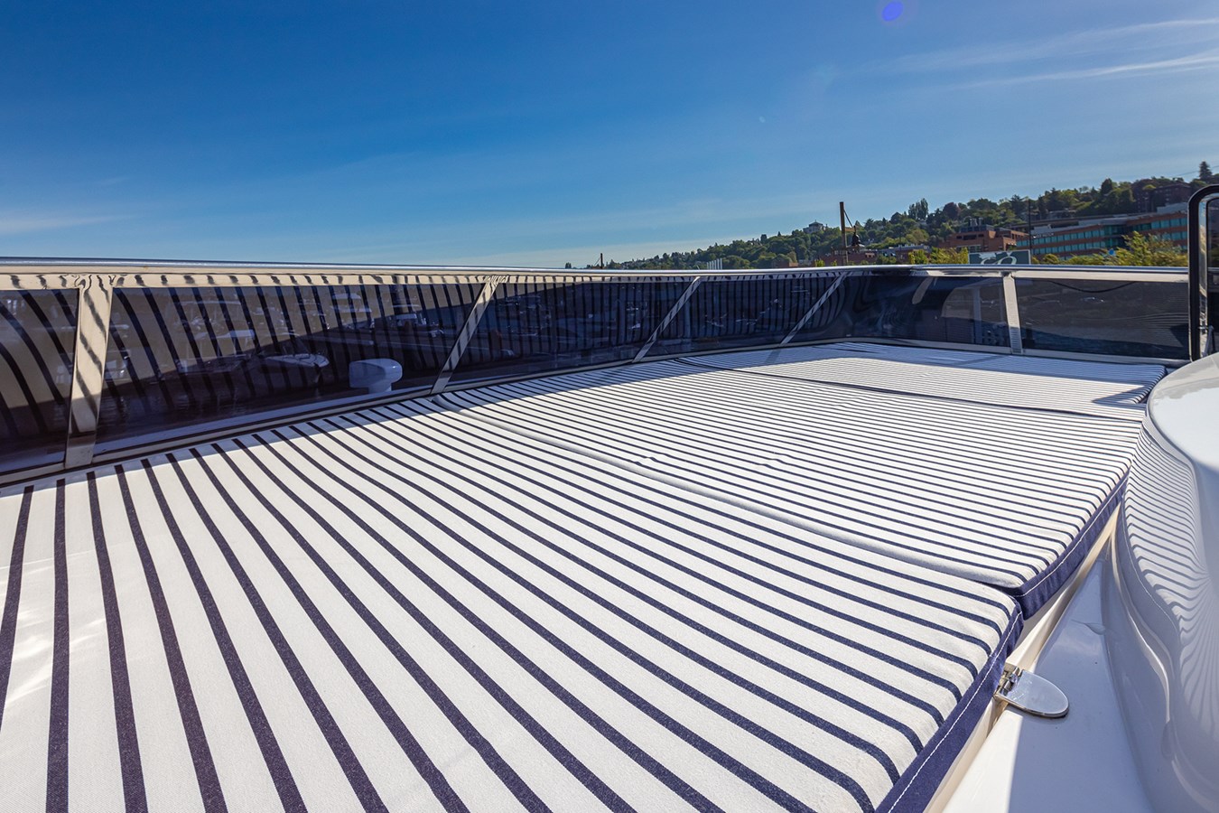 A large open flybridge is accessed by an internal floating stairway. The flybridge includes a second helm station, an al fresco dining table with seating, a wet bar, and electric BBQ. There is also plenty of room to lounge on the aft flybridge deck or to stow a RIB. A large sun pad rounds out the bridge-deck accommodations.