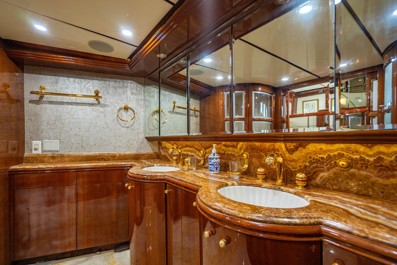 The on-deck day head has a beautiful metal sink and marble countertops. The faucets and hardware throughout the boat are made by Safdenelli Jado and Hansgrohe. The full beam master stateroom is forward with a king-size bed and padded headboard with mirrors above the headboard. To port is an L-shaped settee and built-in burl wood dresser. The entertainment center has a pop-up 32″ TV, DVD player, VCR, AM/FM tuner and storage area for videos and CD’s. Forward of the bed, down several stairs leads to a dressing area, cedar-lined wardrobes with full-height beveled mirror doors, and a huge athwartship master head. The his and her head features a two sink vanity with marble countertops and backsplash. Separate enclosed areas are port and starboard for and include the toilet on one side and the shower on the other. The flooring is a beautiful Onyx stone.