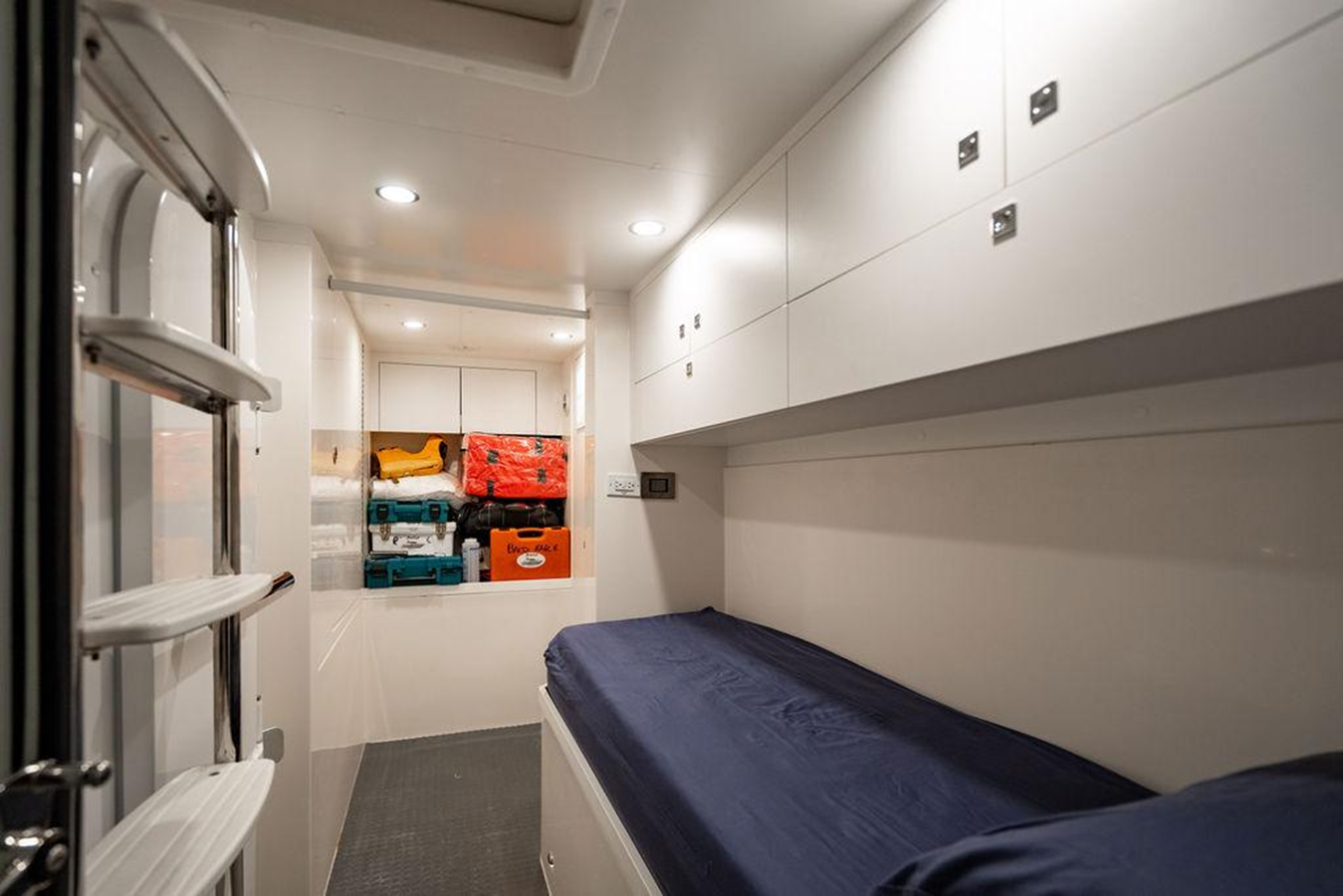 A nice crew space on this yacht. Single berth. Independant air conditioning was added to this space.