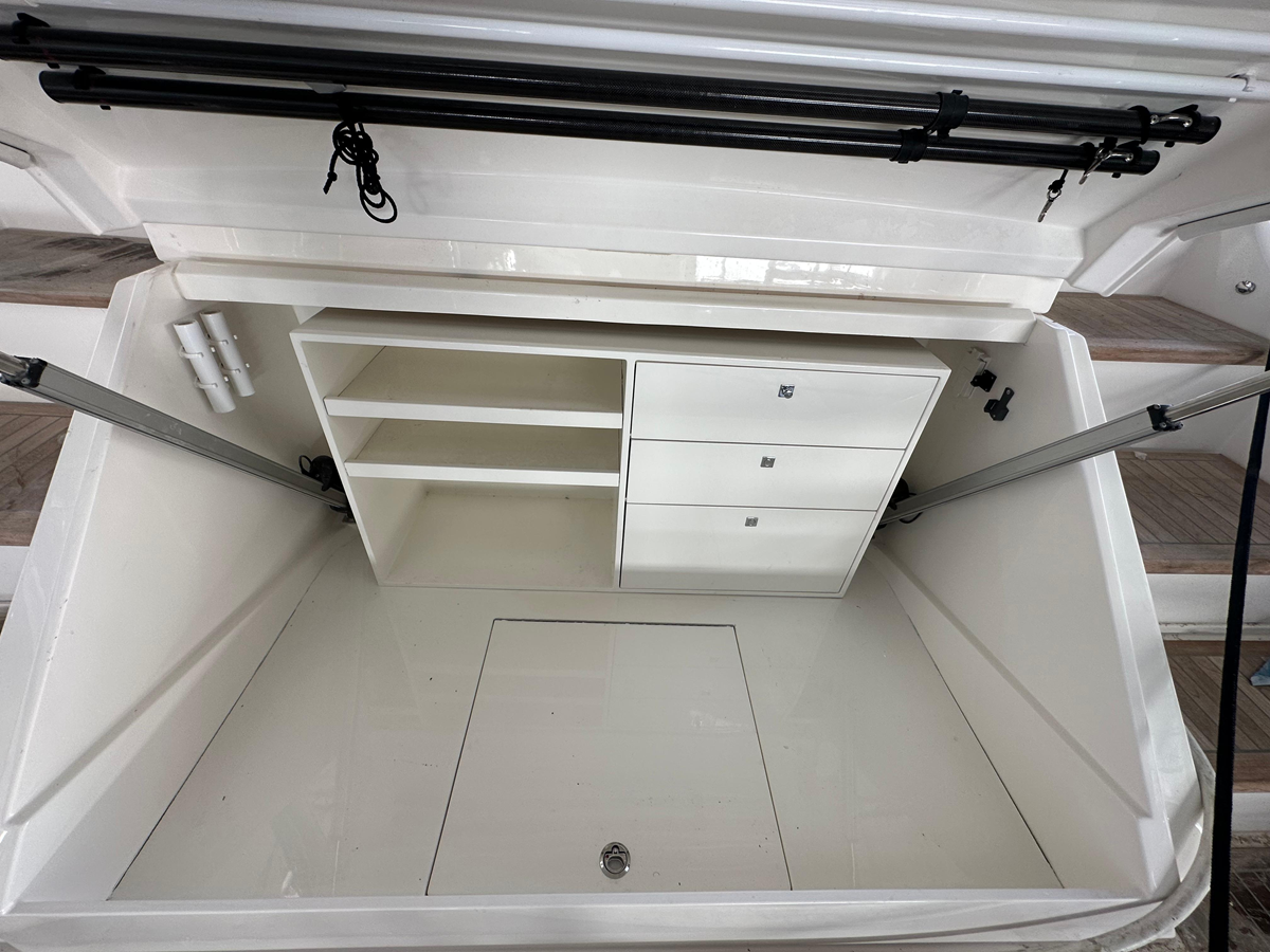 Already a great space on this yacht, this owner designed a cockpit layout that better suited his yachting style. A custom dining table with folding leaves was made and installed along the aft settee. Additionally, the portside settee was replaced with a giant storage locker for all the safety gear. This also gives a nice buffet directly outside the opening window at the galley.