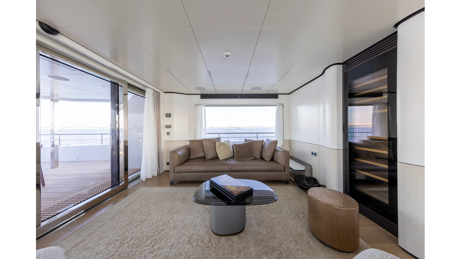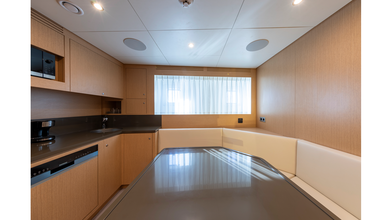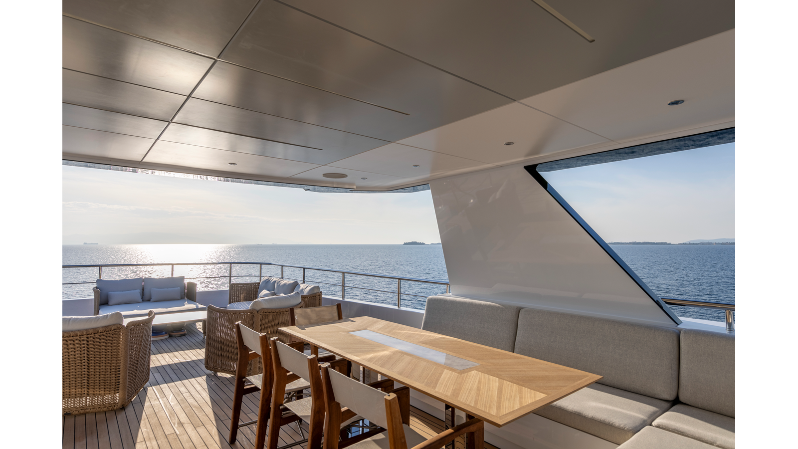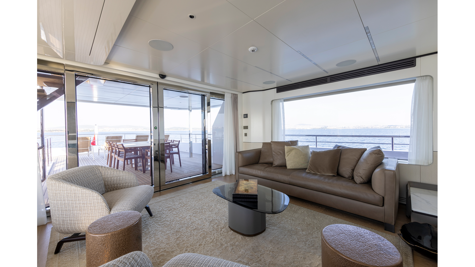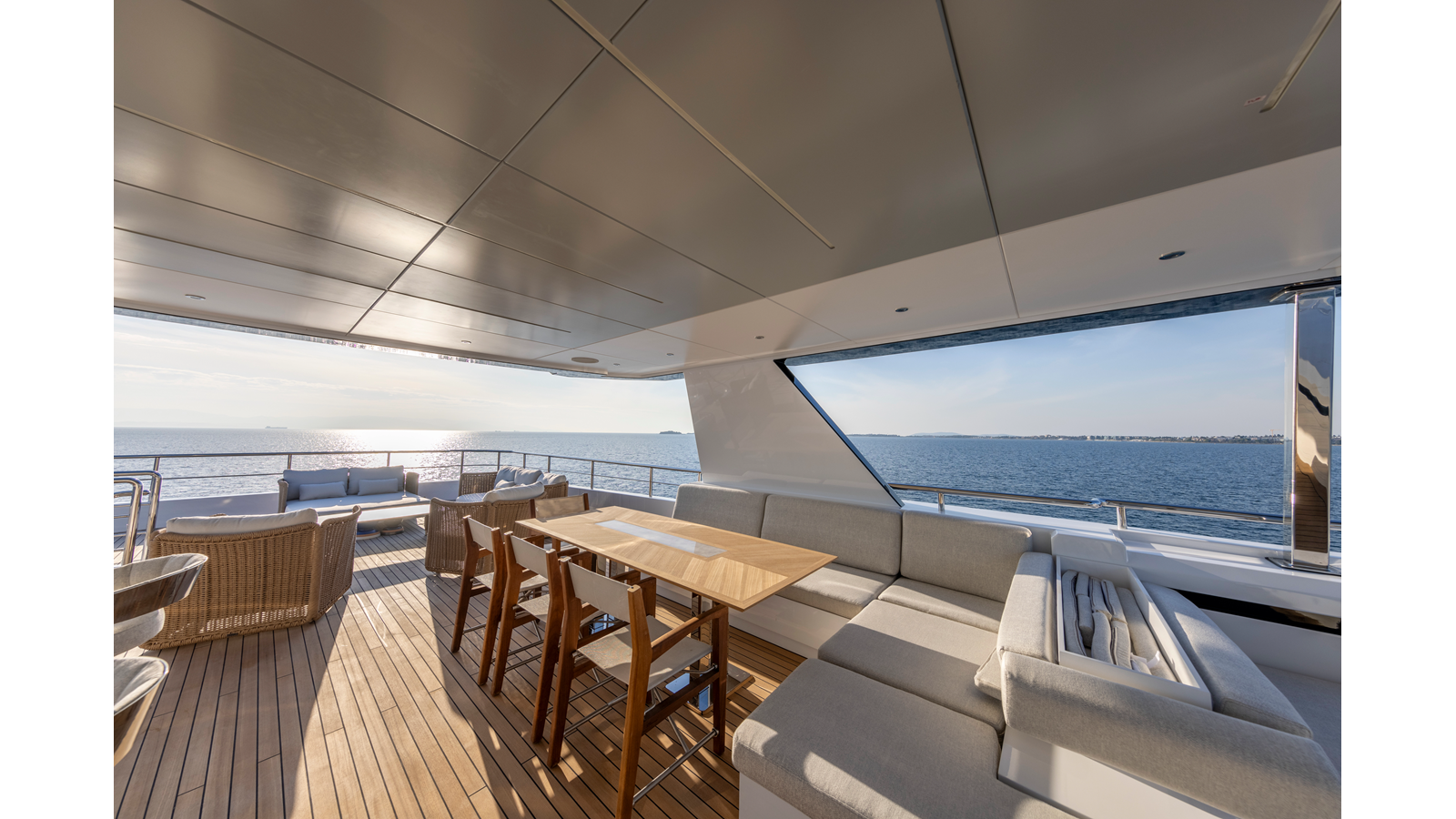 Moving towards the interior, the main saloon offers ample seating and a spacious dining area. Sliding doors ensure easy transition between indoor and outdoor spaces, while strategically positioned low bulwarks optimize panoramic sea views.