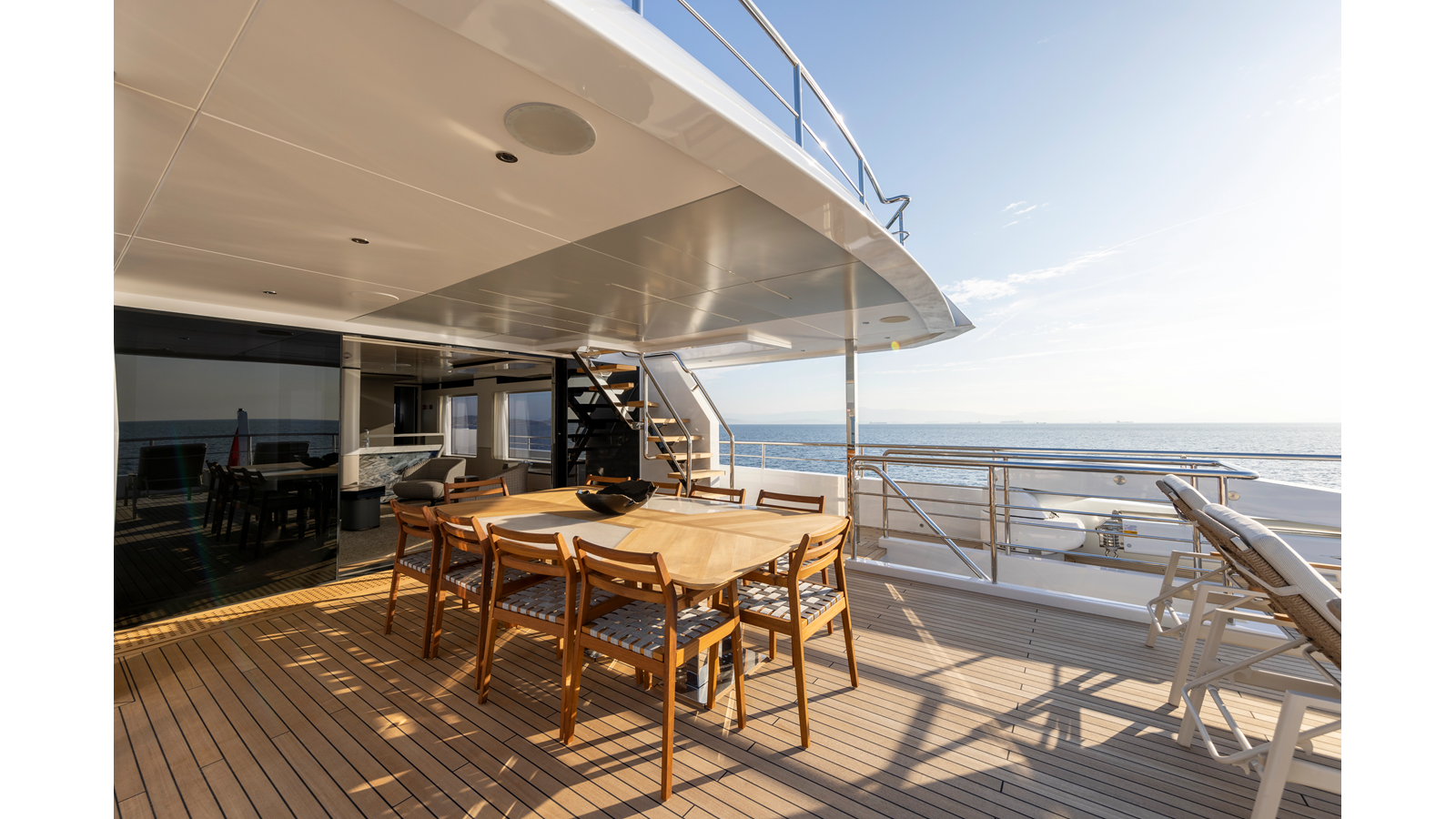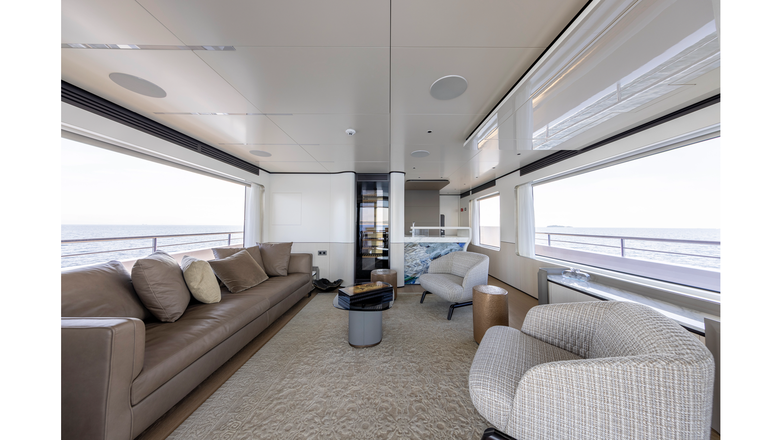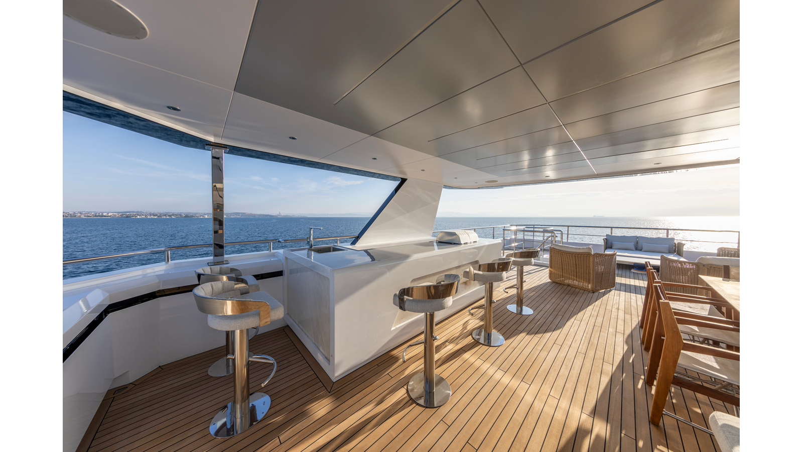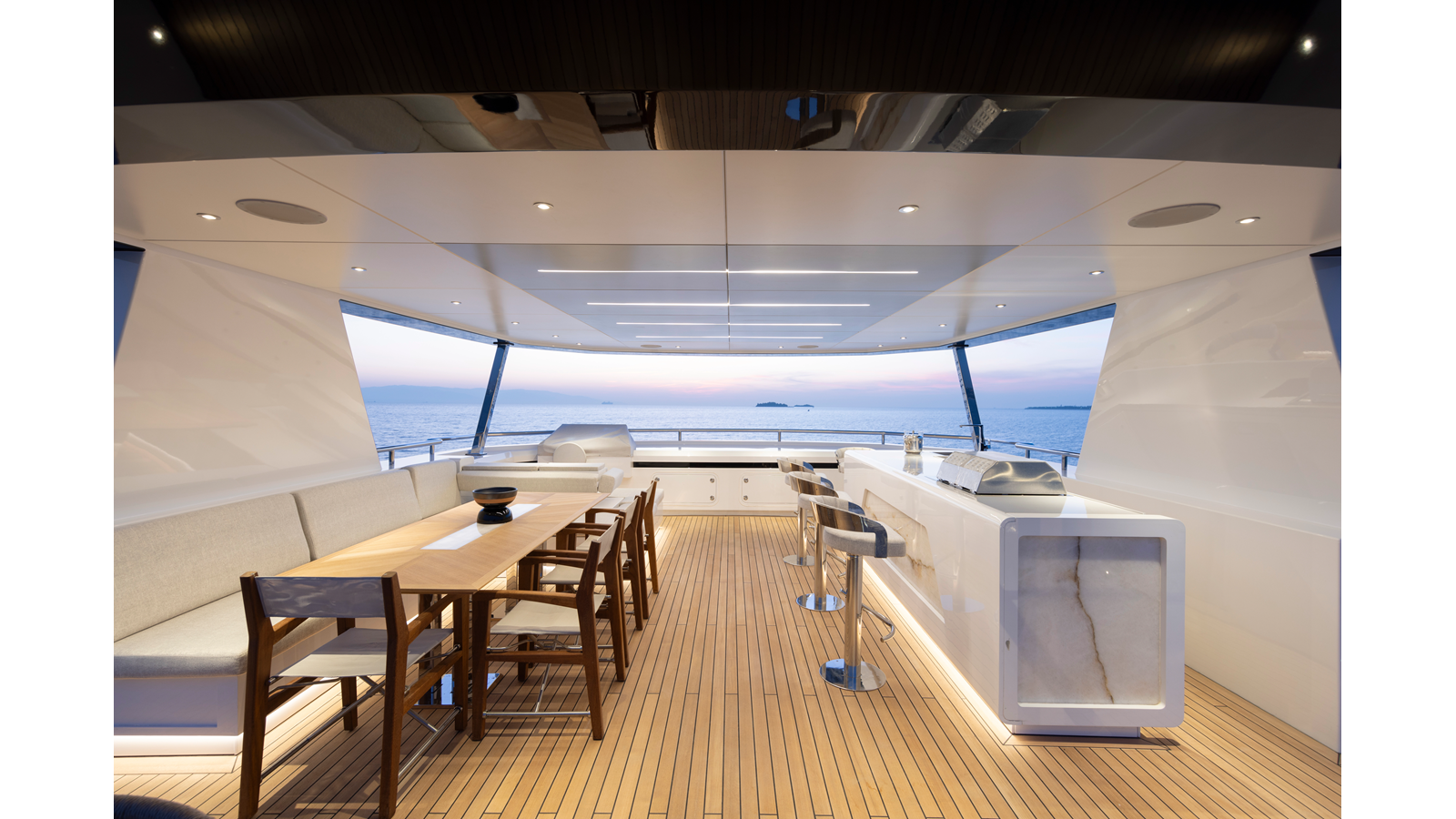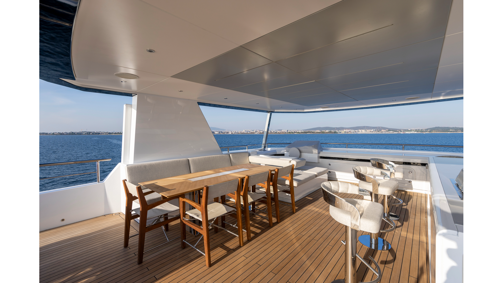 Moving towards the interior, the main saloon offers ample seating and a spacious dining area. Sliding doors ensure easy transition between indoor and outdoor spaces, while strategically positioned low bulwarks optimize panoramic sea views.