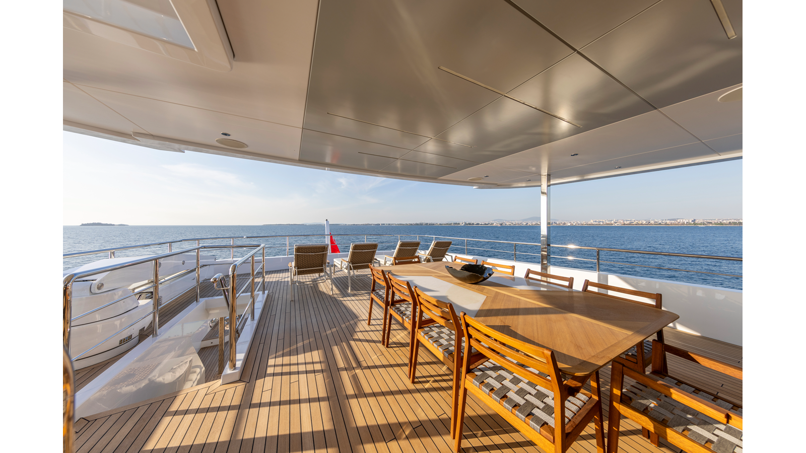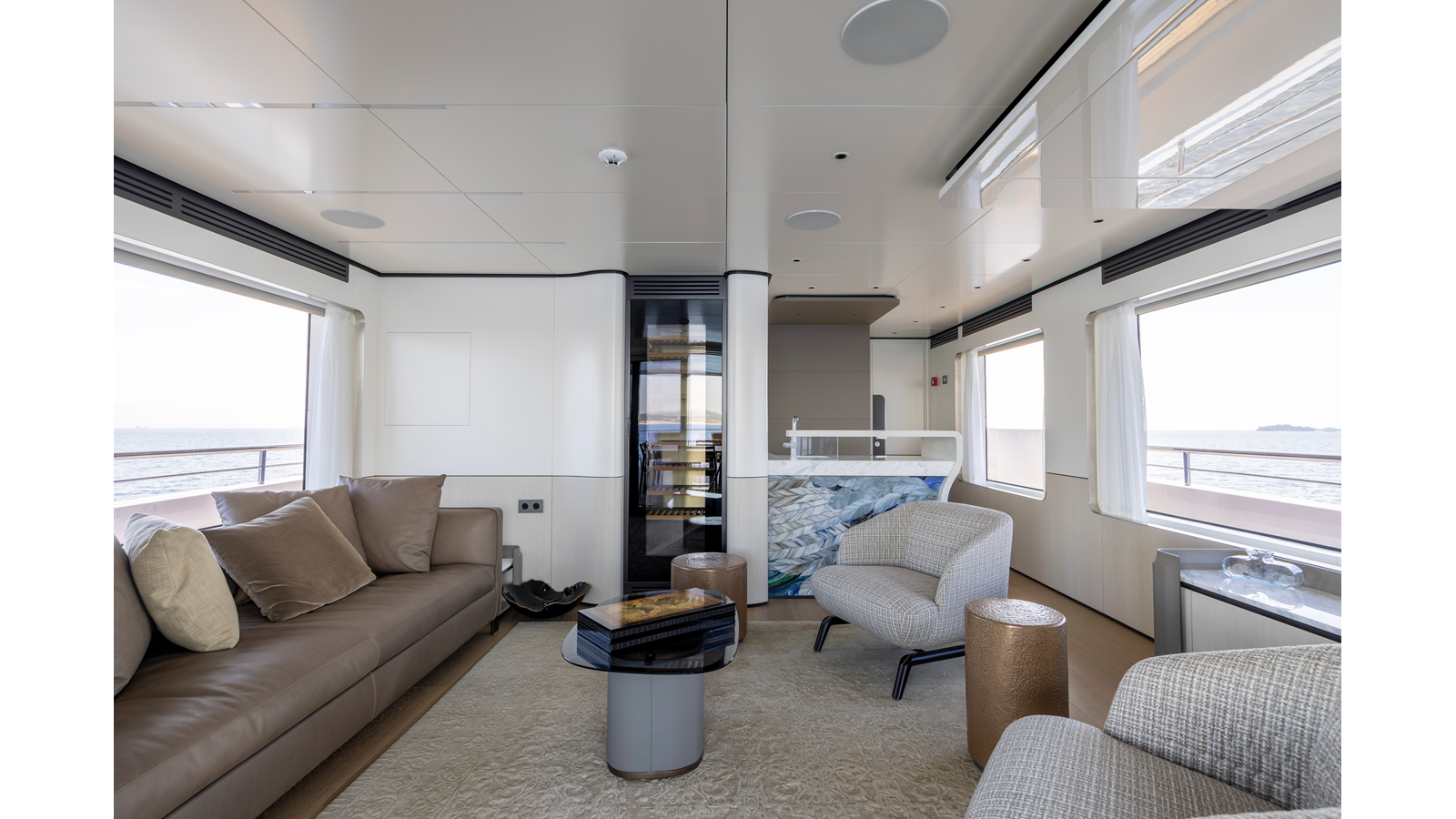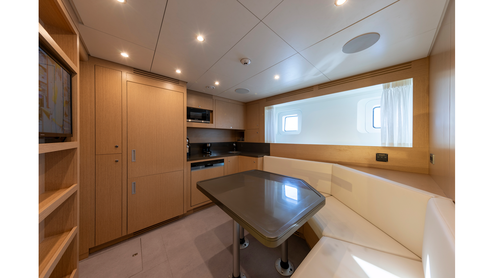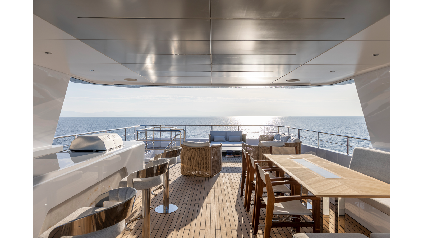 Moving towards the interior, the main saloon offers ample seating and a spacious dining area. Sliding doors ensure easy transition between indoor and outdoor spaces, while strategically positioned low bulwarks optimize panoramic sea views.