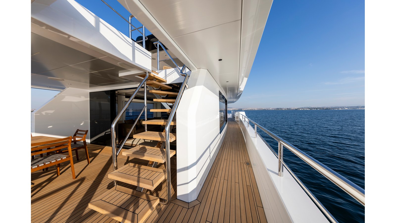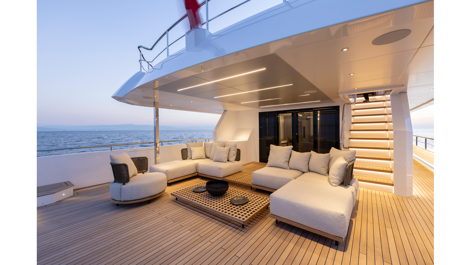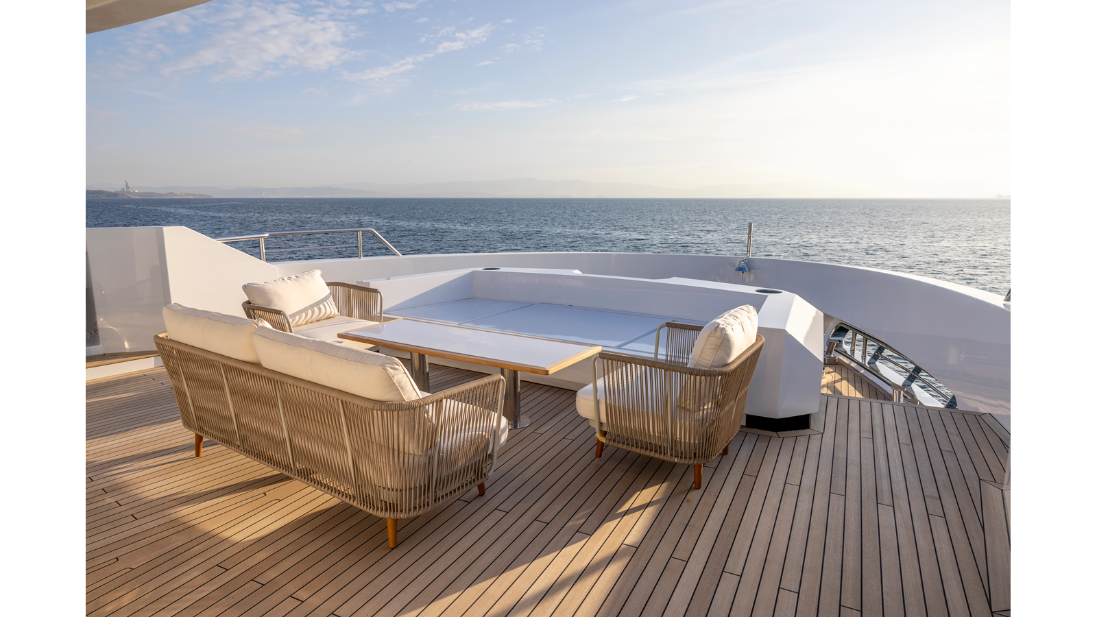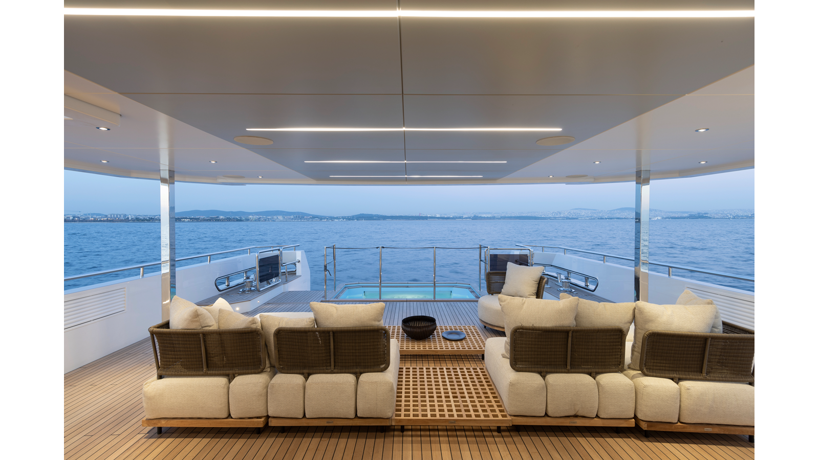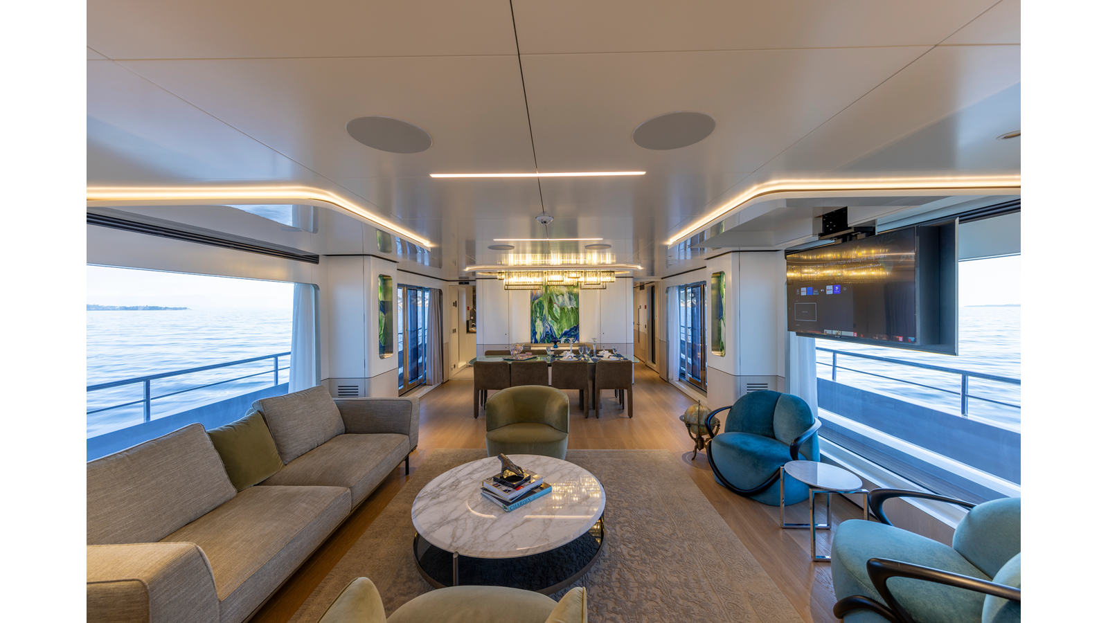 Moving towards the interior, the main saloon offers ample seating and a spacious dining area. Sliding doors ensure easy transition between indoor and outdoor spaces, while strategically positioned low bulwarks optimize panoramic sea views.