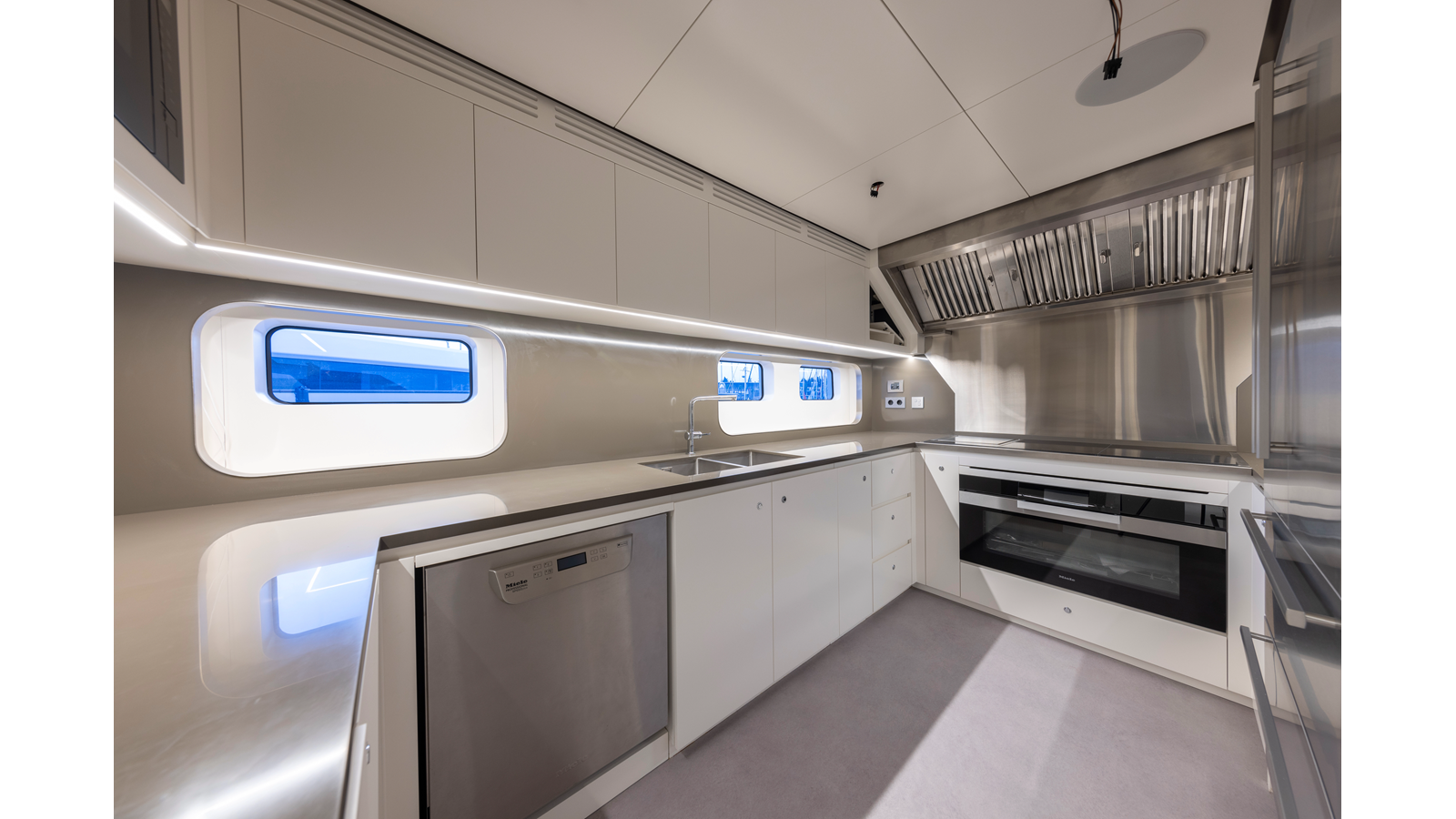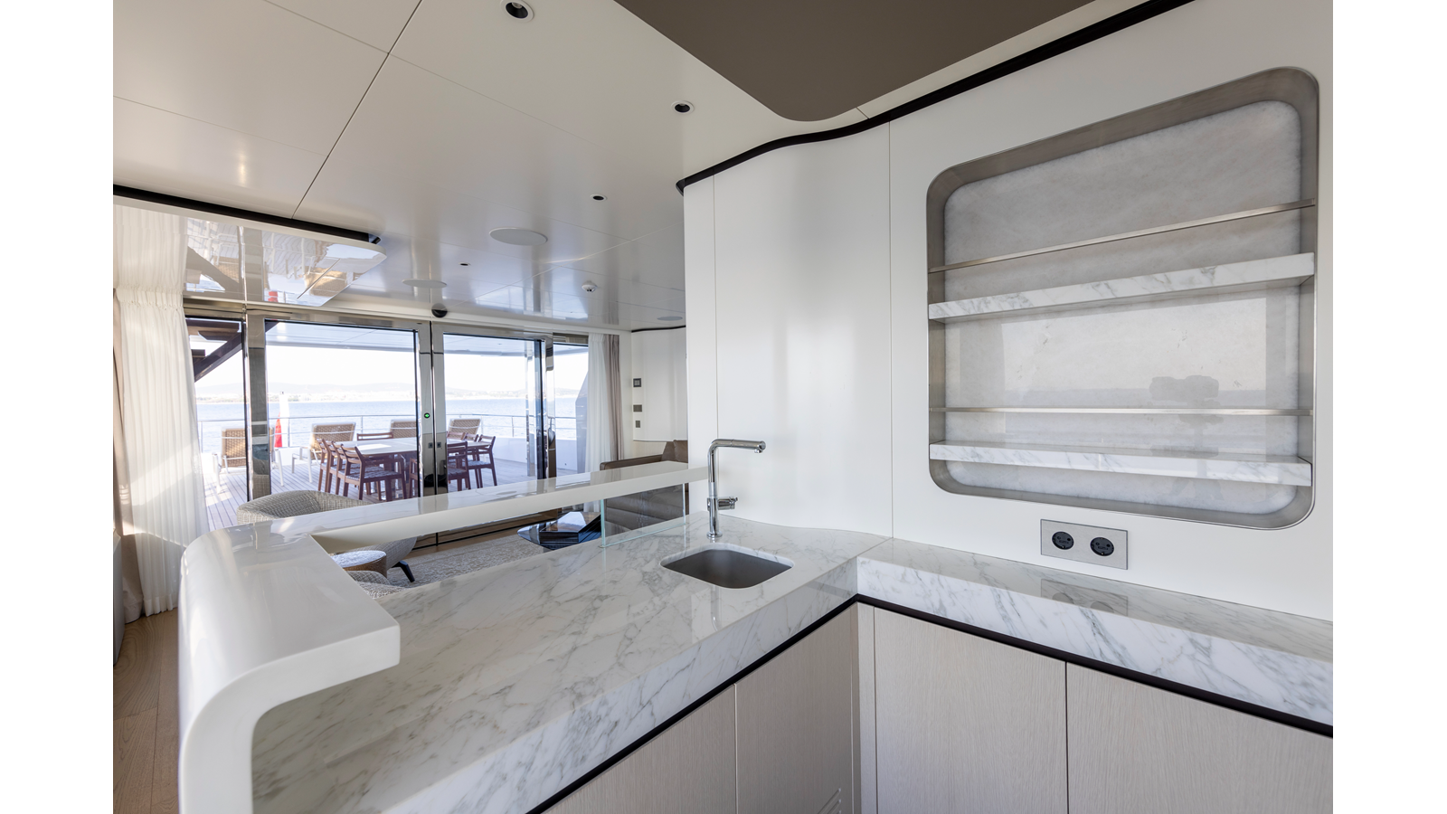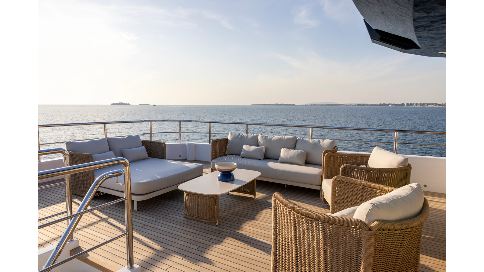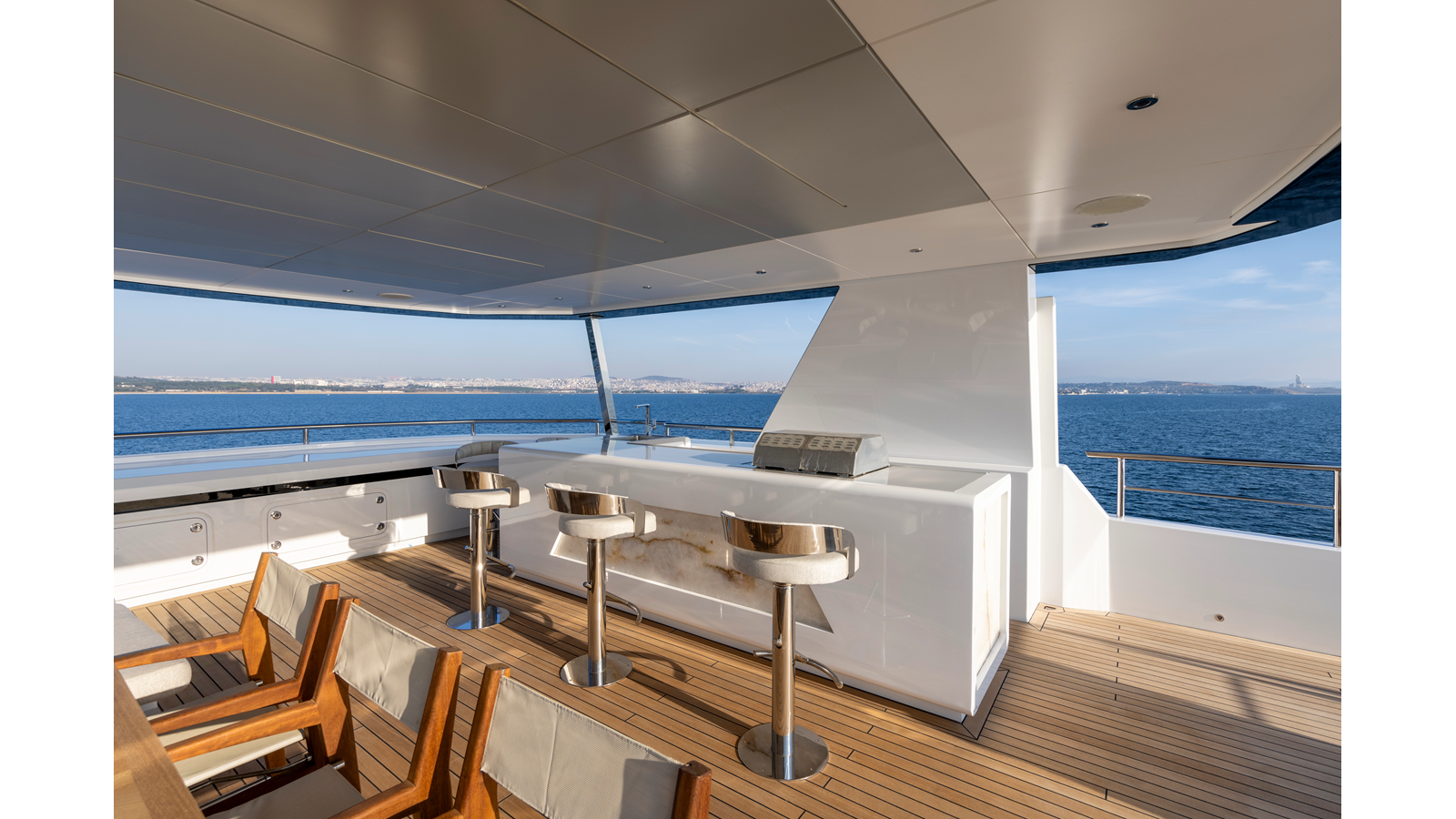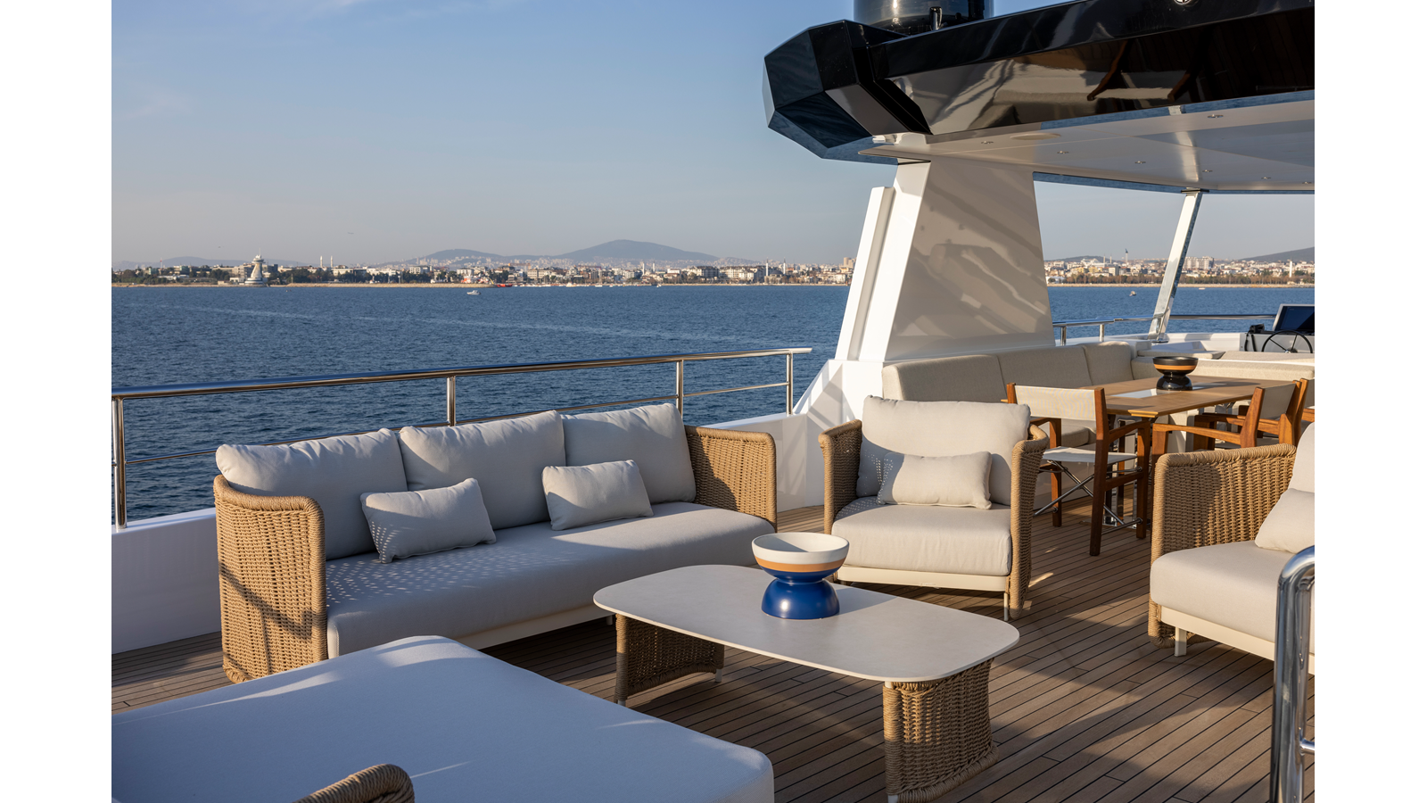Moving towards the interior, the main saloon offers ample seating and a spacious dining area. Sliding doors ensure easy transition between indoor and outdoor spaces, while strategically positioned low bulwarks optimize panoramic sea views.