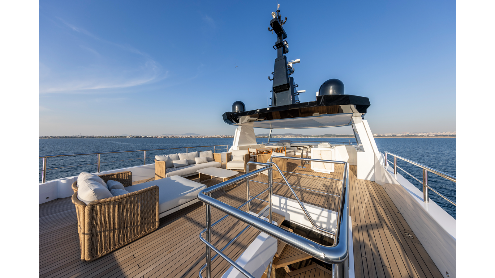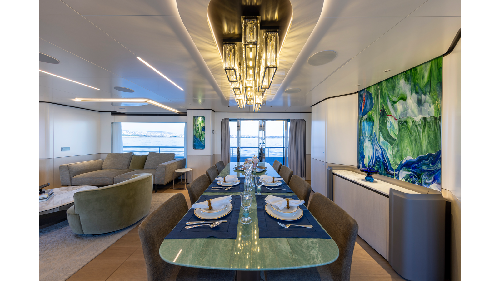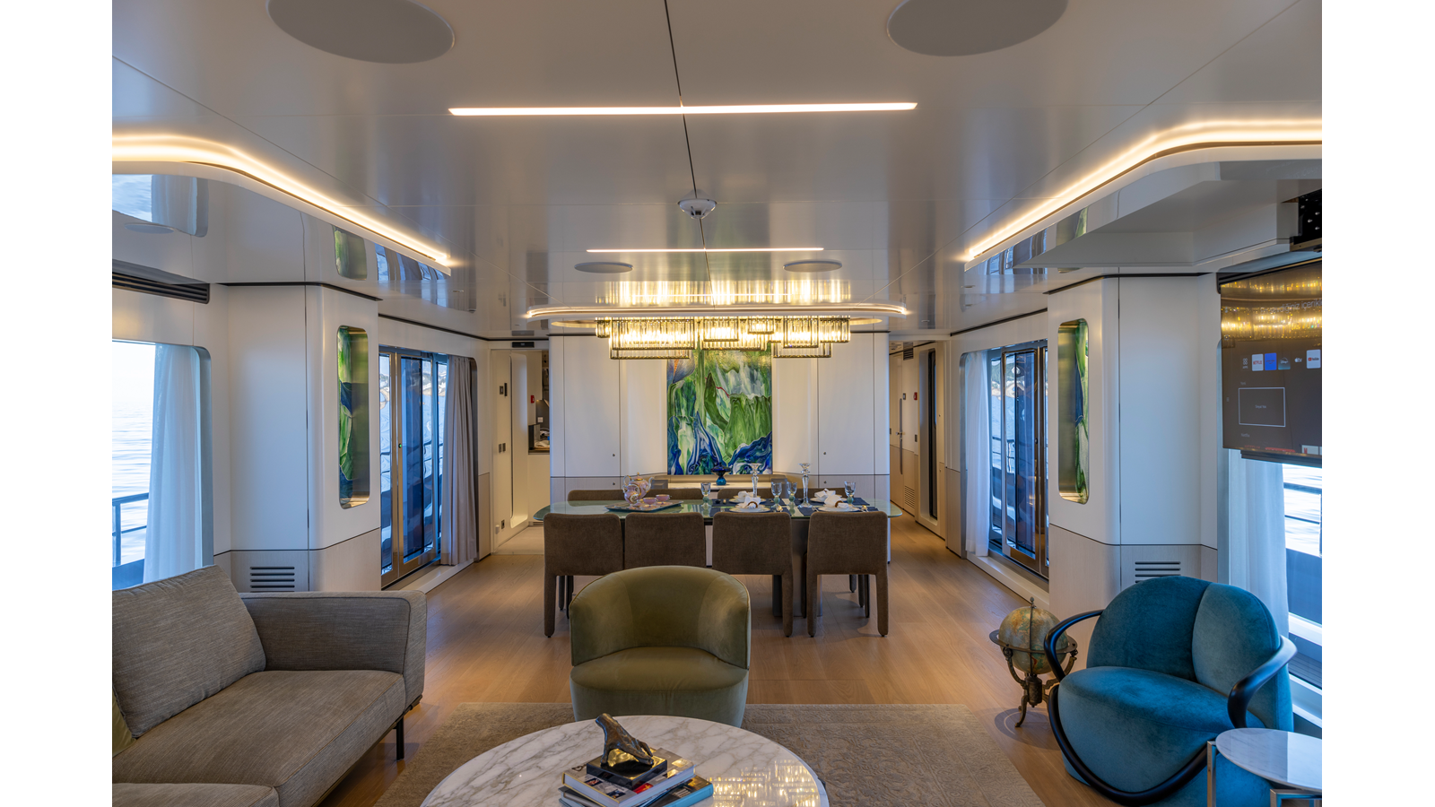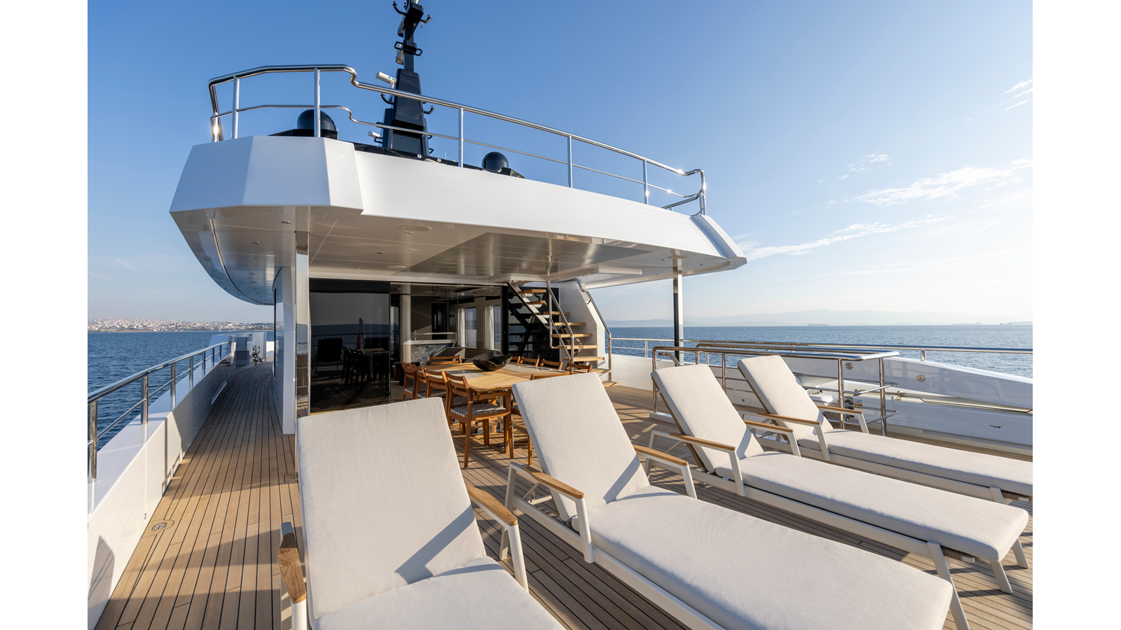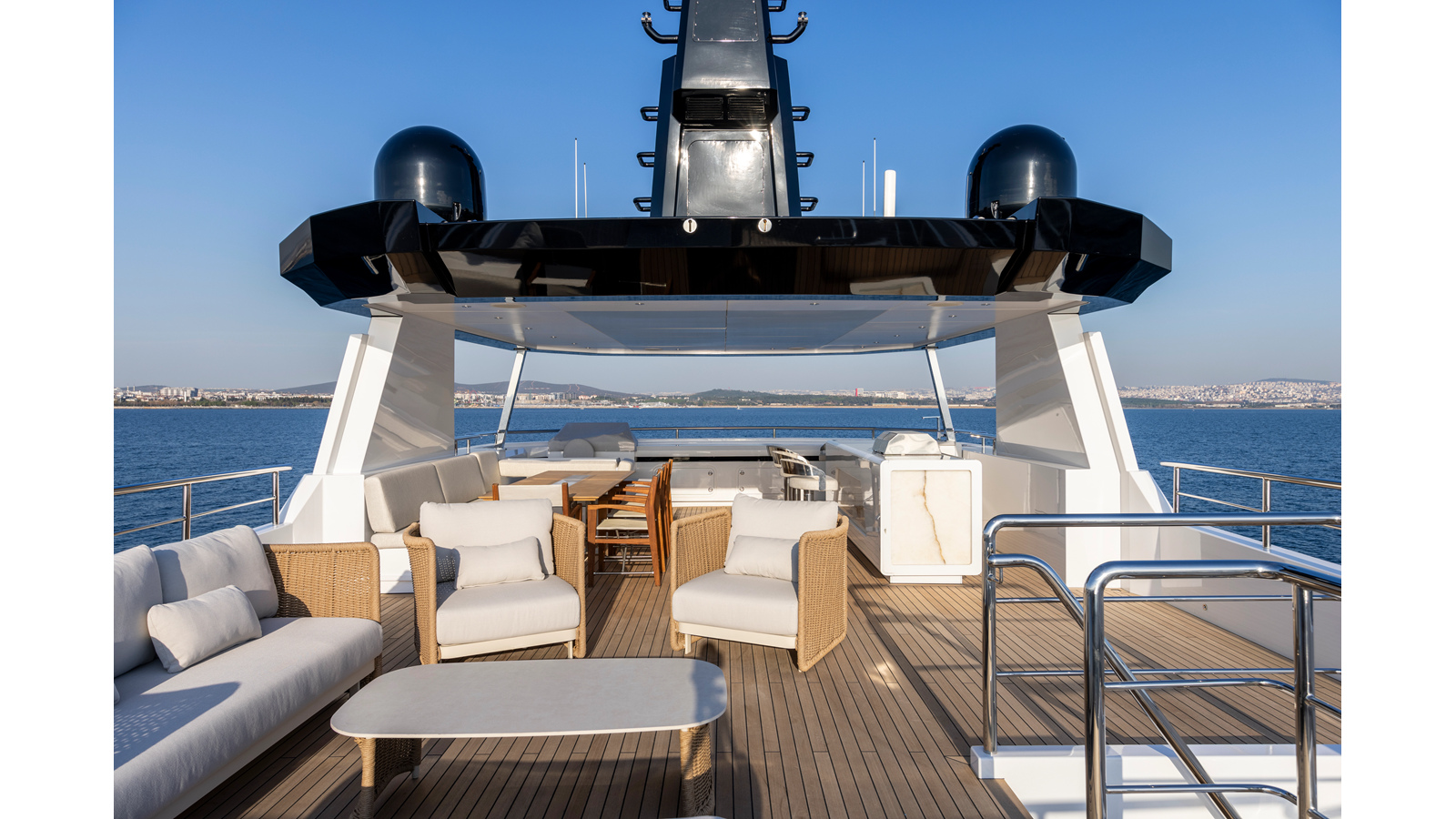 Moving towards the interior, the main saloon offers ample seating and a spacious dining area. Sliding doors ensure easy transition between indoor and outdoor spaces, while strategically positioned low bulwarks optimize panoramic sea views.