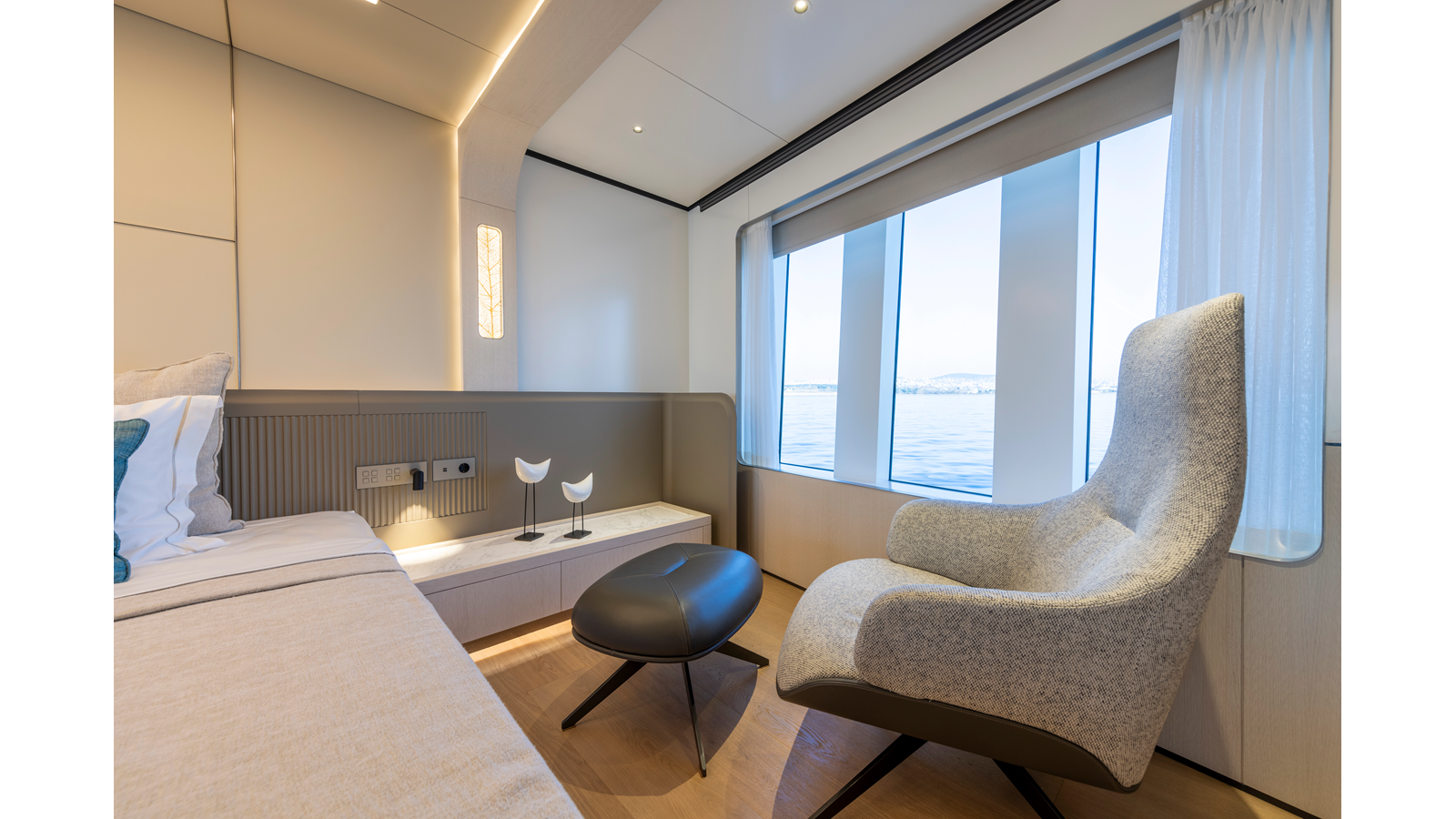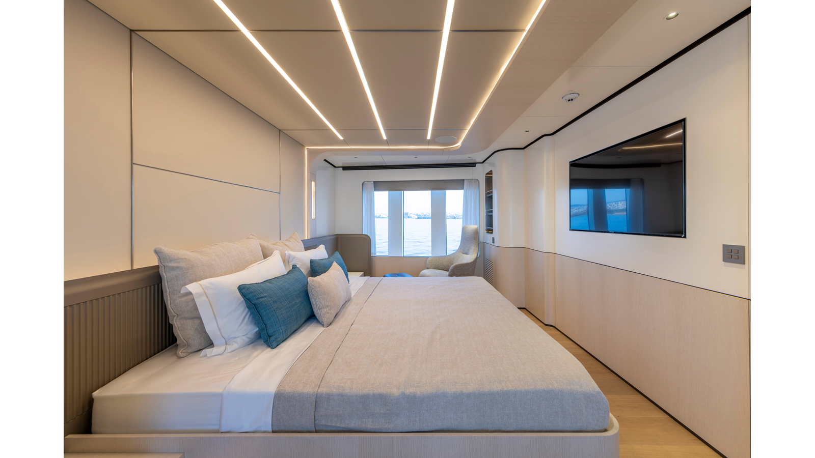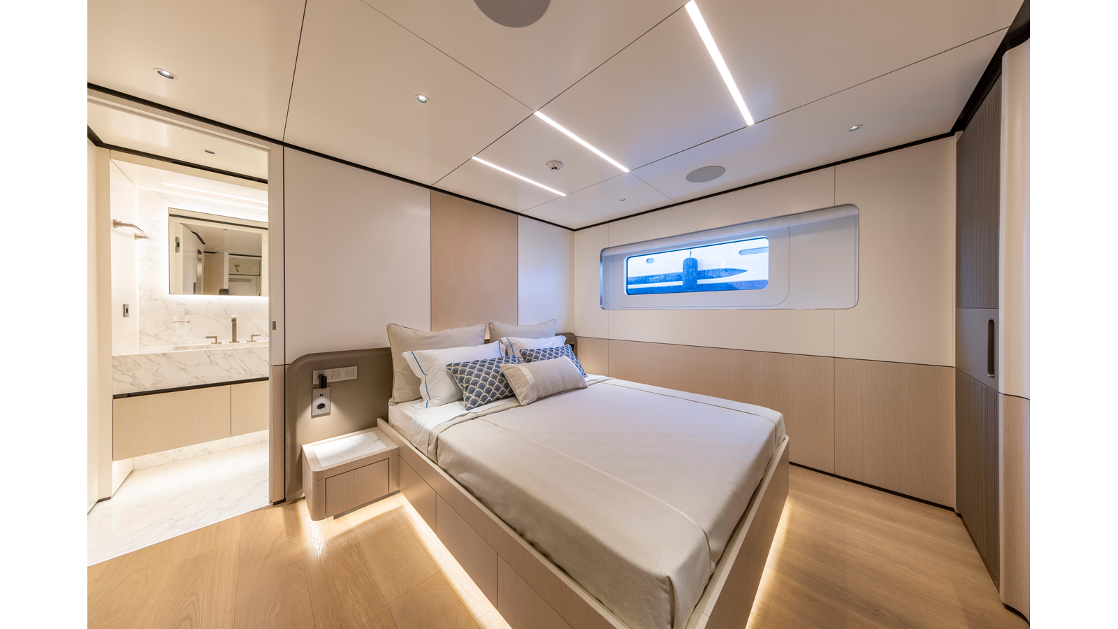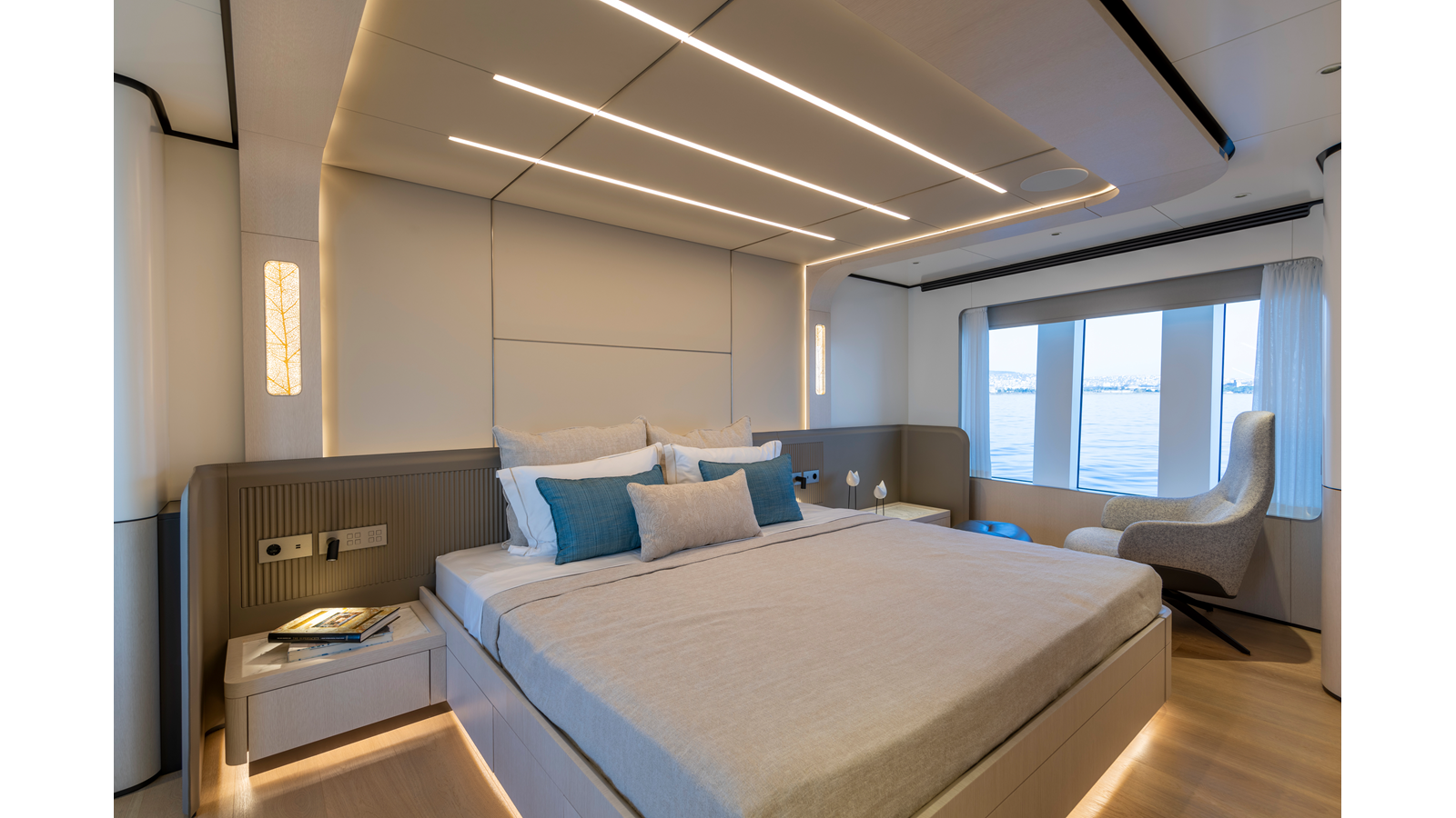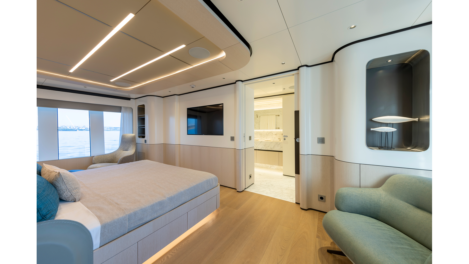 The master suite, located on the main deck, uses materials such as Light Oak and White Lacquer, complemented by brushed steel details and accents of blue. The guest staterooms on the lower deck, with design incorporating Dove Grey Leather headboards and Greige leather accents, ensure comfort and privacy, each featuring an en-suite bathroom.