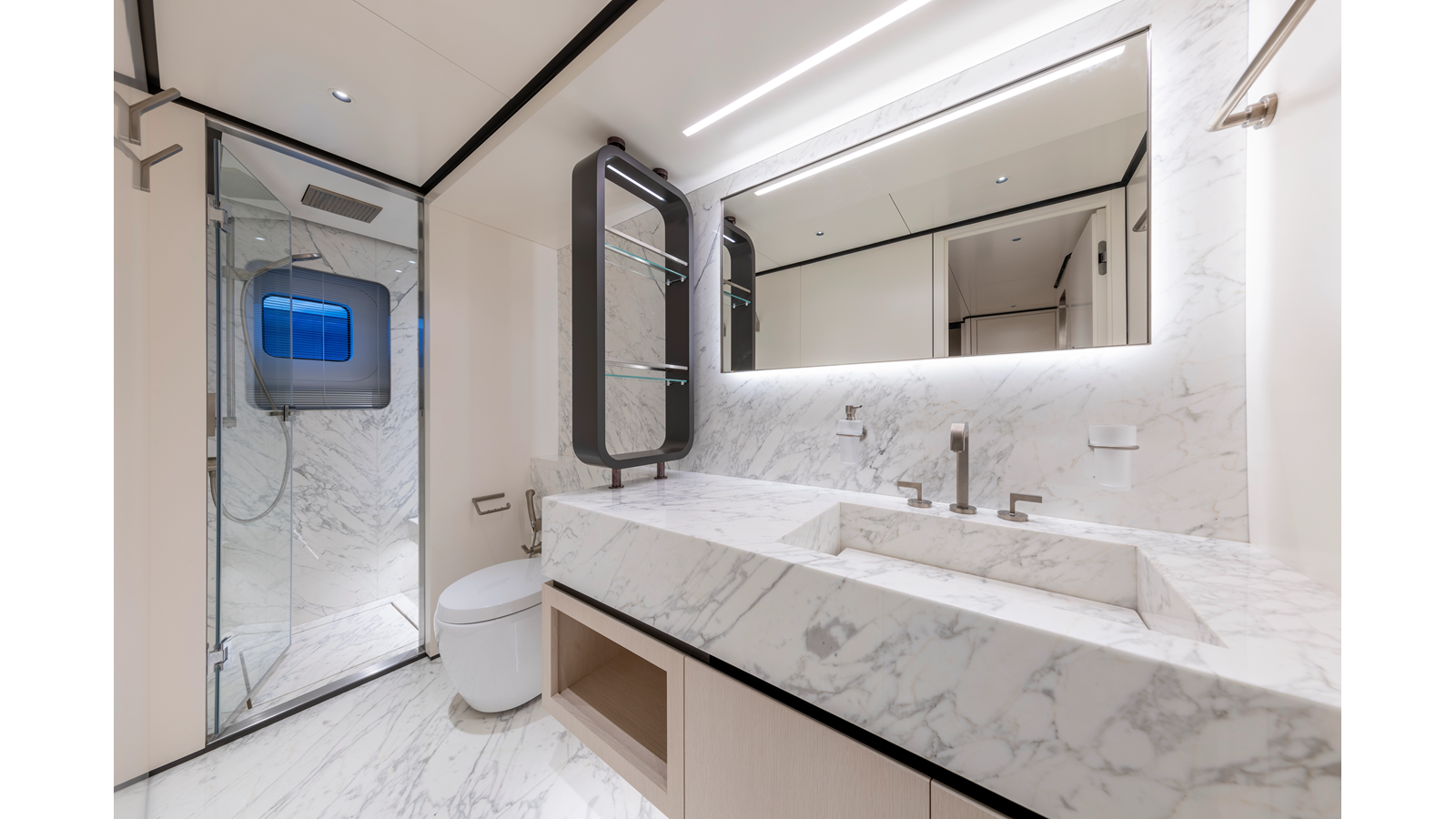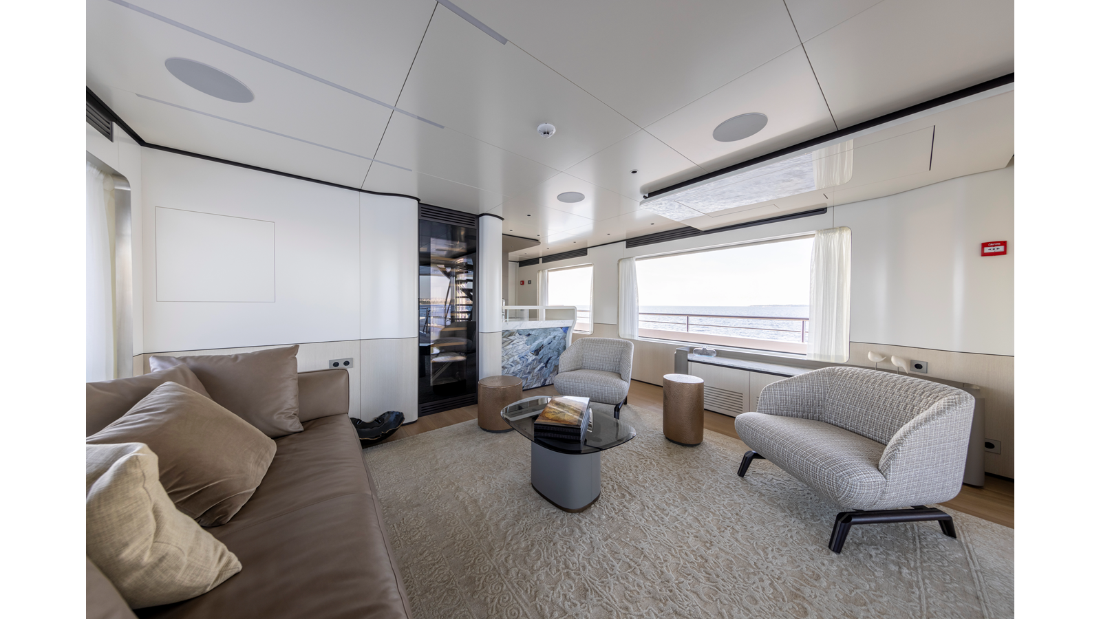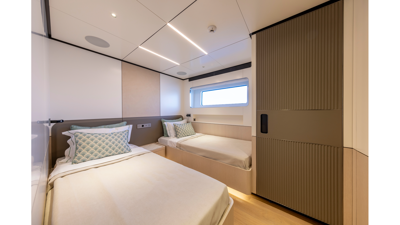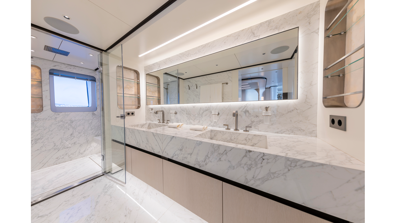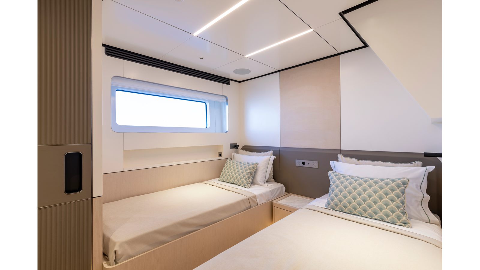 The master suite, located on the main deck, uses materials such as Light Oak and White Lacquer, complemented by brushed steel details and accents of blue. The guest staterooms on the lower deck, with design incorporating Dove Grey Leather headboards and Greige leather accents, ensure comfort and privacy, each featuring an en-suite bathroom.