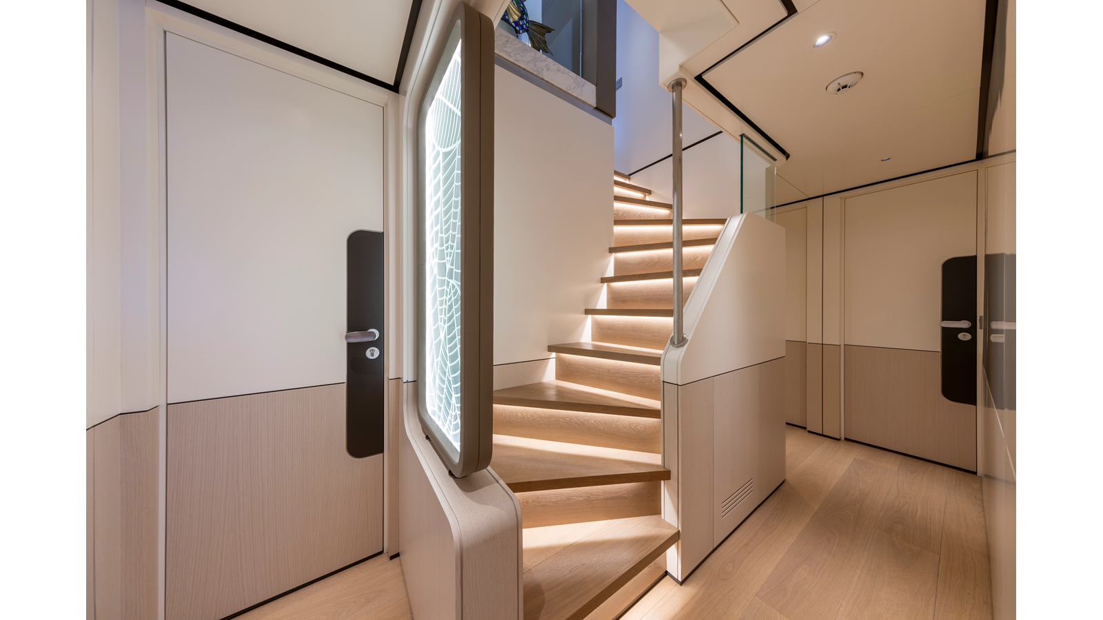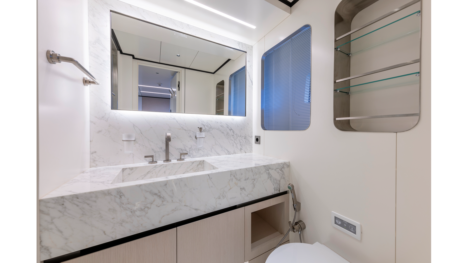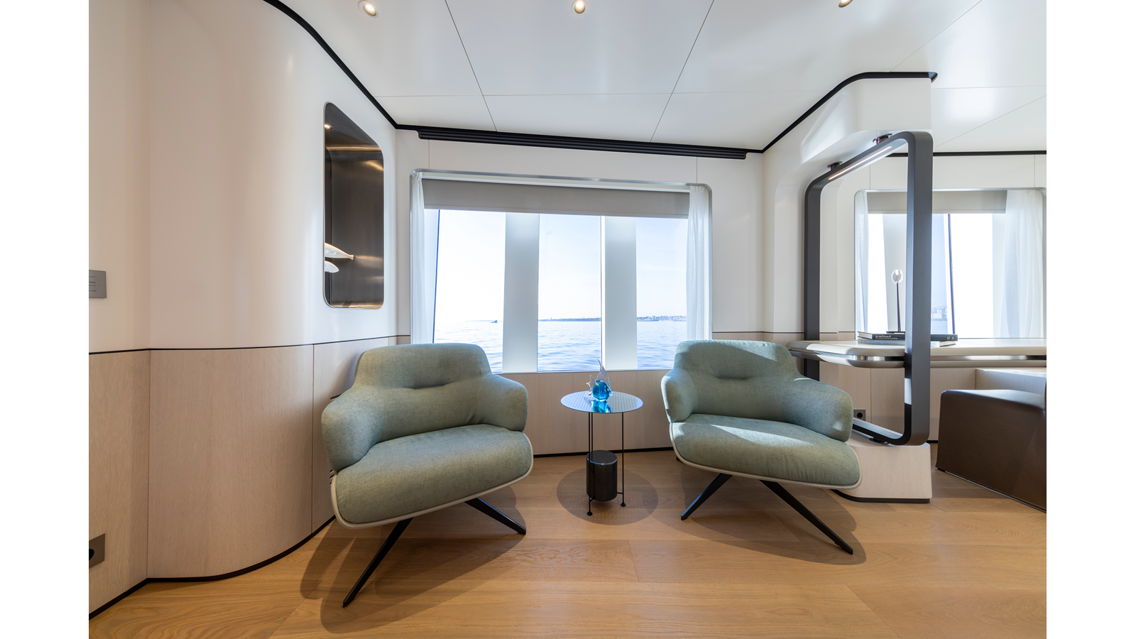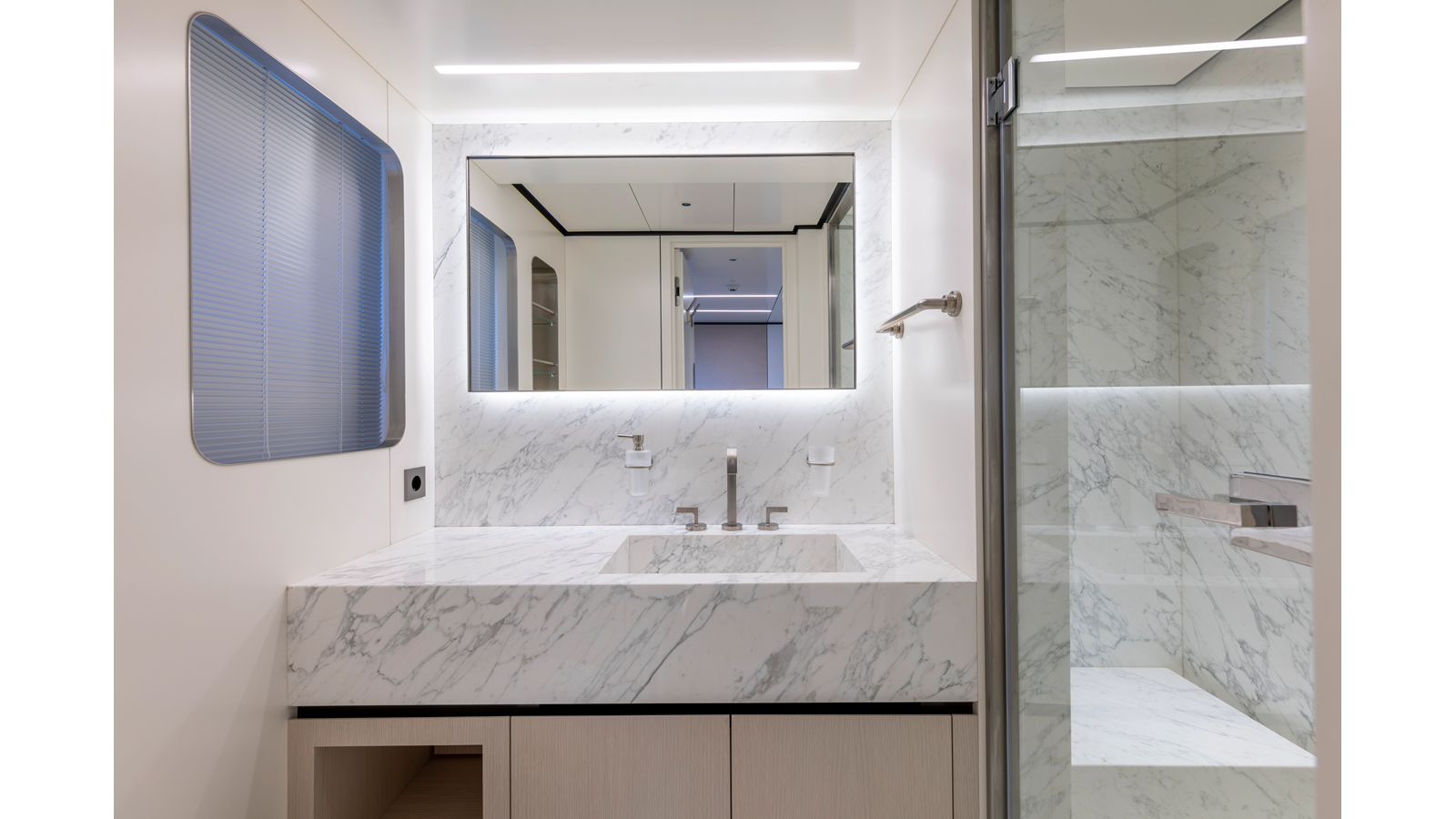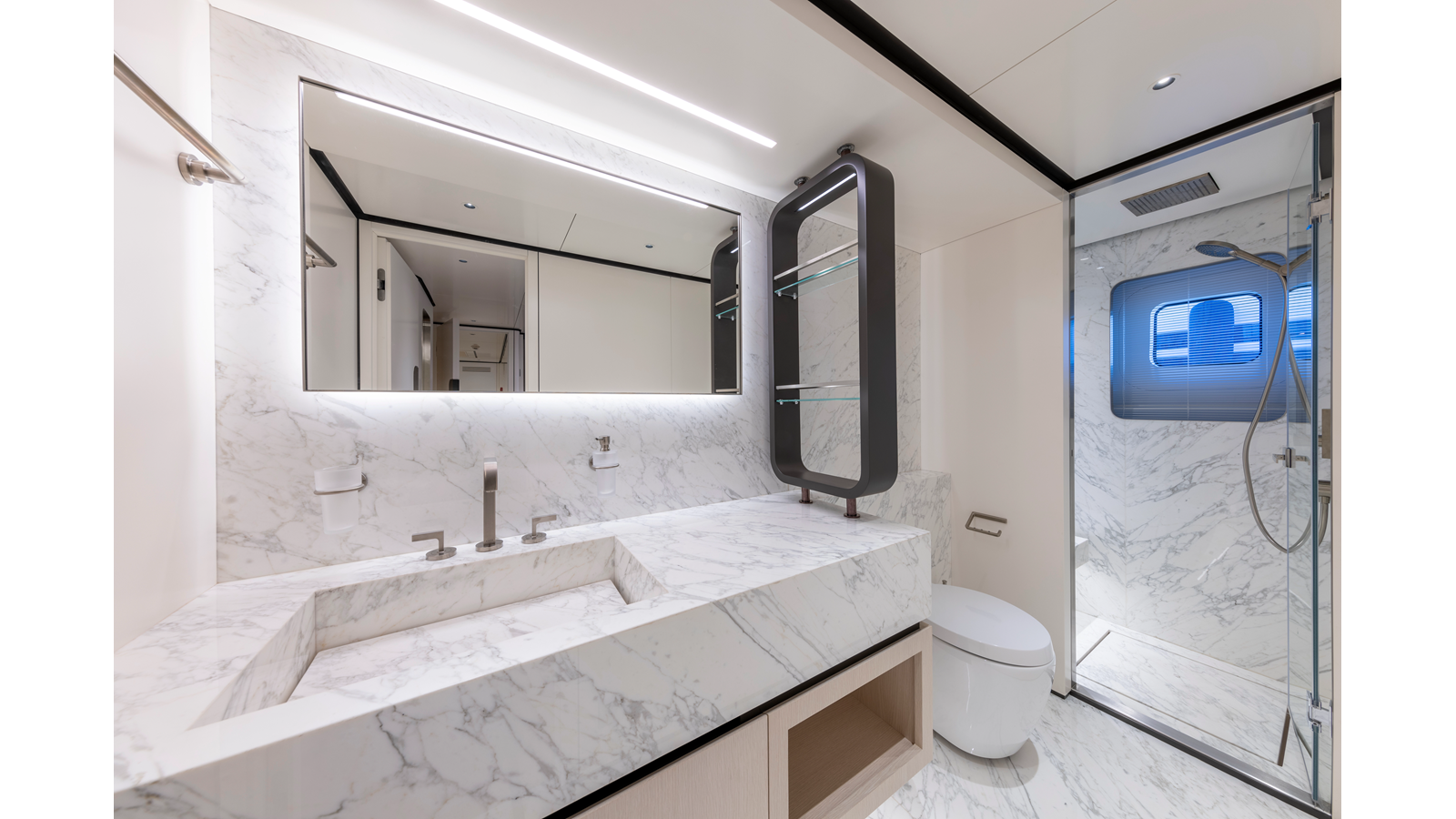 The master suite, located on the main deck, uses materials such as Light Oak and White Lacquer, complemented by brushed steel details and accents of blue. The guest staterooms on the lower deck, with design incorporating Dove Grey Leather headboards and Greige leather accents, ensure comfort and privacy, each featuring an en-suite bathroom.