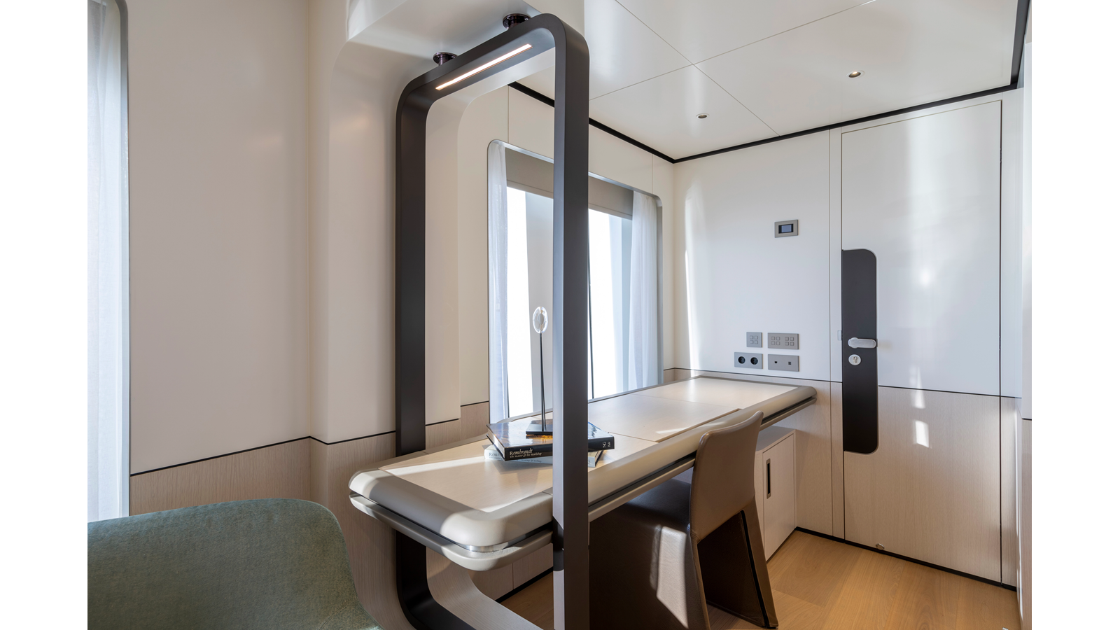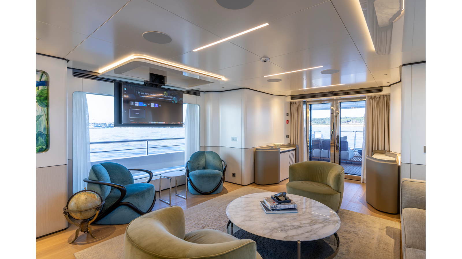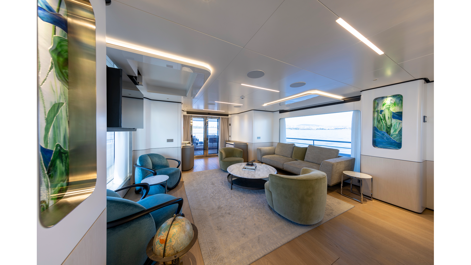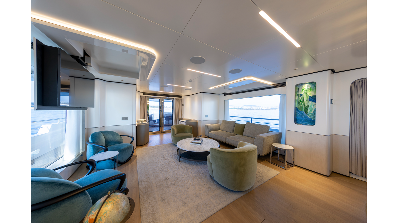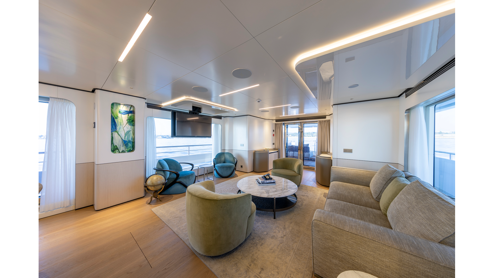 The master suite, located on the main deck, uses materials such as Light Oak and White Lacquer, complemented by brushed steel details and accents of blue. The guest staterooms on the lower deck, with design incorporating Dove Grey Leather headboards and Greige leather accents, ensure comfort and privacy, each featuring an en-suite bathroom.