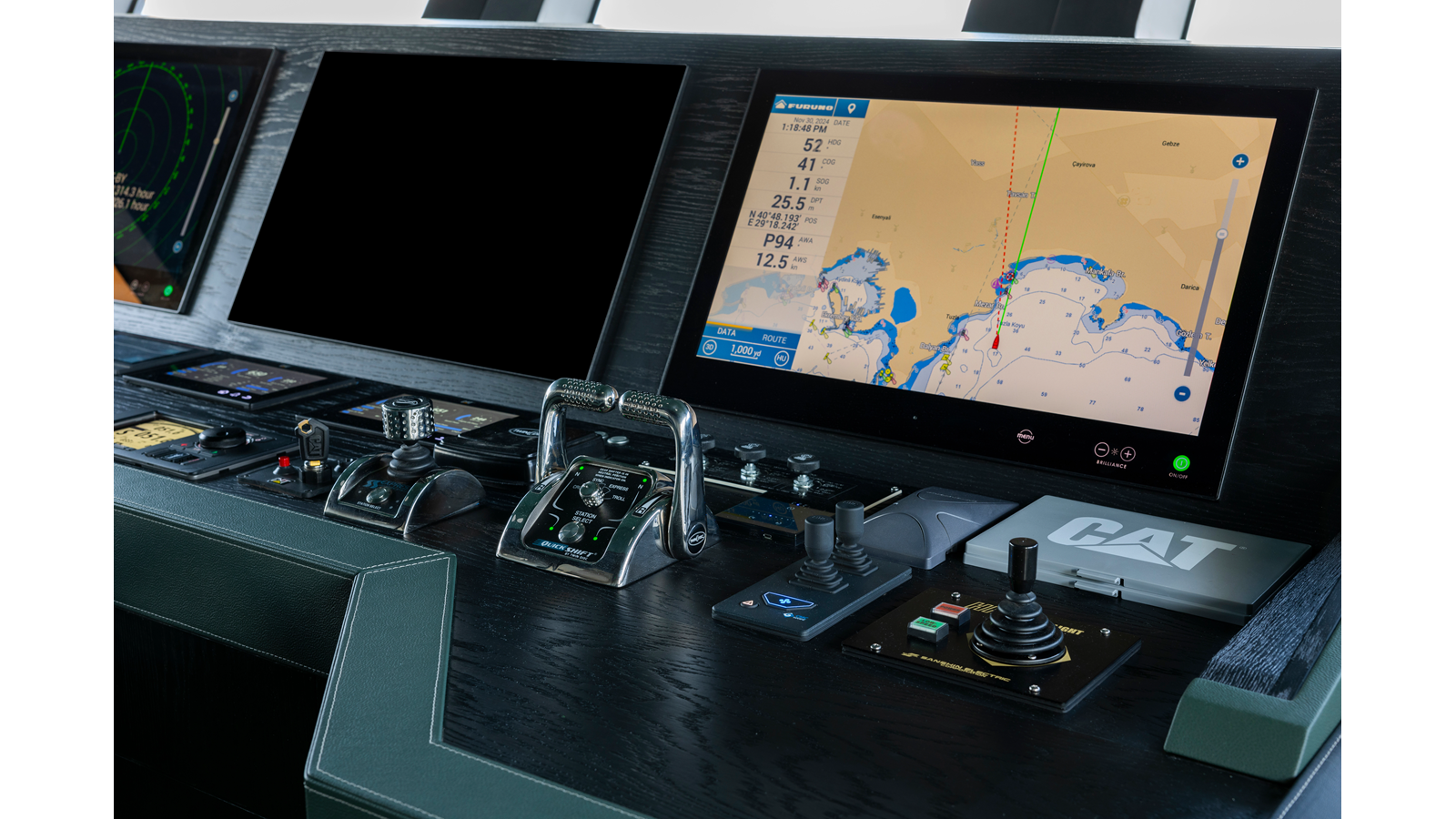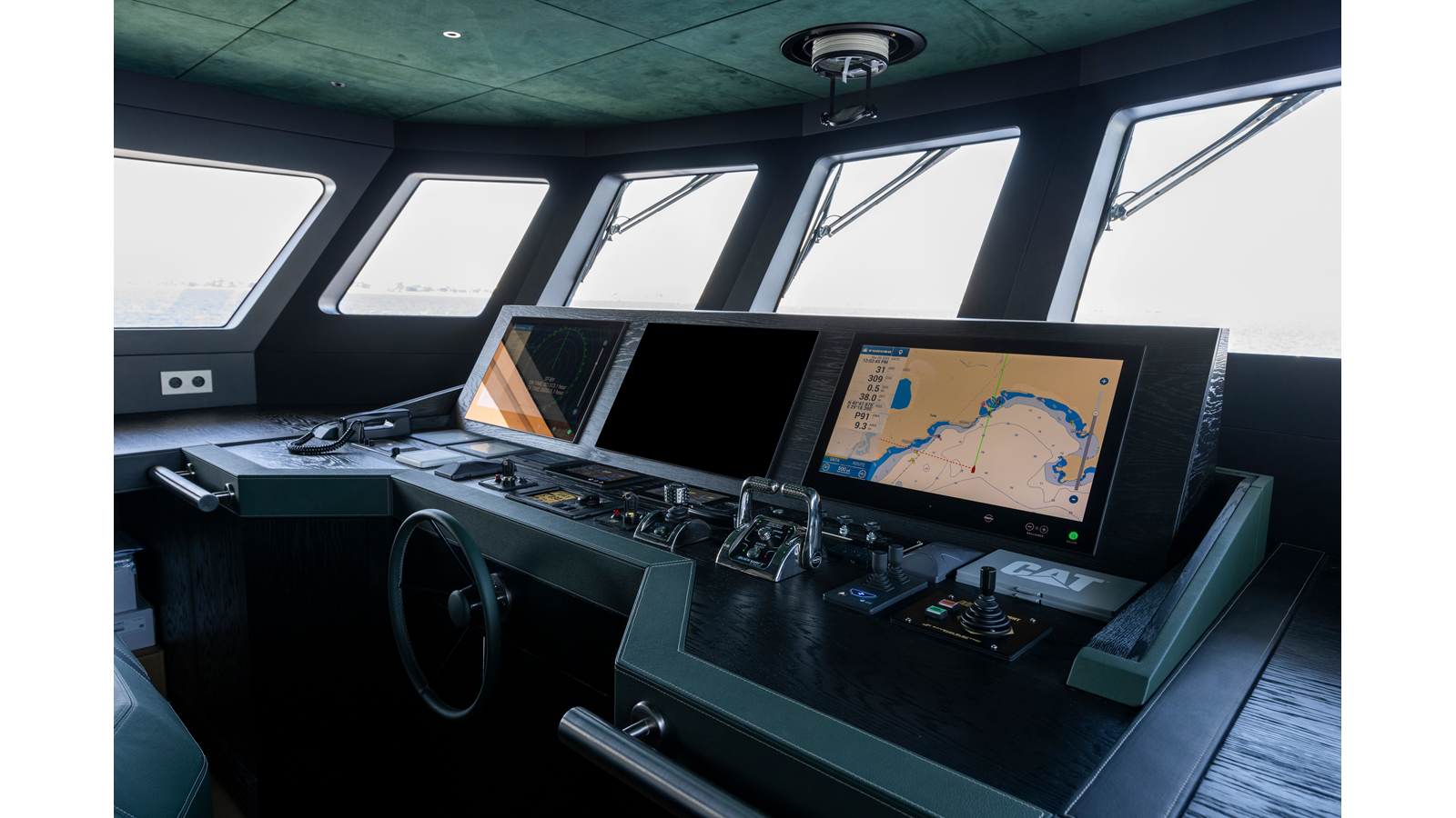 The wheelhouse, surrounded by expansive windows, is equipped with state-of-the-art navigation and communication systems to ensure optimal safety and precision navigation.