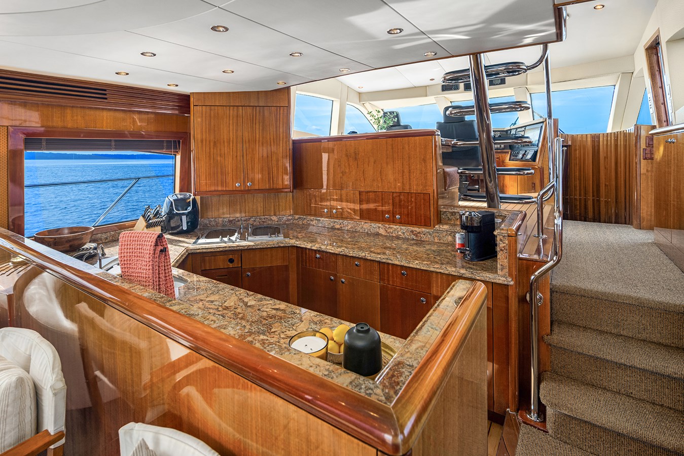 • The Galley is spacious with ample Rosa Boudreaux granite counter tops & high gloss teak cabinets and drawers.