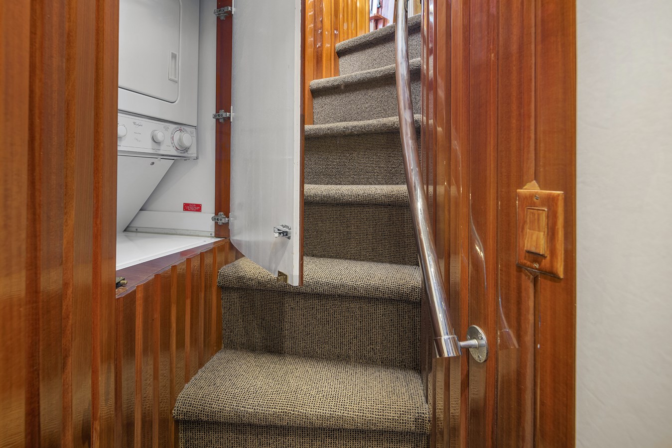 • Access to the Flybridge from the Pilothouse is up a couple steps thru a Plexiglas door w/custom stainless steel pins to lock pins to lock door.