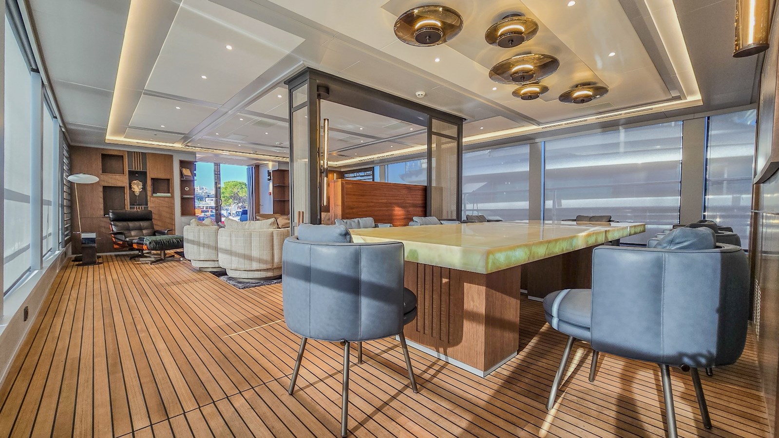 Main deck with day head, main saloon, formal dining area, pantry and wheelhouse