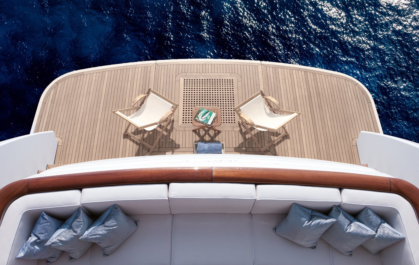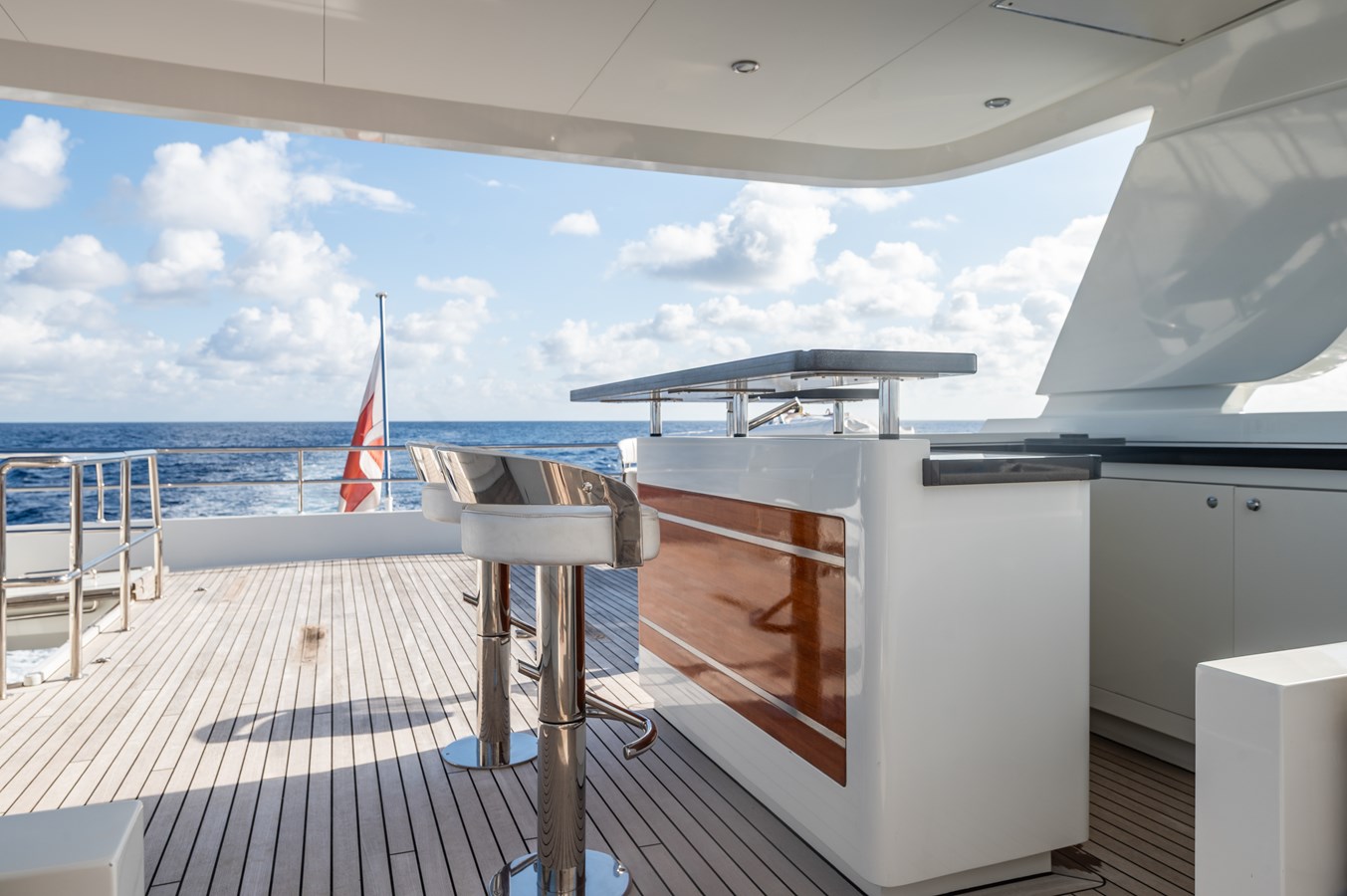 Designed for sun-soaked days, the extremely spacious 85m² flybridge includes generous seating with tables and a feature bar incorporating a BBQ. The spacious aft deck is set up for al fresco dining, and the swim platform lowers into the sea to act as a substantial swimming ladder or can be raised up to offer easy shore access.