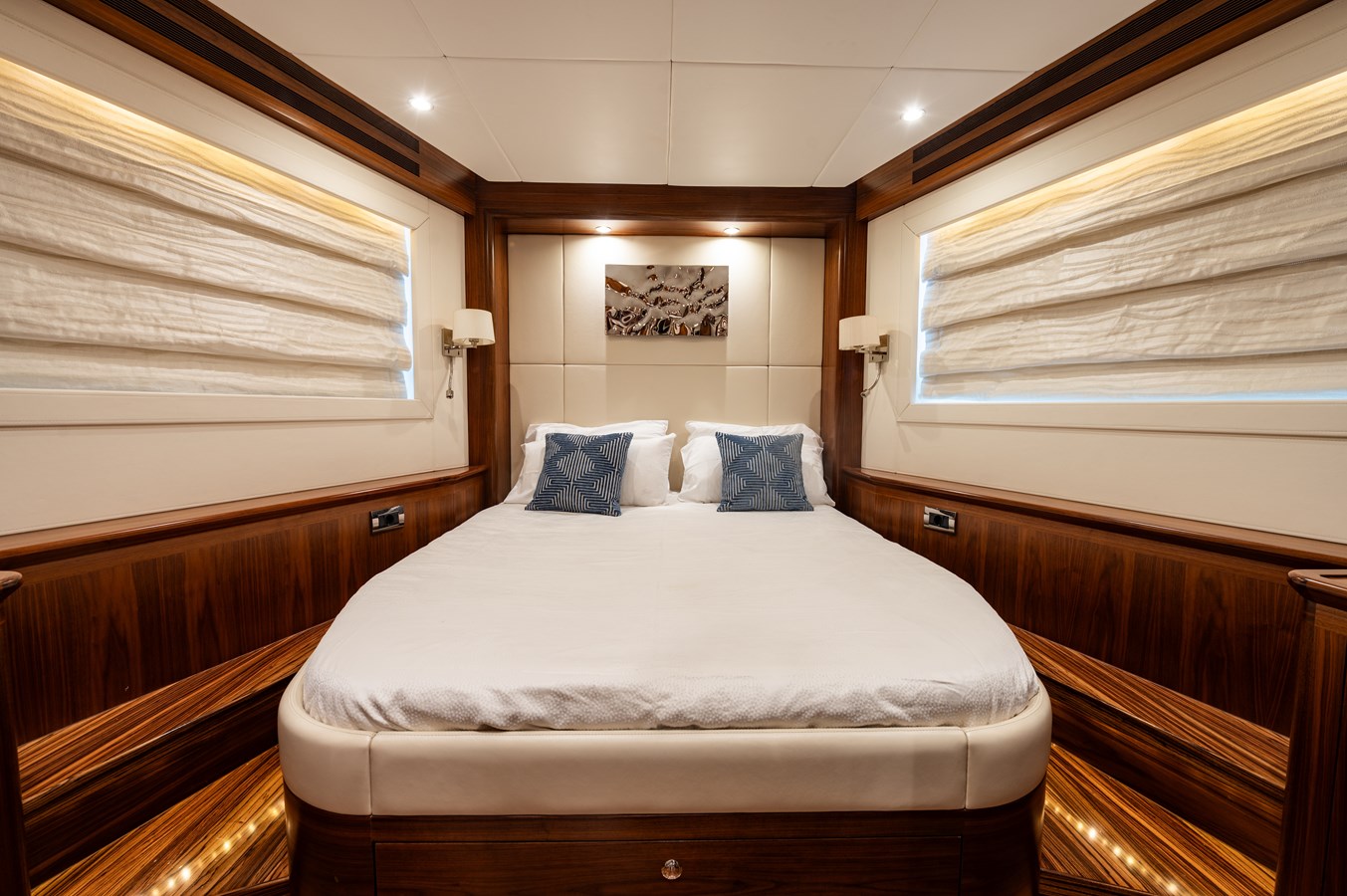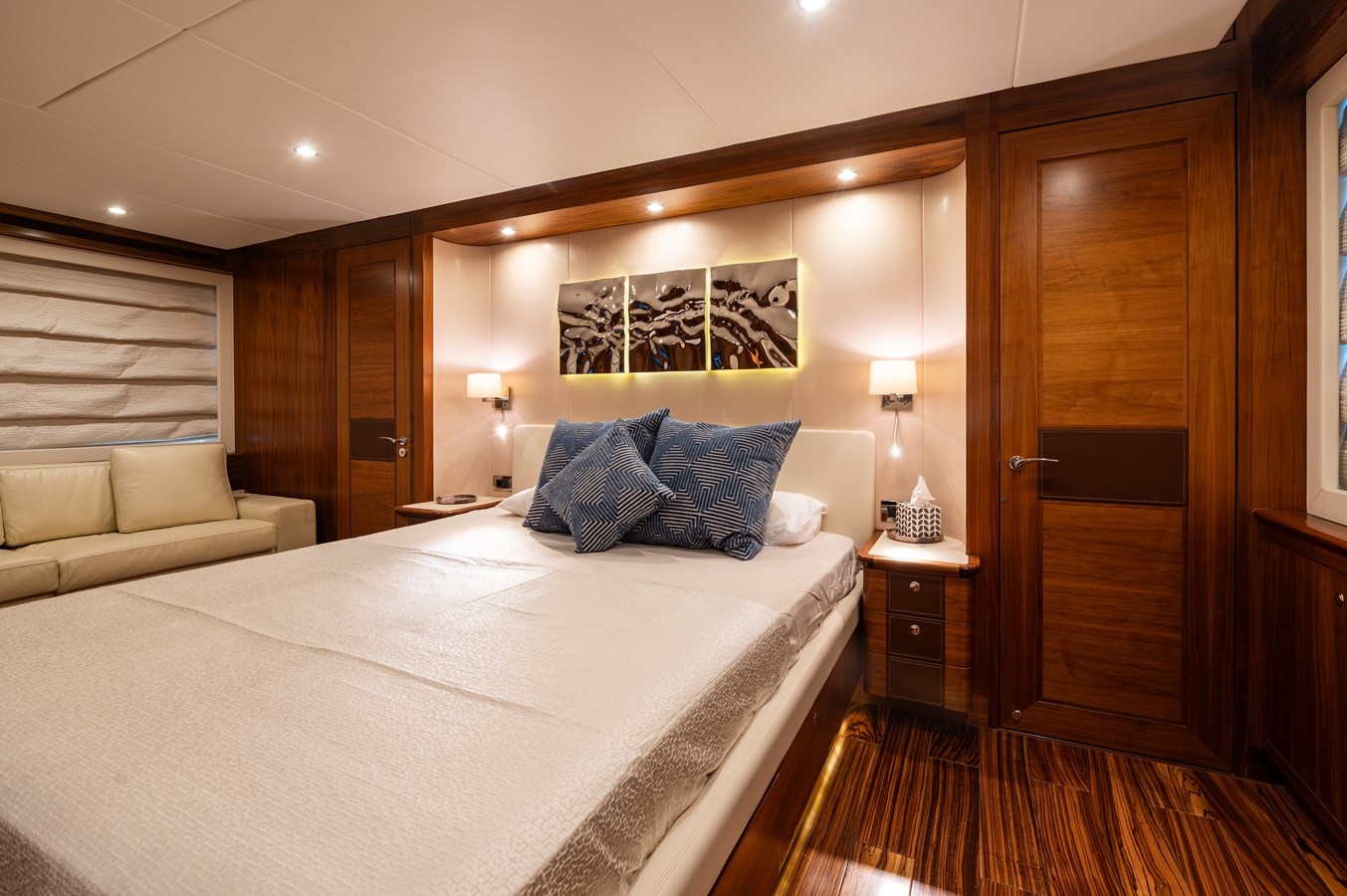Below deck, four comfortable cabins on board accommodate up to eight guests. The full beam master suite benefits from lots of natural light from the large windows and contemporary design features. Boasting 24 square meters of floor space, the suite includes a study space, sitting area, ensuite bathroom with a bath and a walk-in closet.