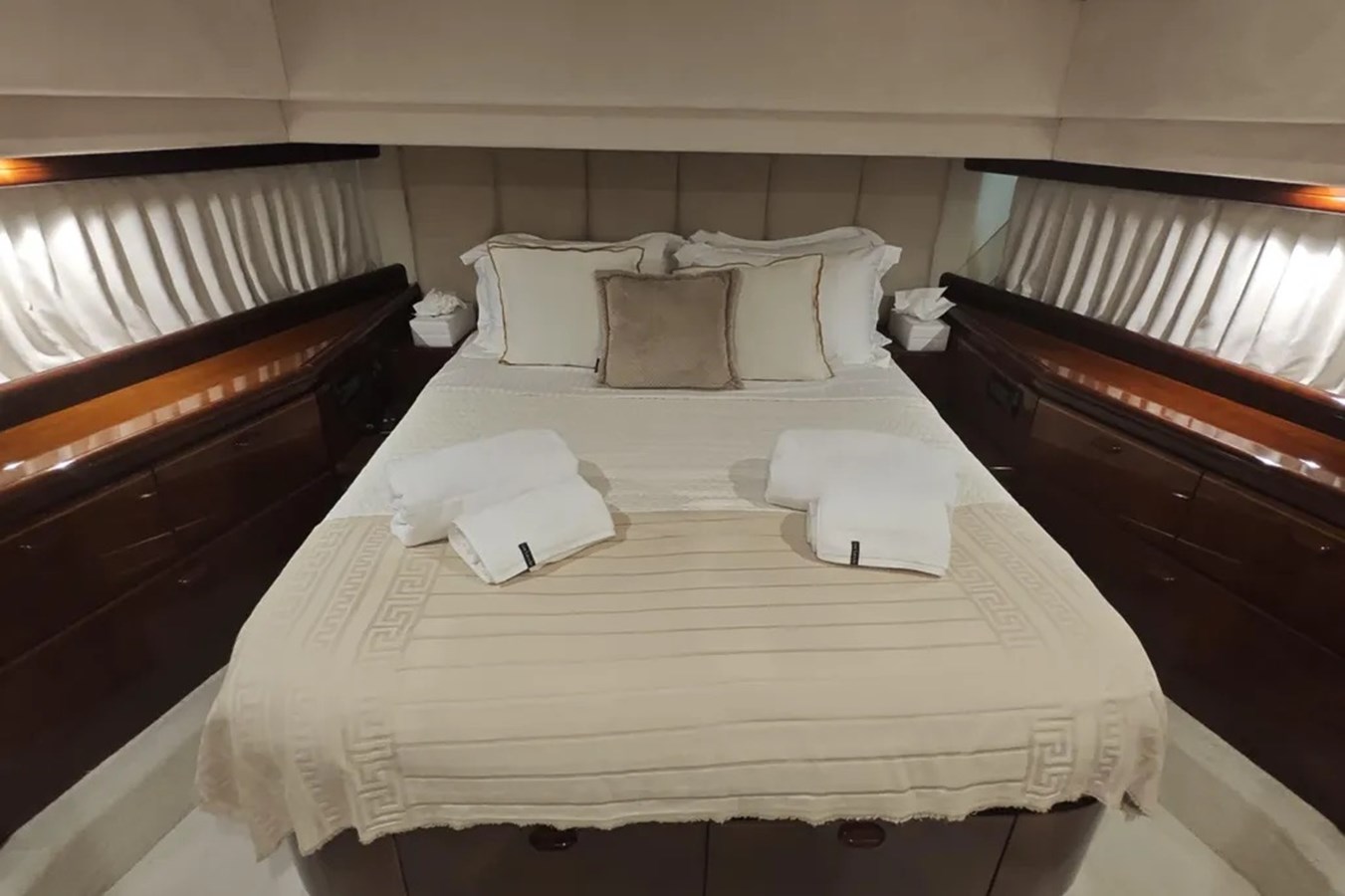 Spacious and tastefully designed, the interior offers a full-beam master cabin, a forward VIP cabin, and two twin cabins, each with private heads. Separate crew access ensures guest privacy.
