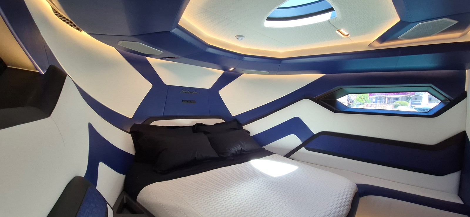 Hull 33 features a White & Black exterior with blue accents, paired with Huracán-style helm seats, creating a clear connection to Lamborghini’s automotive identity.