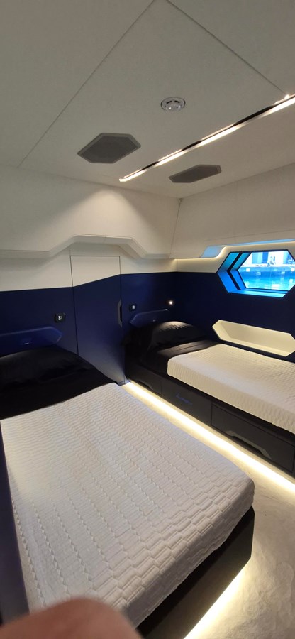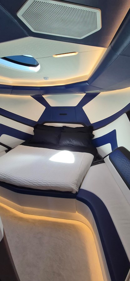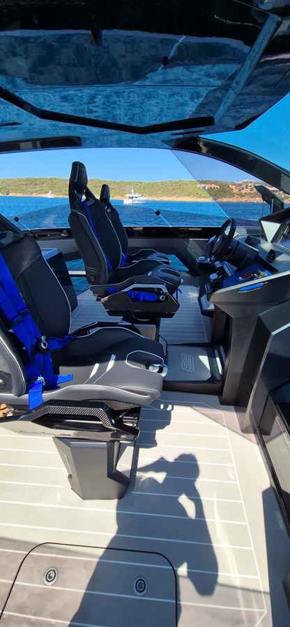 Tecnomar for Lamborghini 63 - Hull 33 - Brand new - immediately available - a truly unique opportunity !!! The Tecnomar for Lamborghini 63 is a yacht strongly inspired by Lamborghini’s design language, with sharp lines, a sporty silhouette and a cockpit reminiscent of the brand’s supercars. Hull 33 features a White & Black exterior with blue accents , paired with Huracán-style helm seats , creating a clear connection to Lamborghini’s automotive identity. If this colour combination does not suit the buyer, it is entirely possible to change the exterior colours according to their preferences.