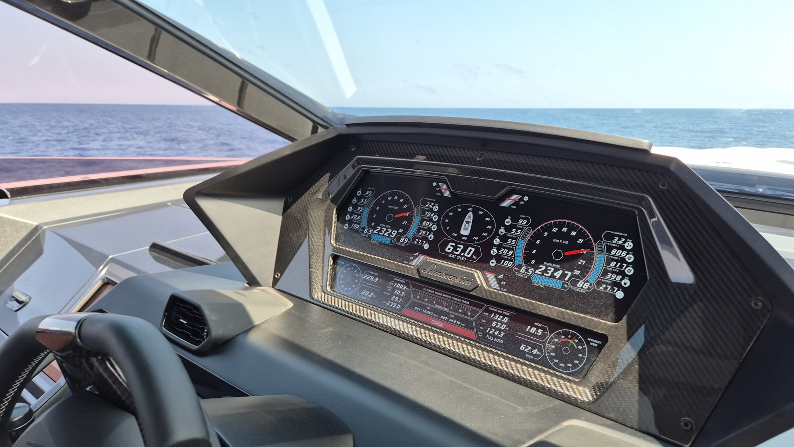 The Tecnomar for Lamborghini 63 is a yacht strongly inspired by Lamborghini’s design language, with sharp lines, a sporty silhouette and a cockpit reminiscent of the brand’s supercars.