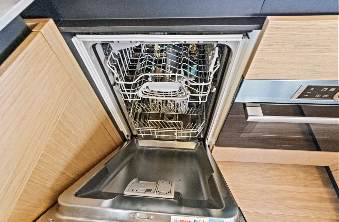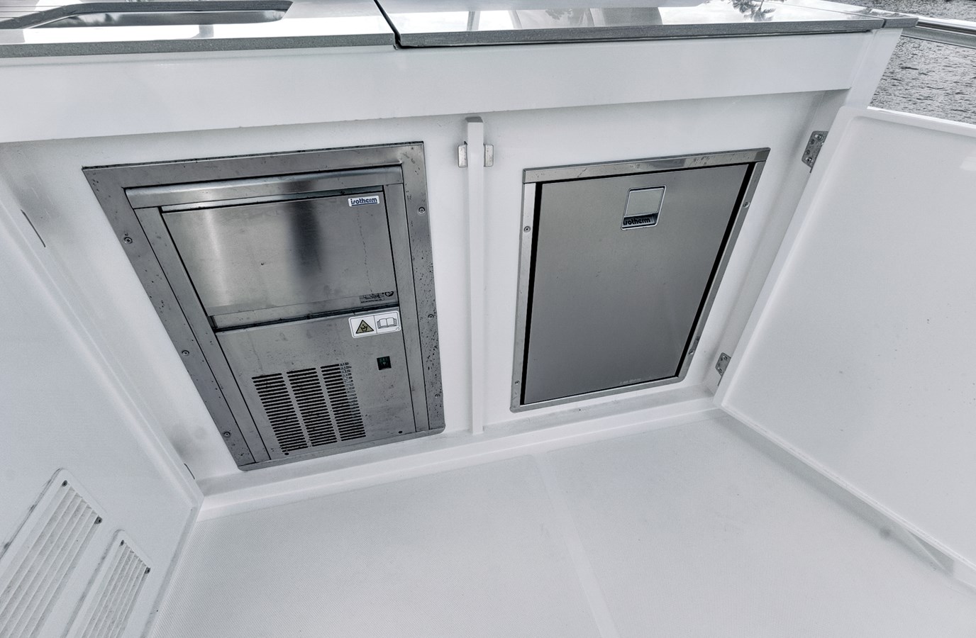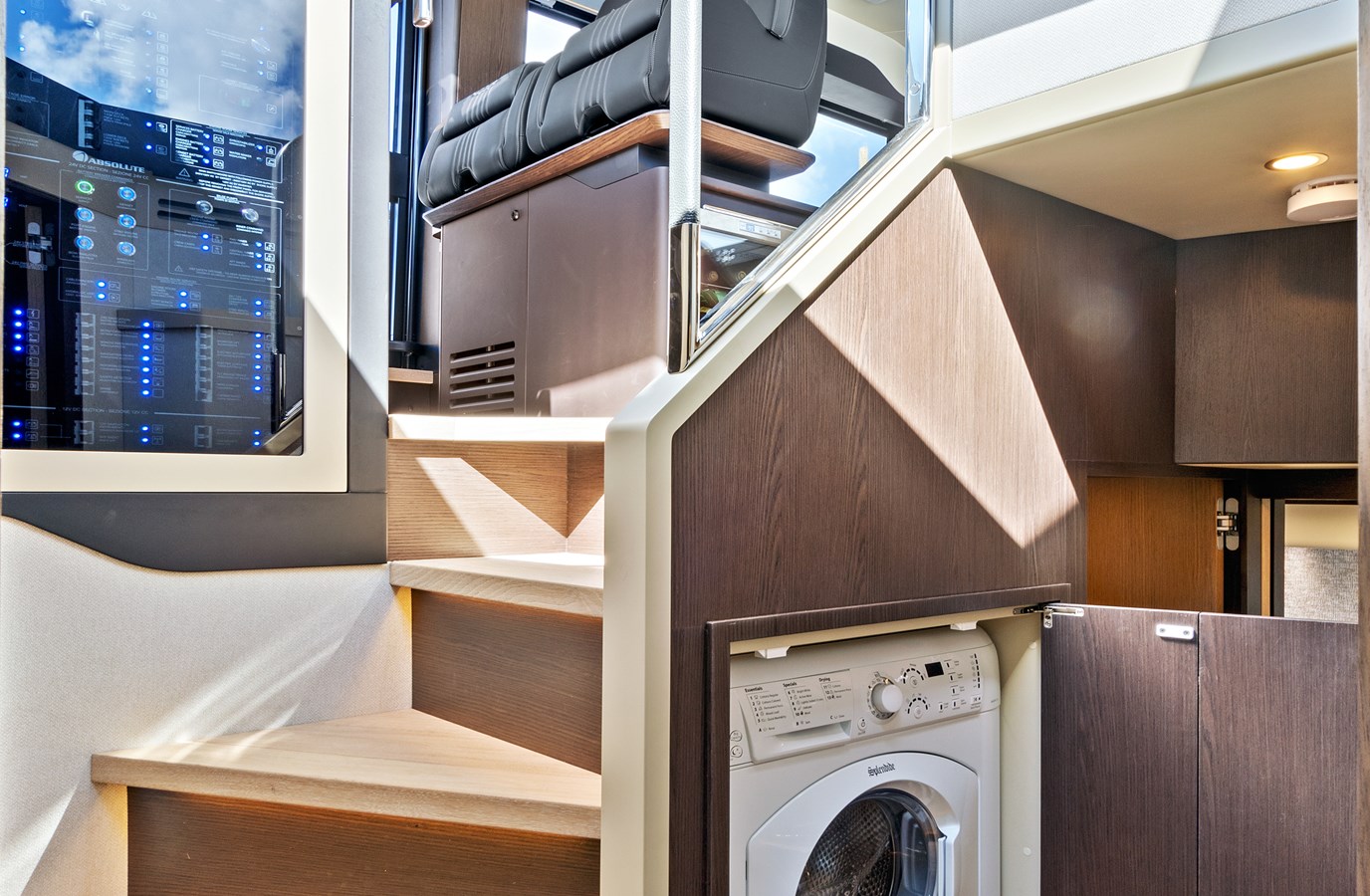 The use of extensive glazing, a familiar Absolute trademark, is particularly visible in the saloon, from where there are fantastic 360-degree views. In addition to air conditioning, natural ventilation can be provided by the electrically-controlled vertically sliding windows. The galley is fully equipped, and, unusually for boats of this size, there is also a spacious pantry.