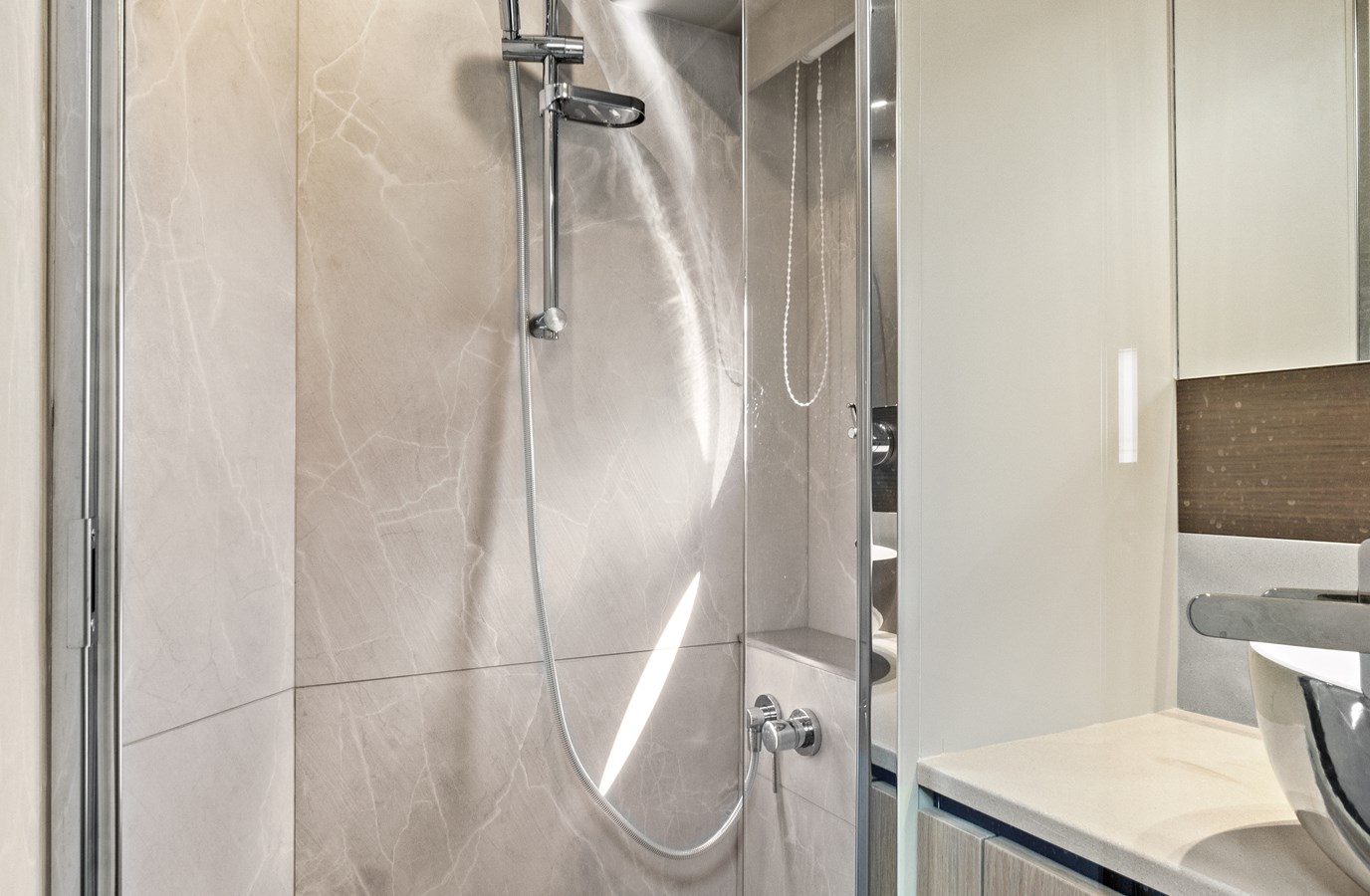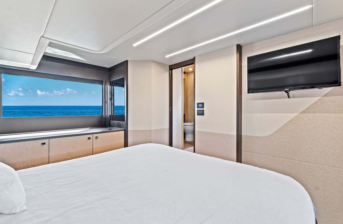 The bow location of the master cabin ensures peace, silence and privacy. Its full-beam layout optimises space, with a large double berth accessible from all three sides, extensive cupboards and storage units, and a superb marble bathroom.
