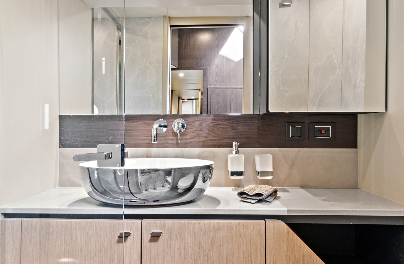 The VIP guest cabin midships could in every way be considered a second master, in terms of space, headroom, en-suite bathroom and finish. The third guest cabin has an electricalsystem, fitted as standard, for seamless transformation from twin berths to double. In addition, there is a versatile crew cabin, with practical access from the stern platform.