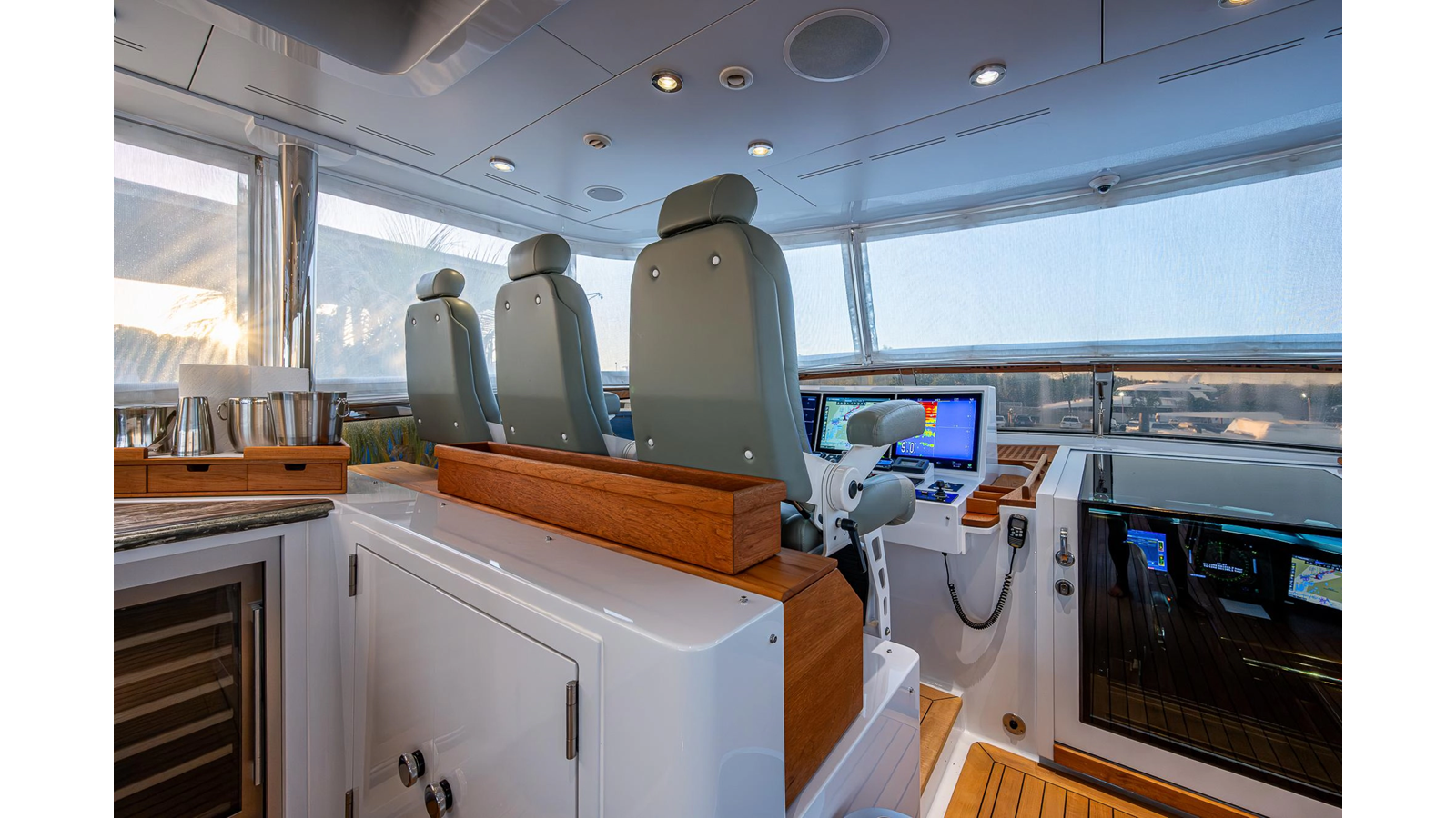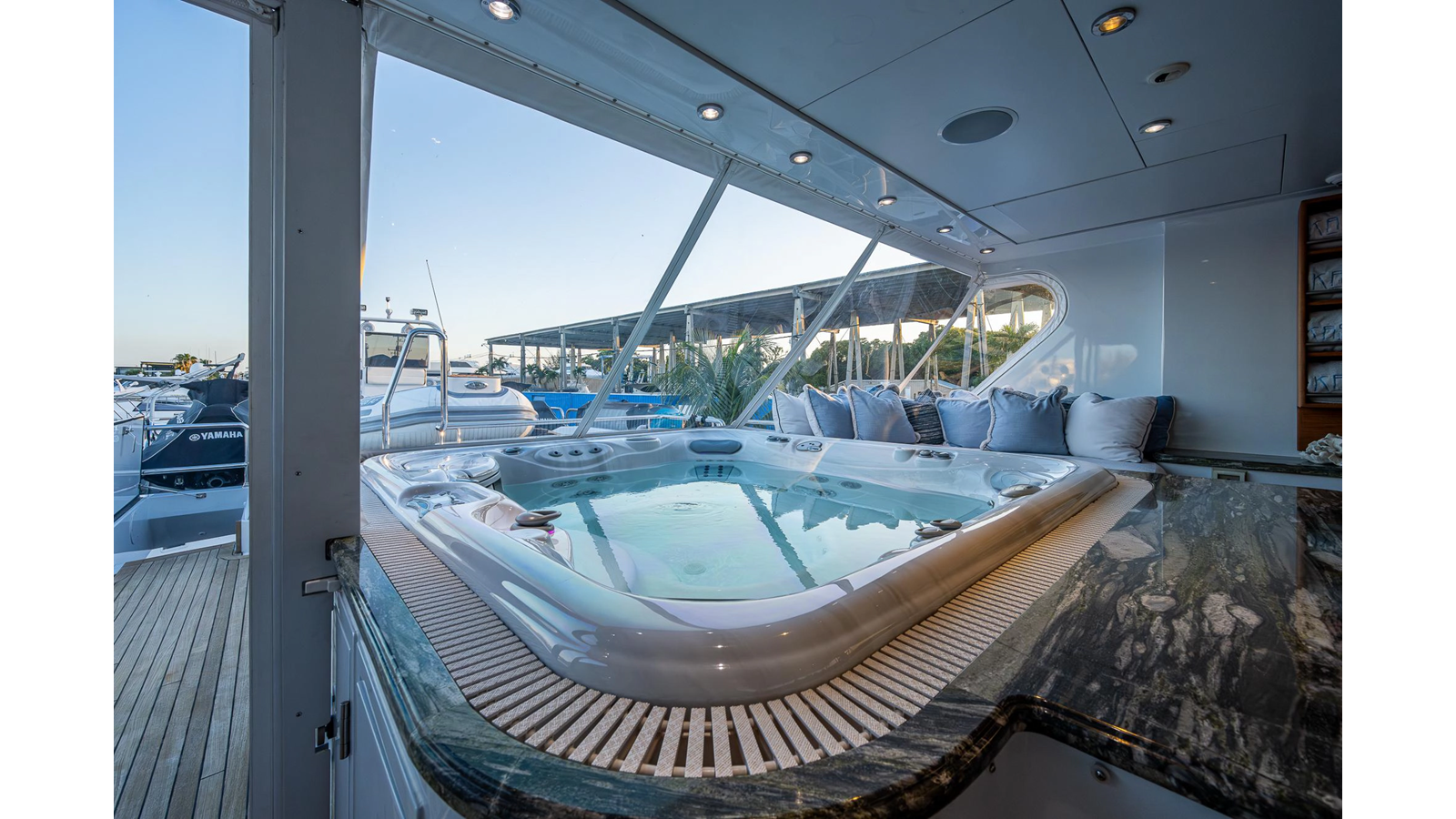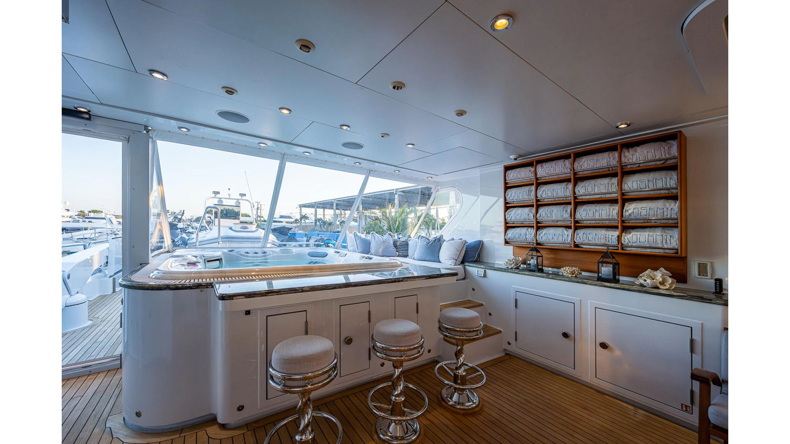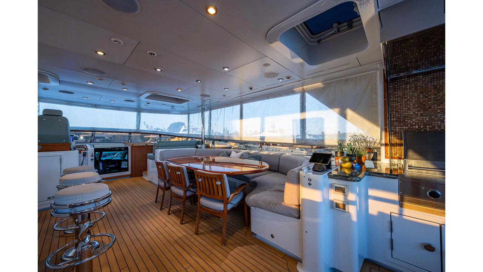 What is unique about this flybridge, is that it doubles as an additional climate-controlled, fully enclosed guest space, featuring an additional dining area with seating for eight, and a table that electrically moves out, for easy seating access. The area also features a full bar, a fully hooded grill, and Jacuzzi spa. There is even a full steering/navigation station forward, with Stidd chairs, allowing for climate-controlled navigation from the second deck. The area also has a technologically advanced automatic plexiglass door, immediately adjacent to the Jacuzzi, which operates to keep the cool air-conditioned environment in, on hot summer days outside. Aft of this area is of course a spacious deck for sunning.