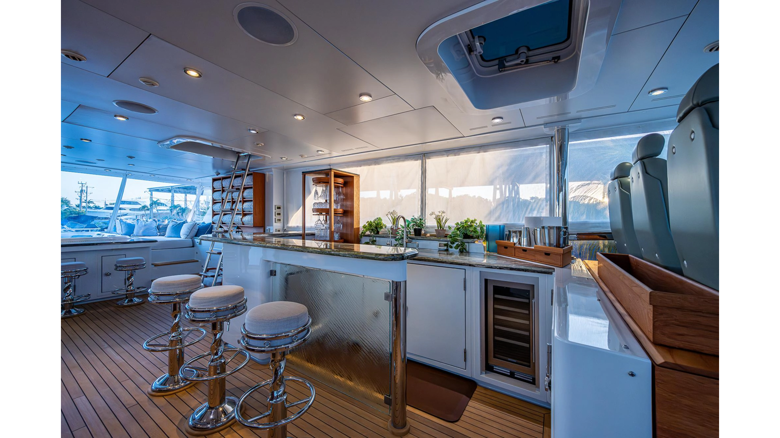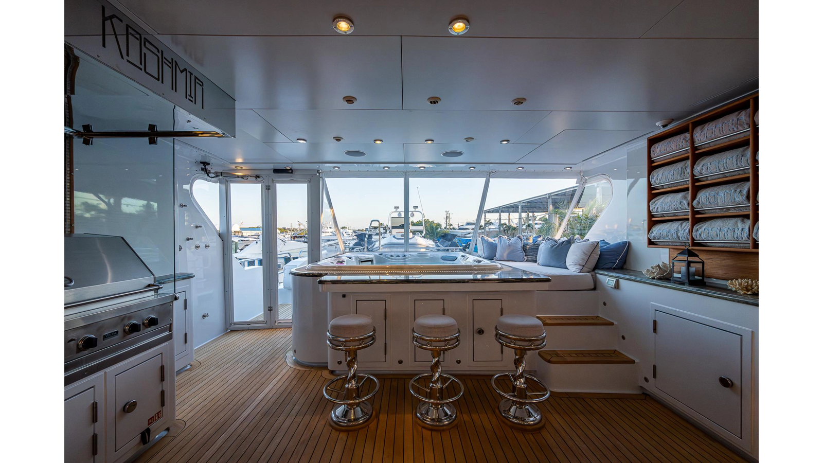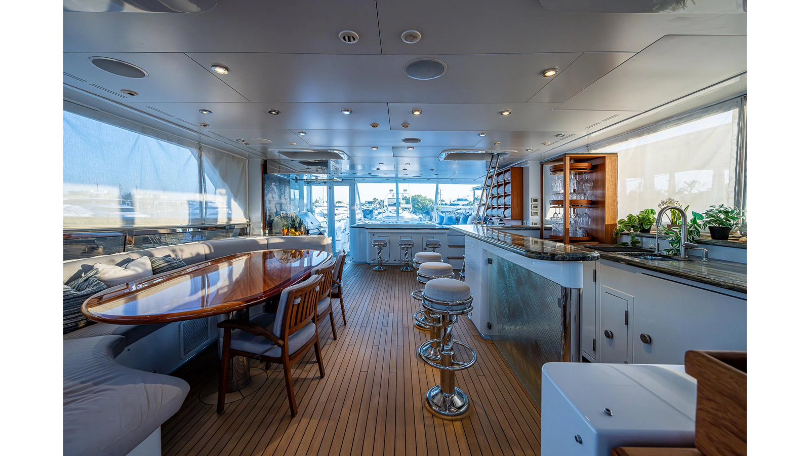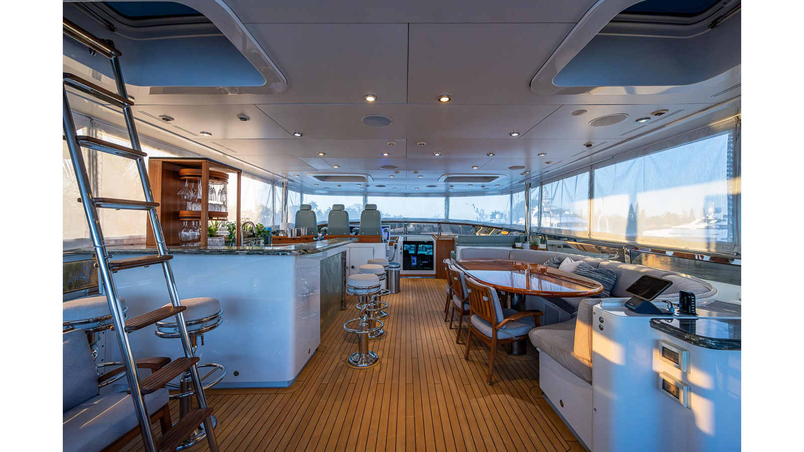 What is unique about this flybridge, is that it doubles as an additional climate-controlled, fully enclosed guest space, featuring an additional dining area with seating for eight, and a table that electrically moves out, for easy seating access. The area also features a full bar, a fully hooded grill, and Jacuzzi spa. There is even a full steering/navigation station forward, with Stidd chairs, allowing for climate-controlled navigation from the second deck. The area also has a technologically advanced automatic plexiglass door, immediately adjacent to the Jacuzzi, which operates to keep the cool air-conditioned environment in, on hot summer days outside. Aft of this area is of course a spacious deck for sunning.