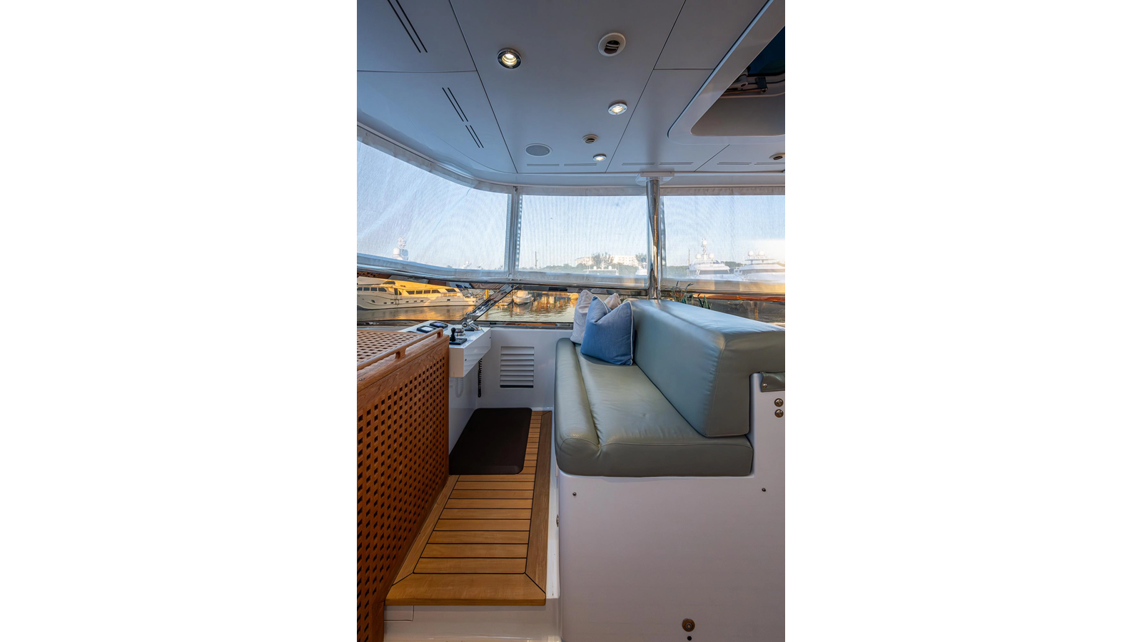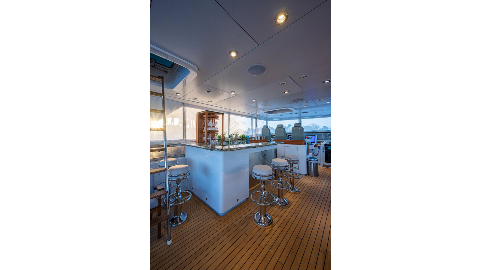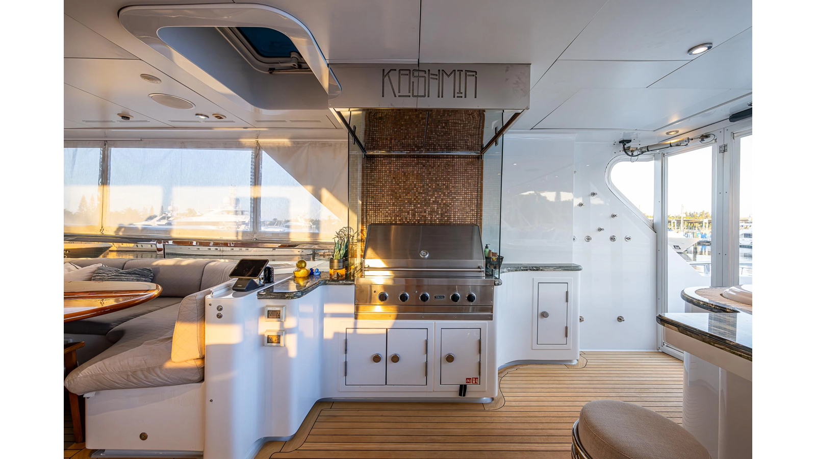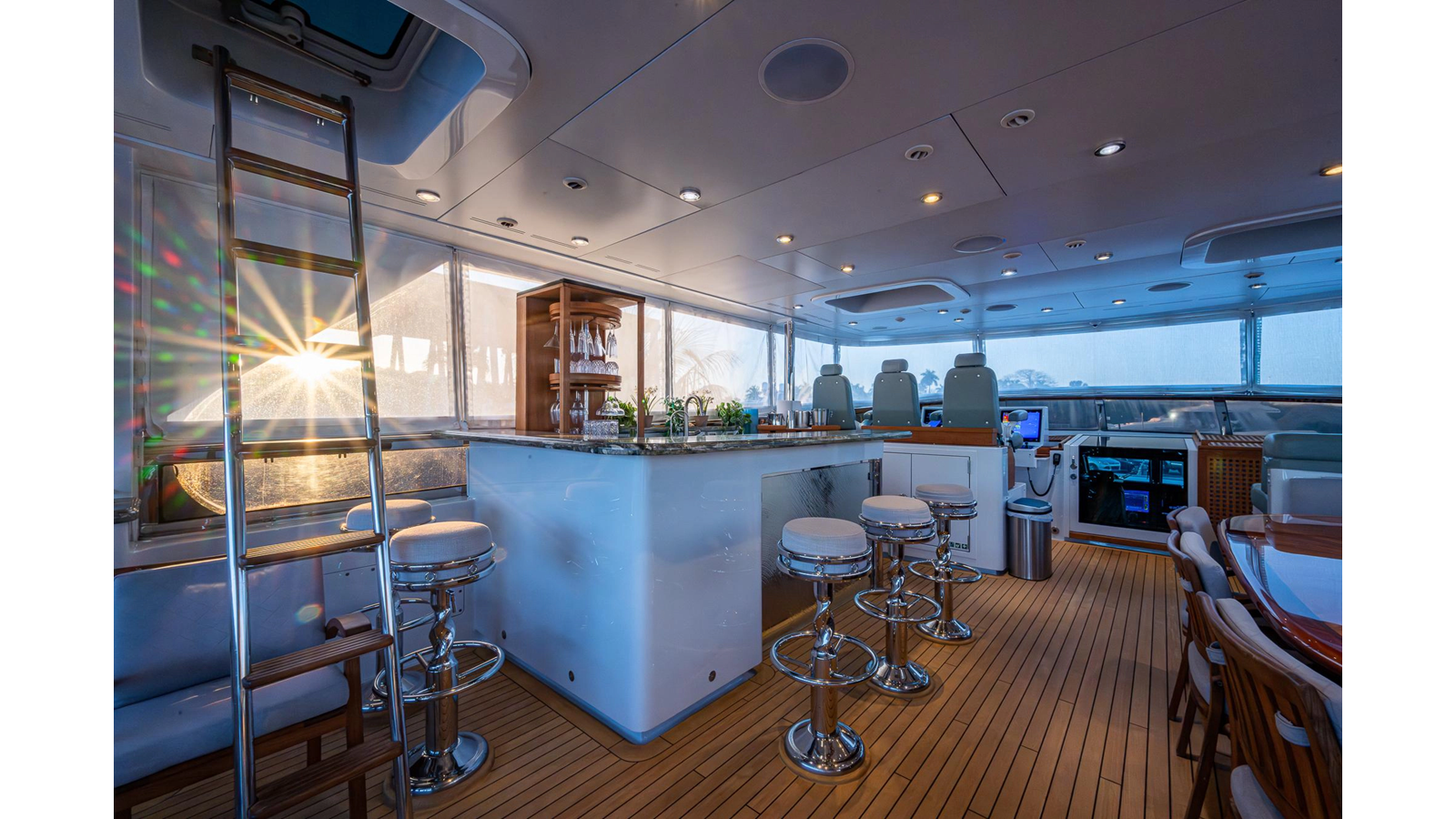 What is unique about this flybridge, is that it doubles as an additional climate-controlled, fully enclosed guest space, featuring an additional dining area with seating for eight, and a table that electrically moves out, for easy seating access. The area also features a full bar, a fully hooded grill, and Jacuzzi spa. There is even a full steering/navigation station forward, with Stidd chairs, allowing for climate-controlled navigation from the second deck. The area also has a technologically advanced automatic plexiglass door, immediately adjacent to the Jacuzzi, which operates to keep the cool air-conditioned environment in, on hot summer days outside. Aft of this area is of course a spacious deck for sunning.