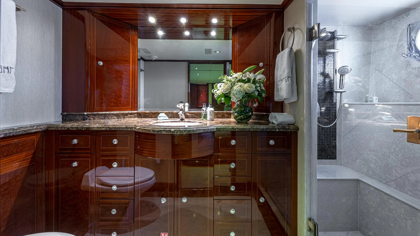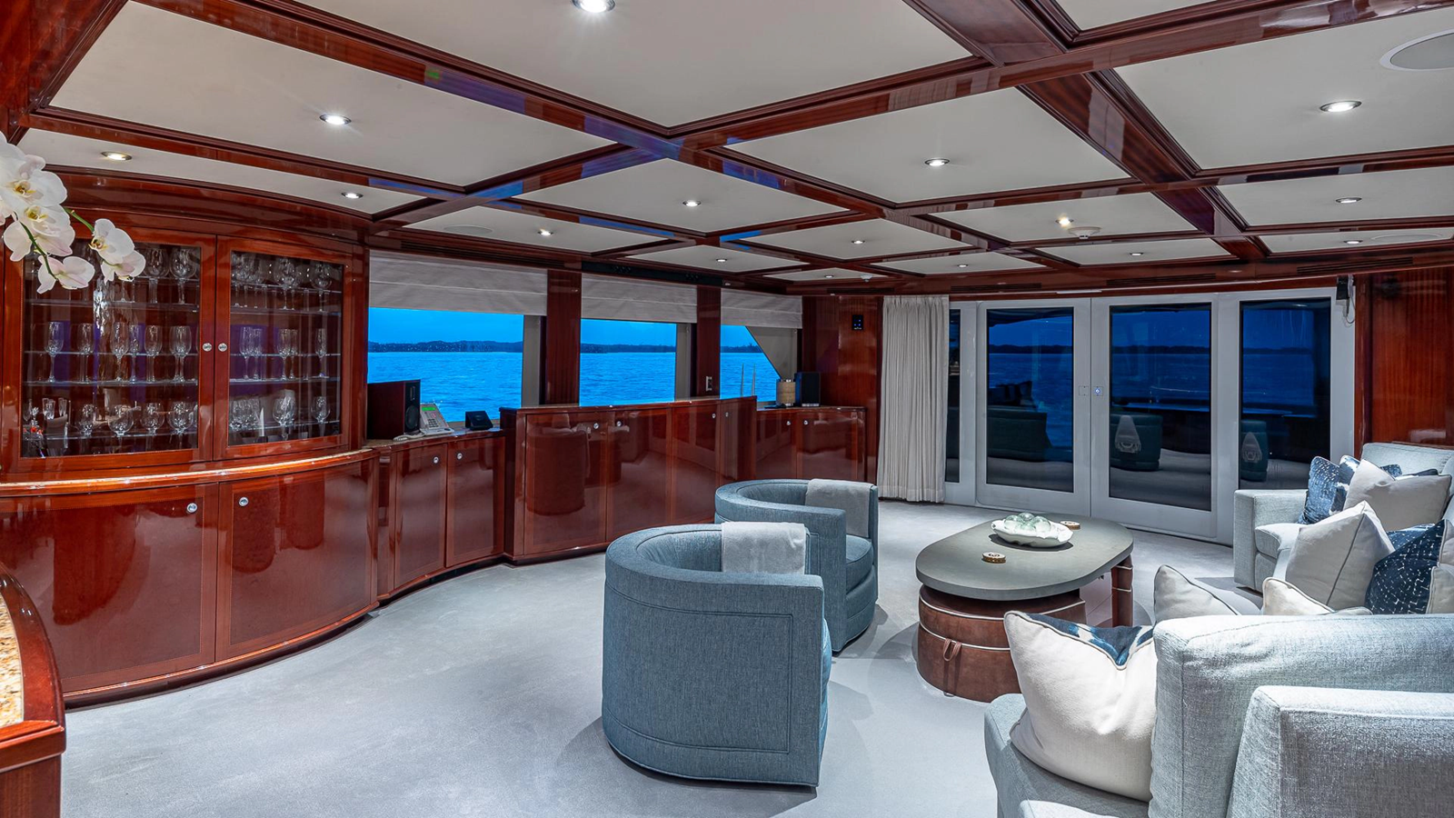 Moving forward of the salon, guests enter an equally well-appointed dining room. The table seats eight, but can be expanded for up to 12 guests. There is plenty of high gloss cabinetry lining the forward bulkhead, and side walls, to store the linens, silver and other dining utensils. Beautiful back-lit glass cabinets to either side of the space, highlight the collection of fine crystal.