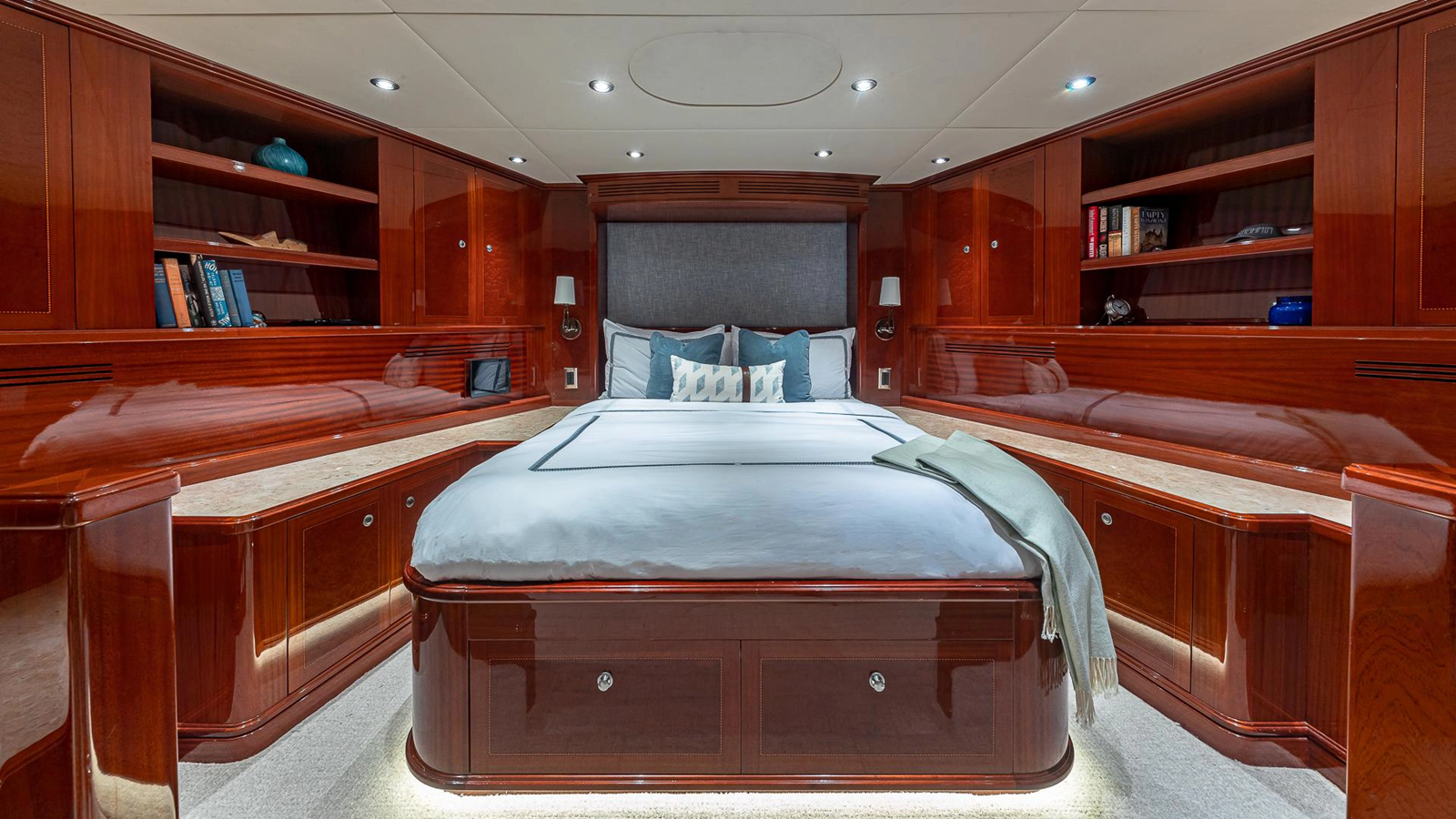Below deck are five, beautifully appointed guest staterooms, all with ensuite baths, access to the Kaleidescape entertainment system, and wifi. In the lower foyer, aft, are two identical king-bed cabins, named the "Freeport" and "Nassau" cabins. Forward of them, to starboard, is a generously sized laundry room. To port are two smaller cabins, named the "Bimini" and "Exuma" cabins. One sleeps three, while the other sleeps two, utilizing Pullman beds. All the way forward is the VIP "Andros" cabin. It features a queen-sized bed forward, with a generous sitting room aft.