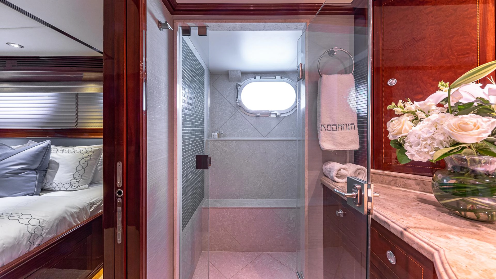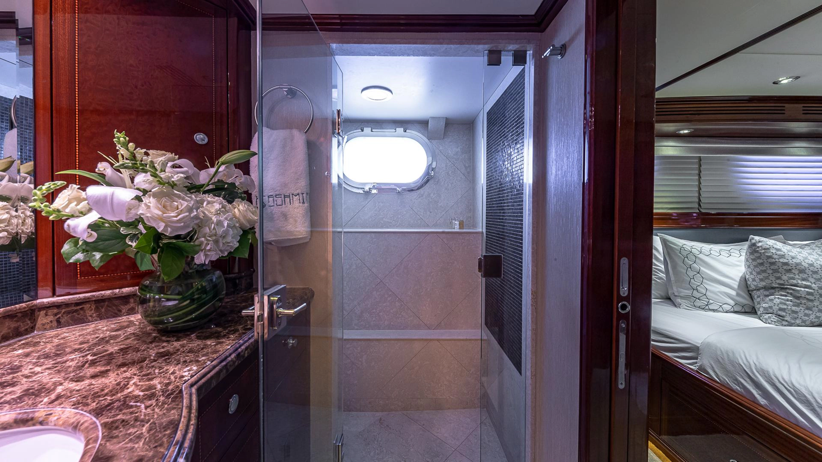As guests enter the main salon, one is struck by the cozy, yet spacious area for lounging. The beautiful interior designed by Pavlik Yacht Design, was handcrafted by Genesis Yachtline in Viareggio, Italy, and shipped to the US for installation. Guests will appreciate the rich interior features, such as Botticino stone with mosaic borders, which highlight Italian high gloss furniture and luxurious silk and chenille fabrics. With a large sofa, and two more spare dining chairs, the area comfortably seats eight. There is also a large screen TV, plenty of cabinet space for linen and crystal storage, and a rich mahogany inlay on the ceiling.