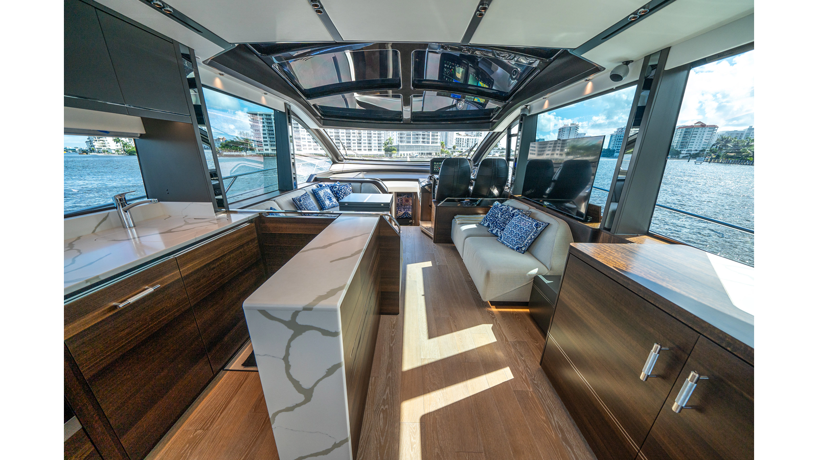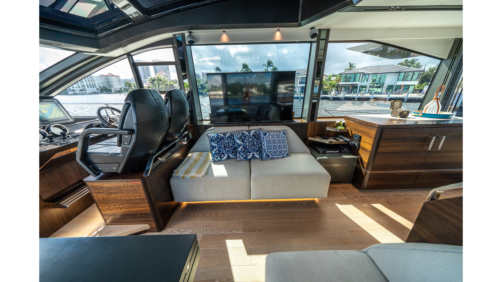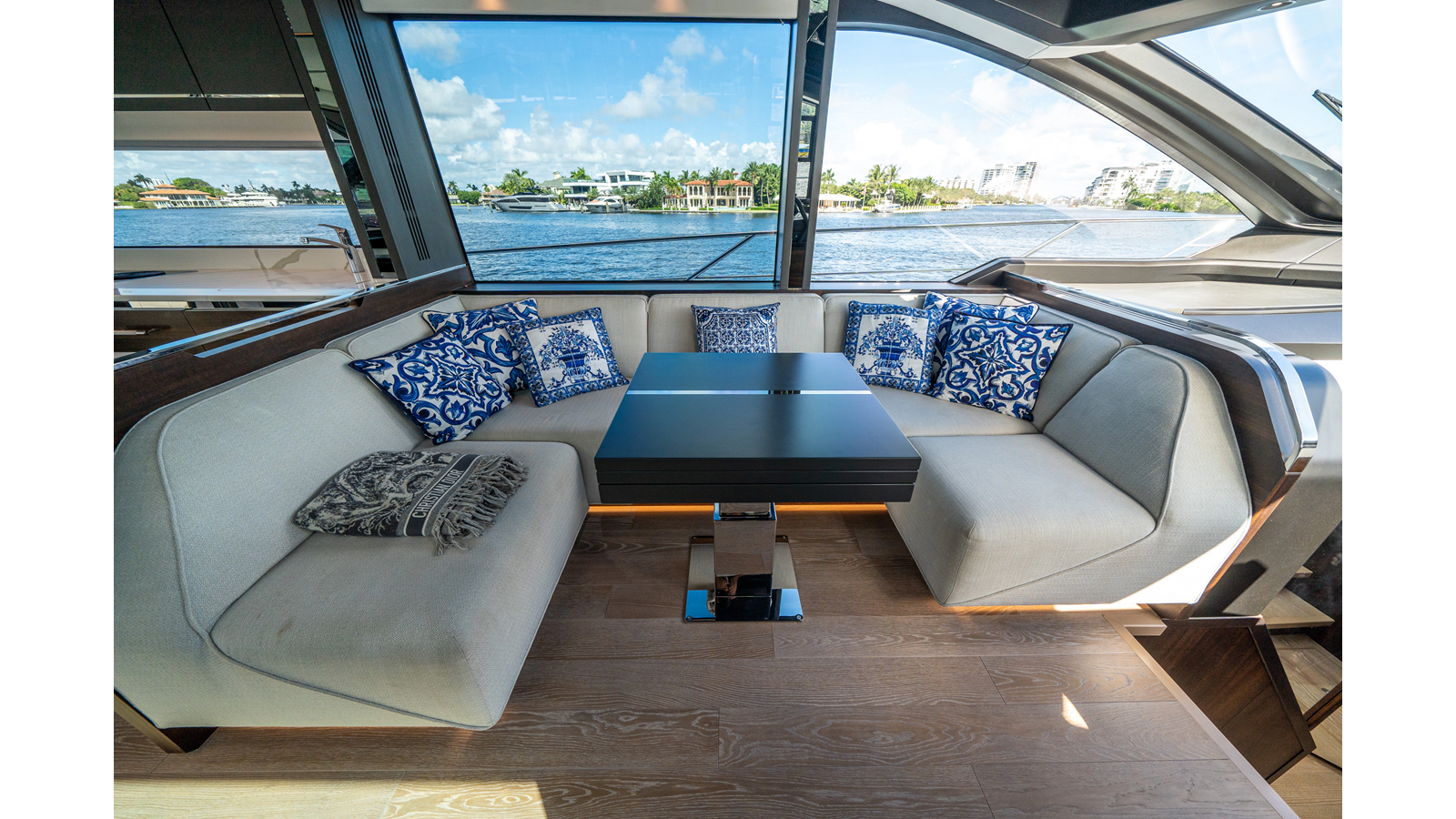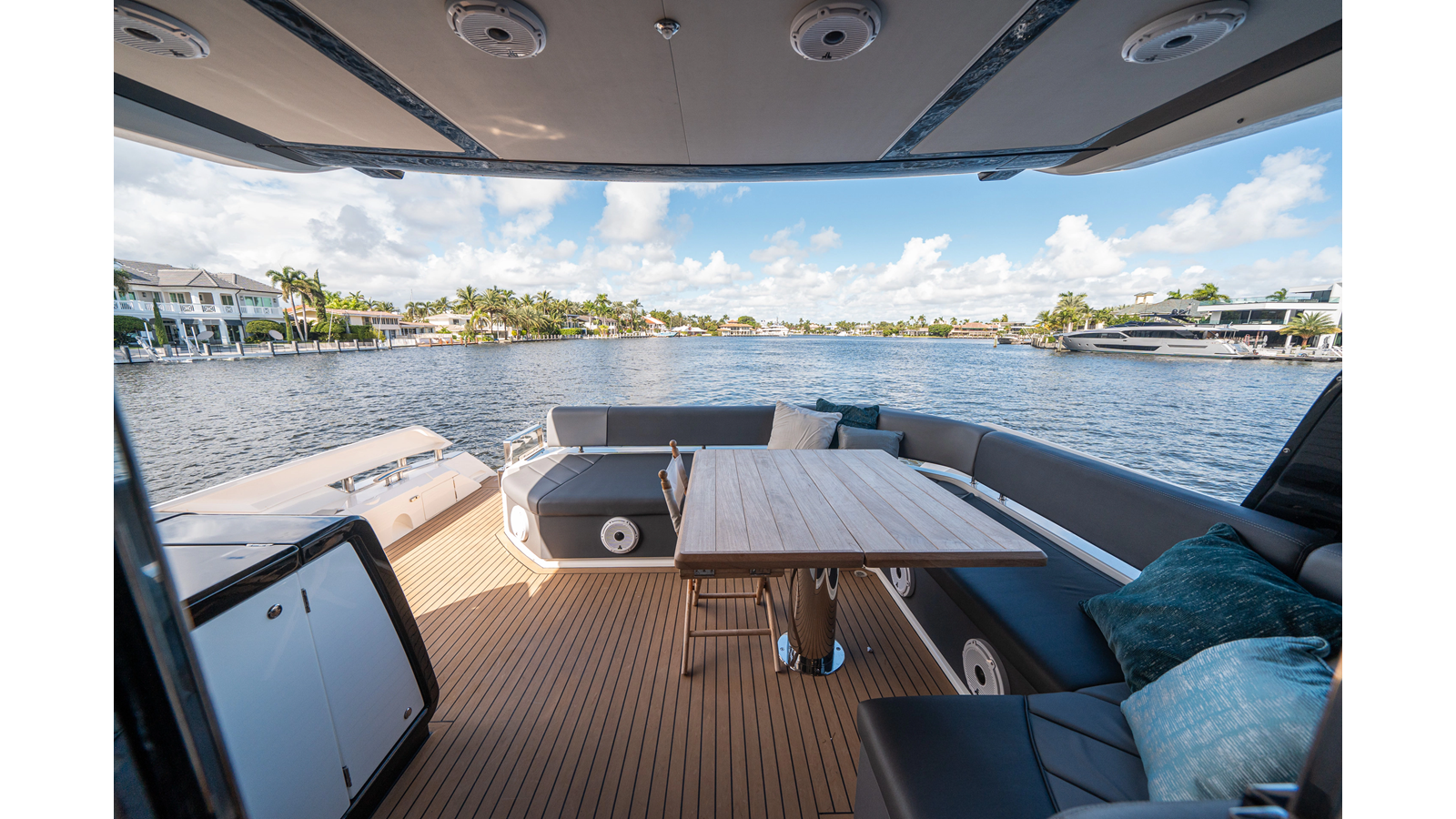 - Upgraded audio system featuring 16 JL Audio M6 speakers throughout bow, stern, and salon, powered by high-output amplifiers