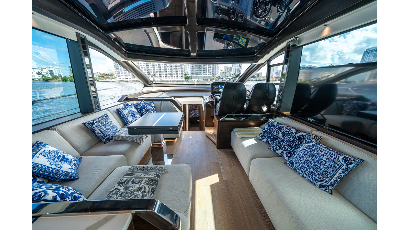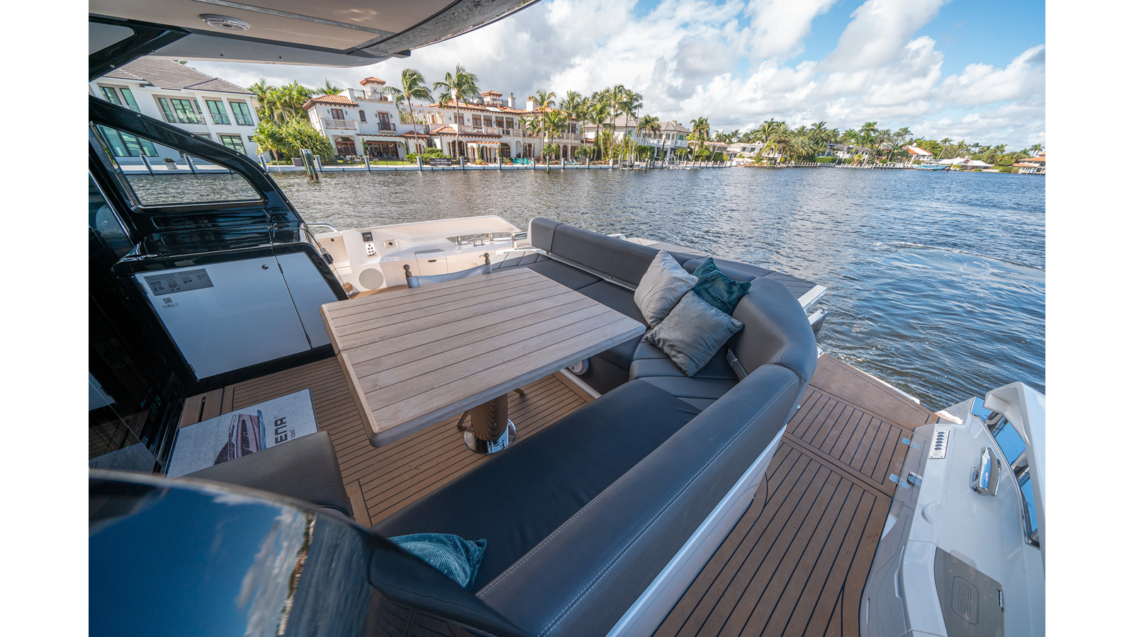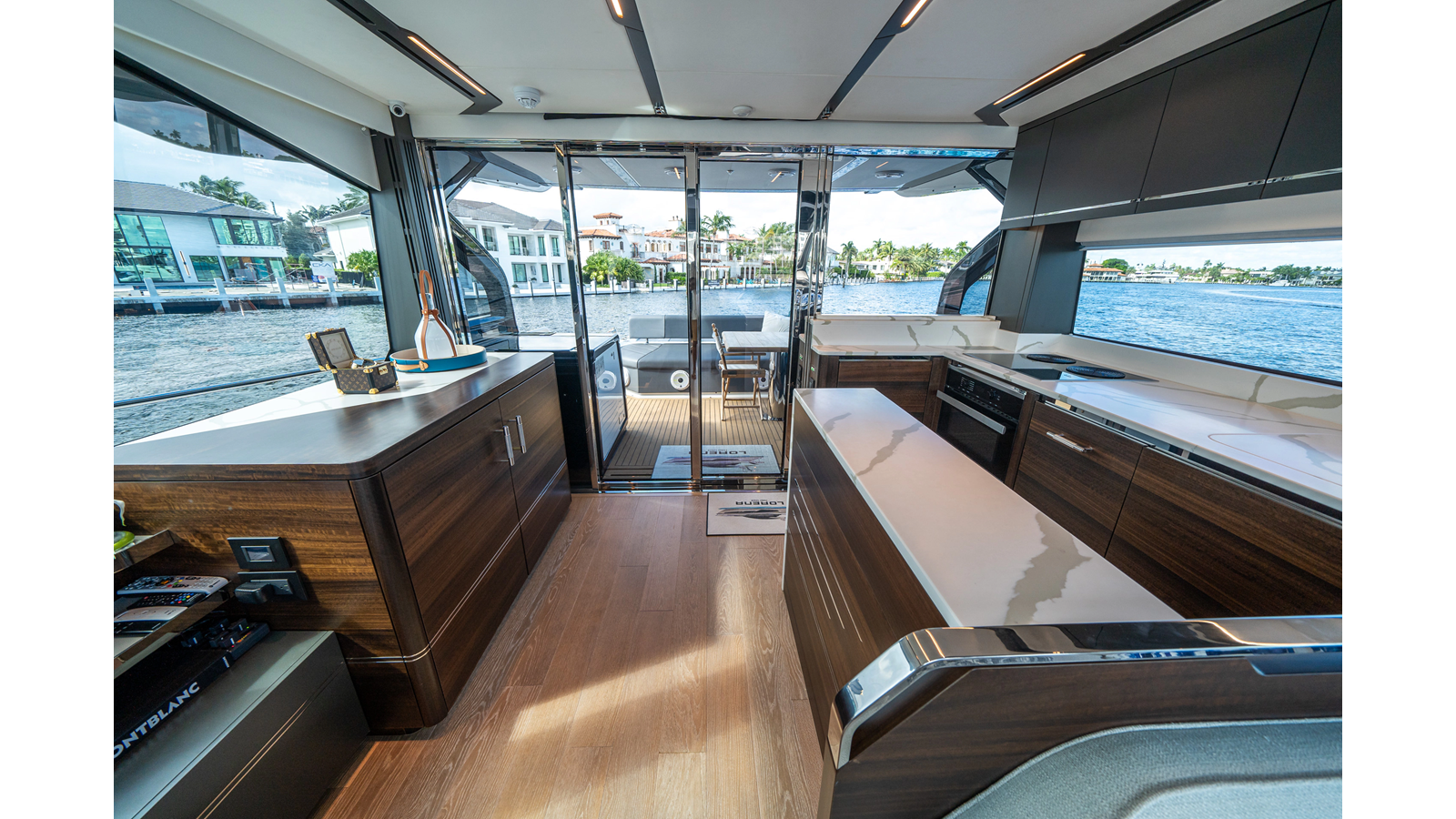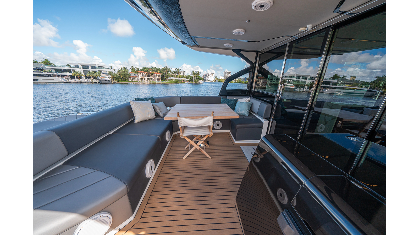 - Upgraded audio system featuring 16 JL Audio M6 speakers throughout bow, stern, and salon, powered by high-output amplifiers