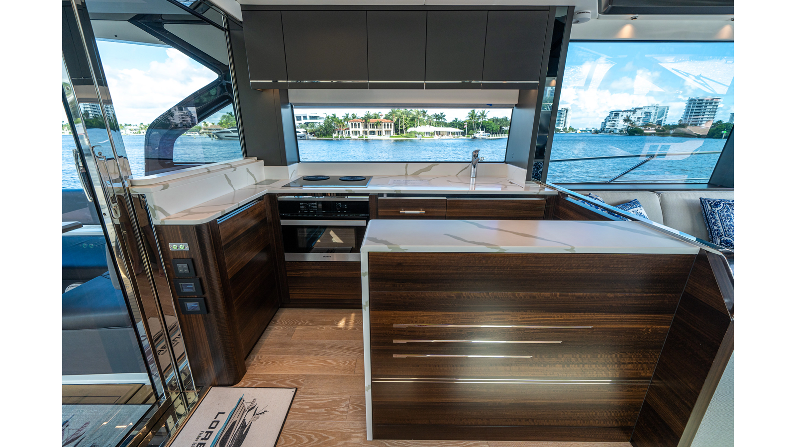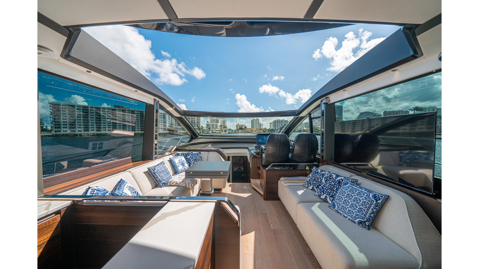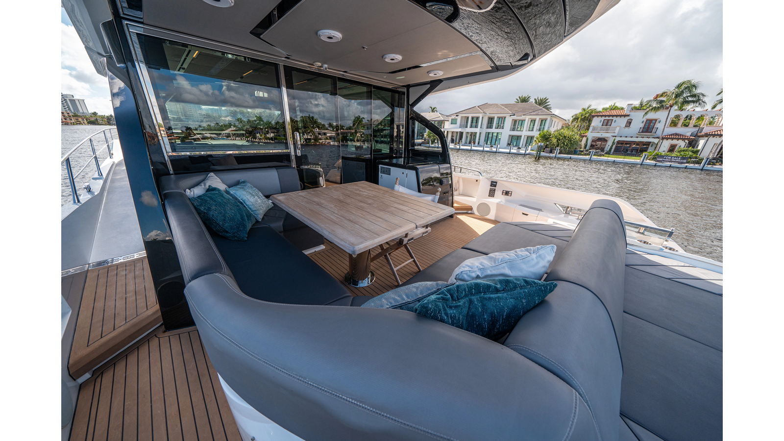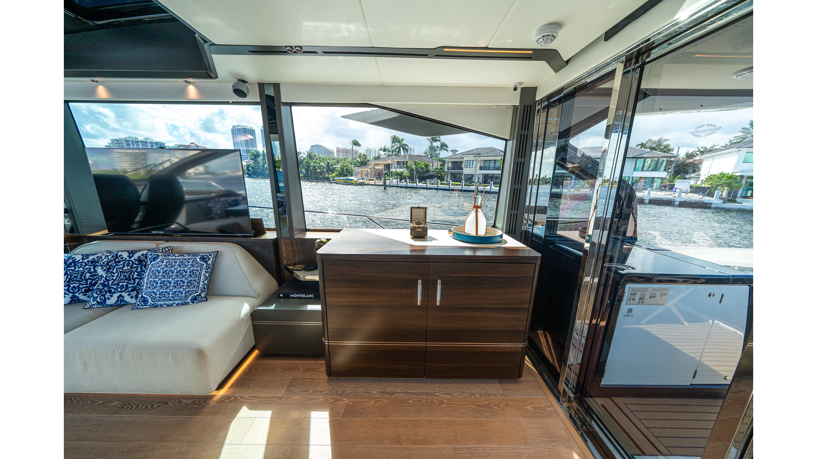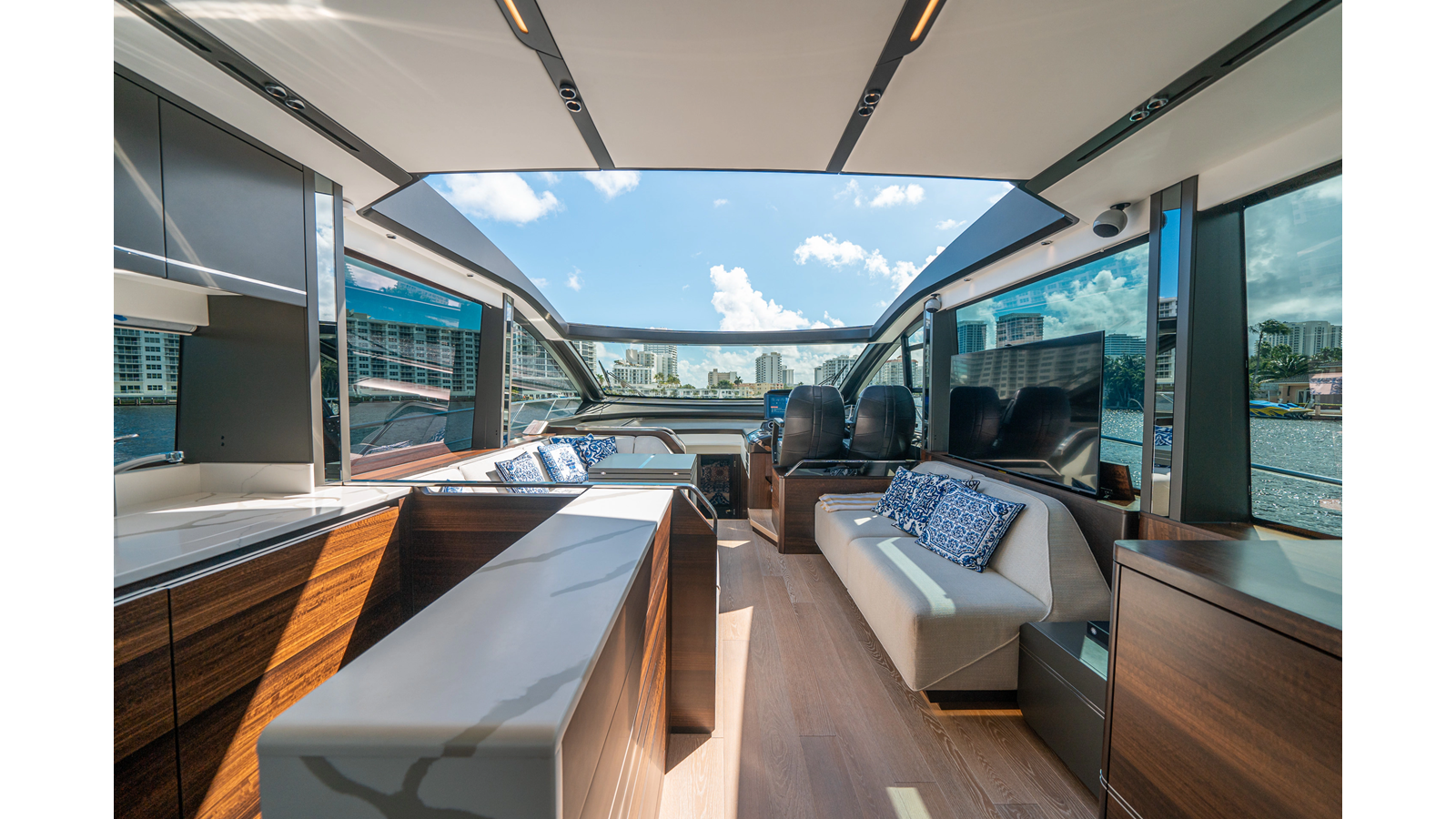 - Upgraded audio system featuring 16 JL Audio M6 speakers throughout bow, stern, and salon, powered by high-output amplifiers