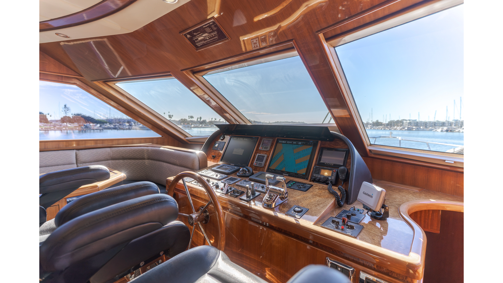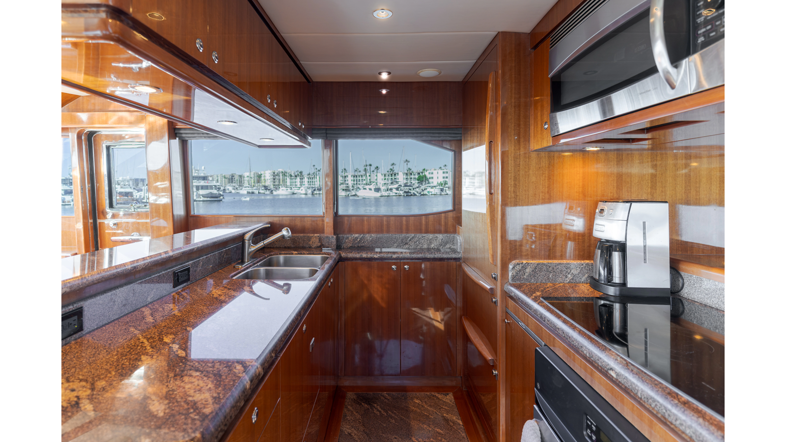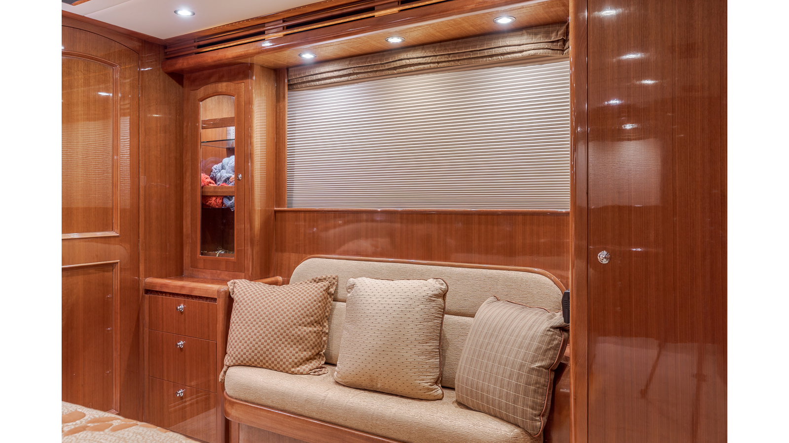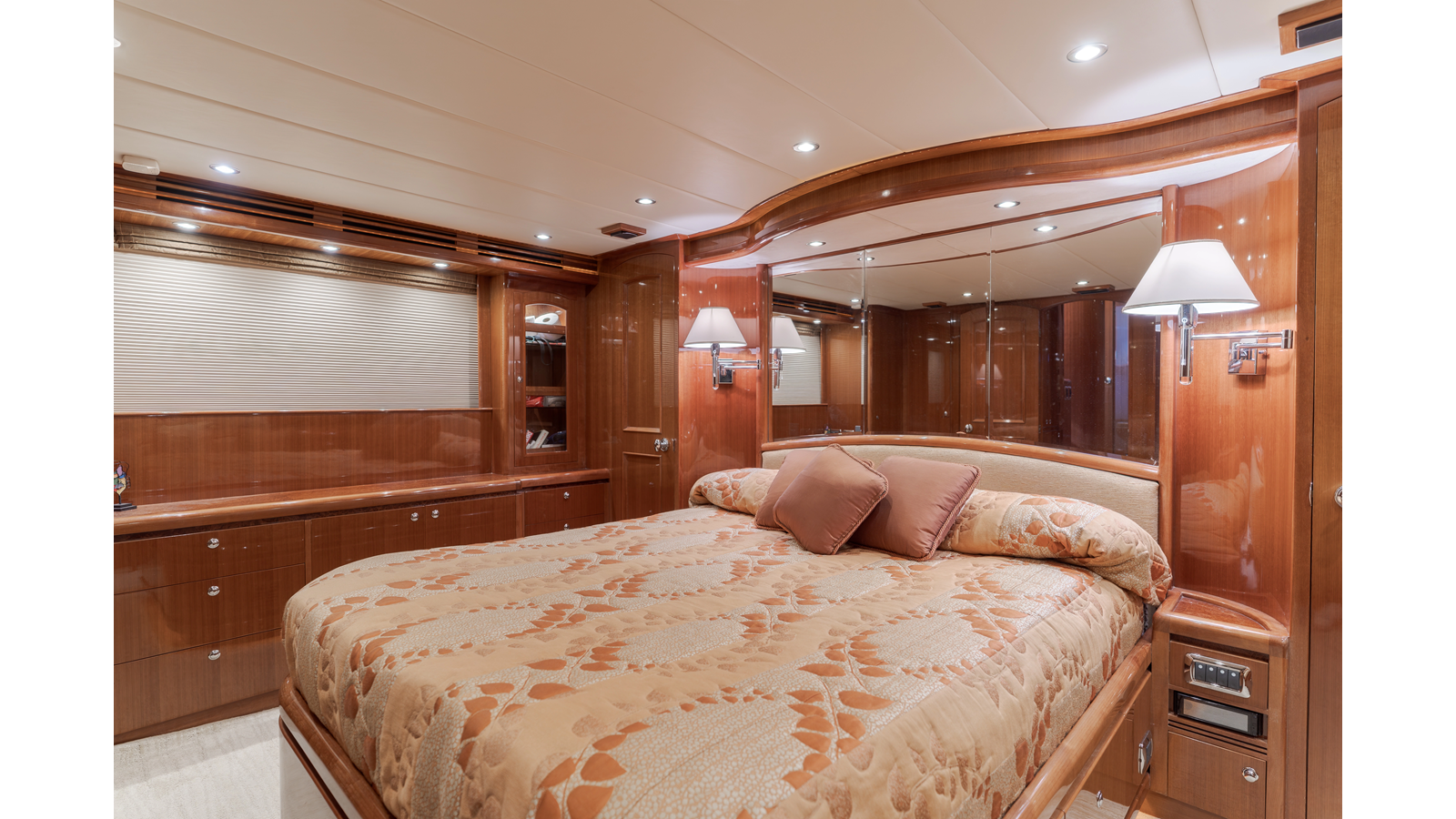 High-gloss finish African Makore cherry wood paneling and cabinetry with redwood burl inlay
