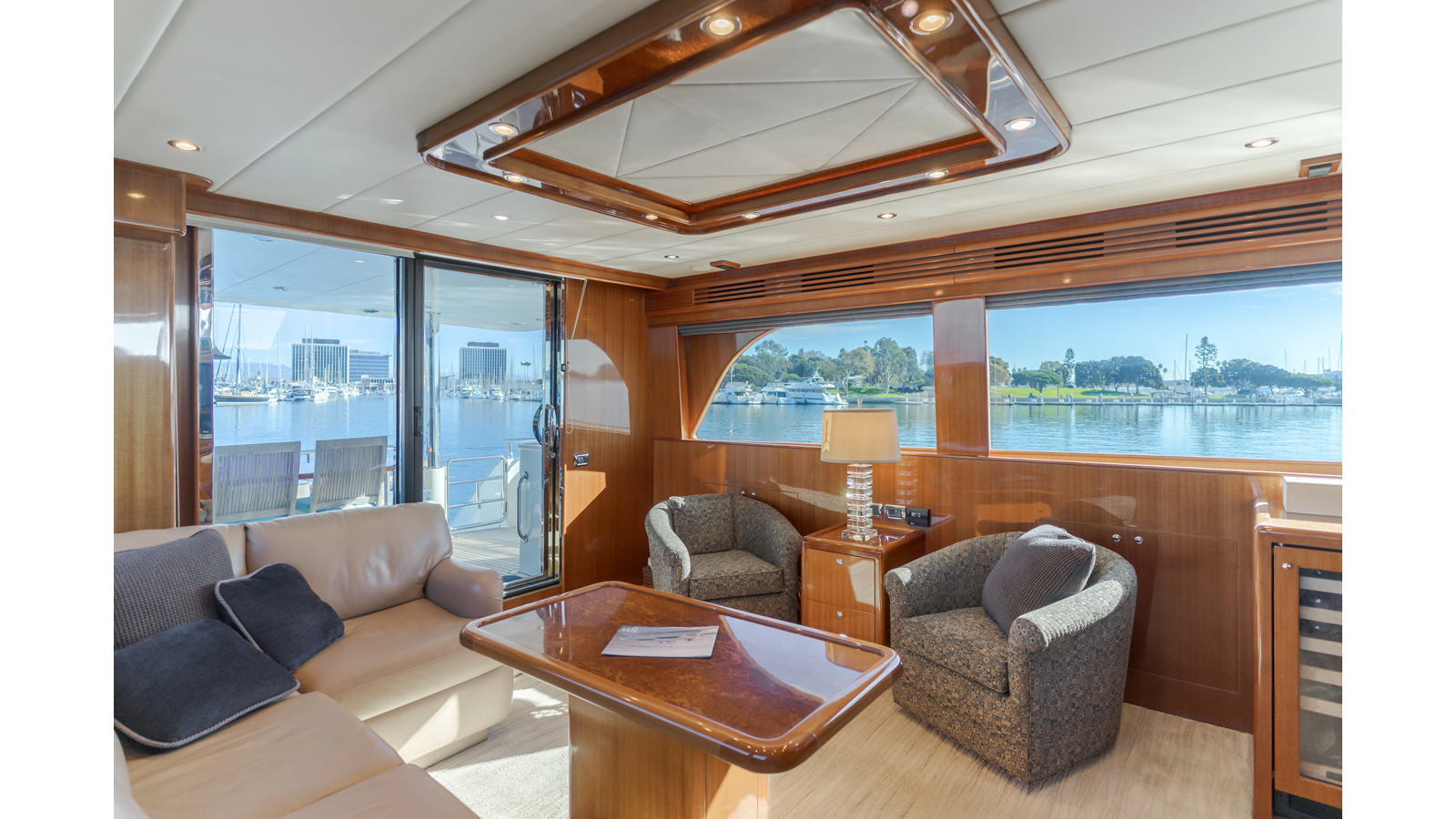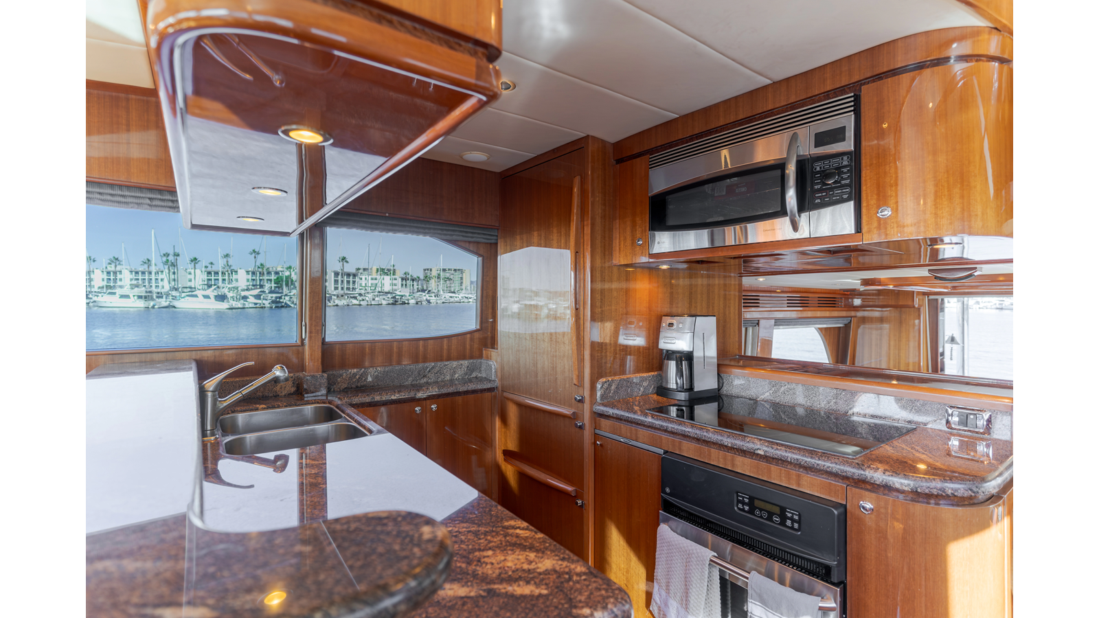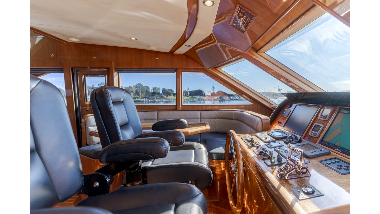 High-gloss finish African Makore cherry wood paneling and cabinetry with redwood burl inlay