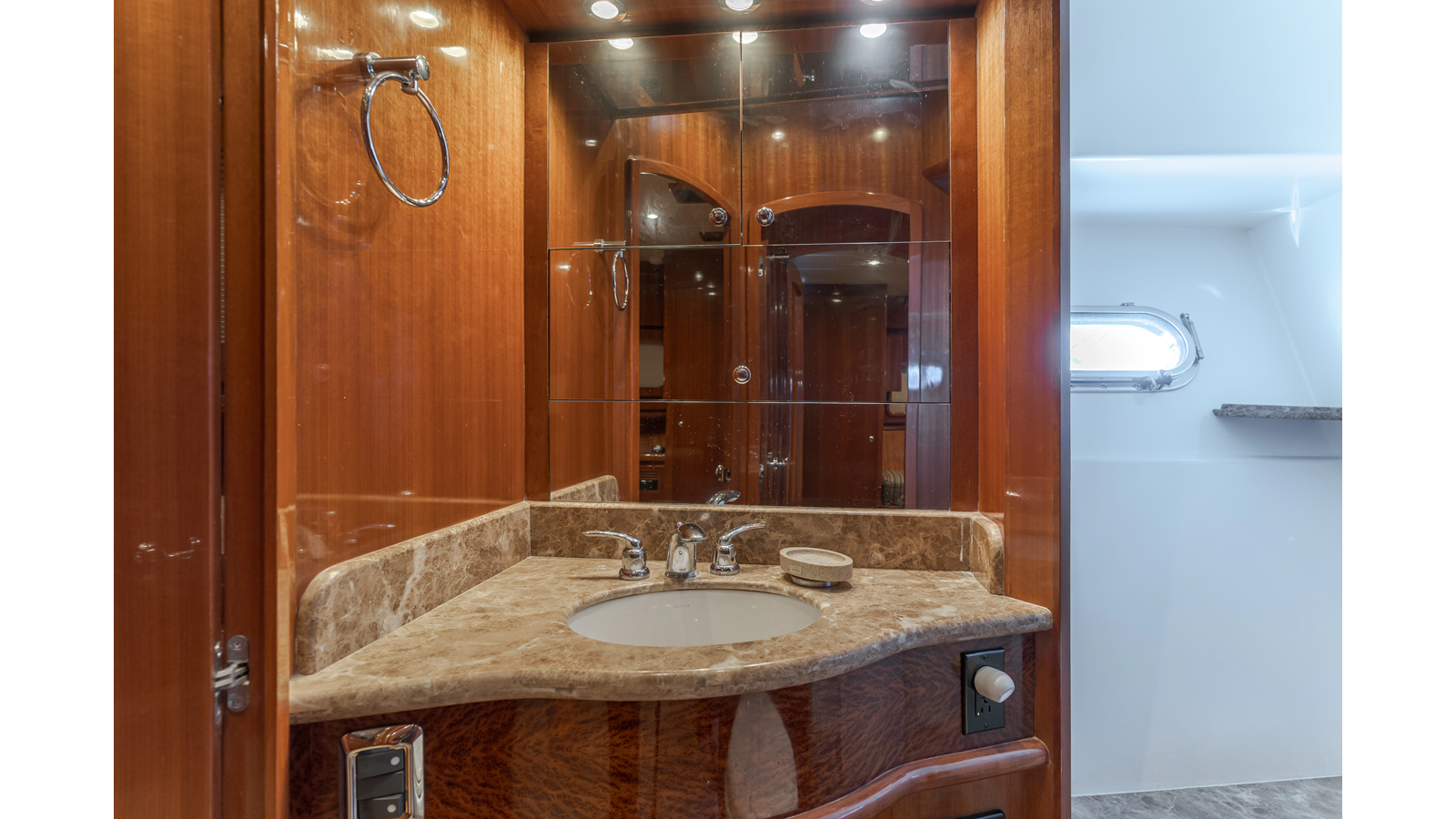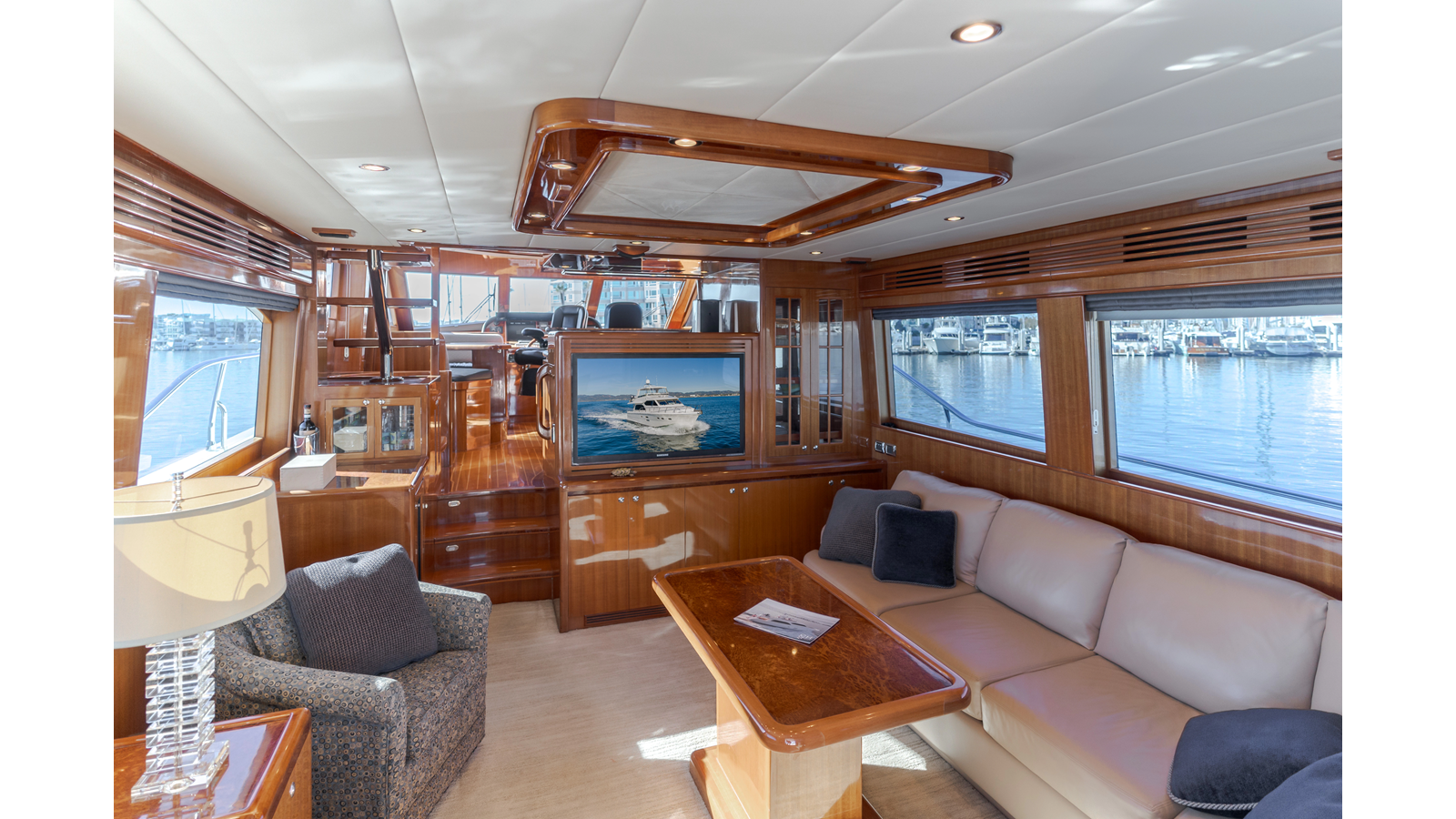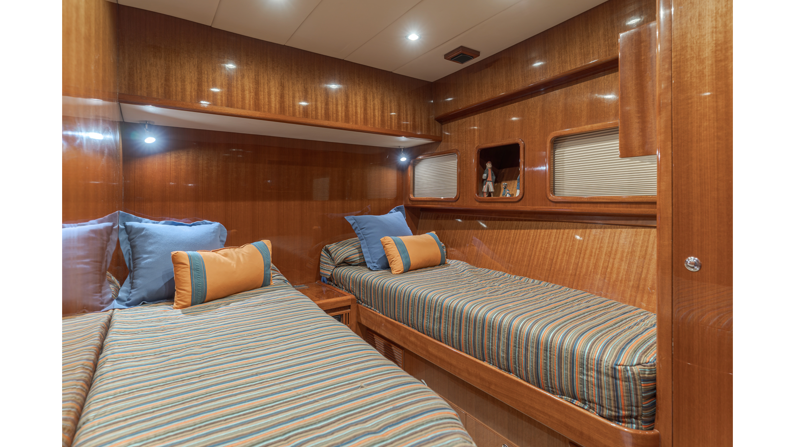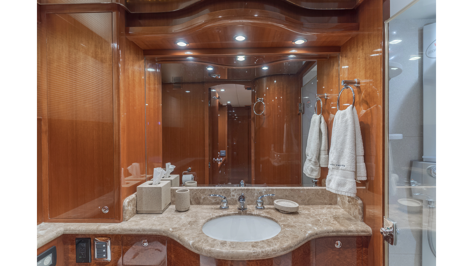 High-gloss finish African Makore cherry wood paneling and cabinetry with redwood burl inlay